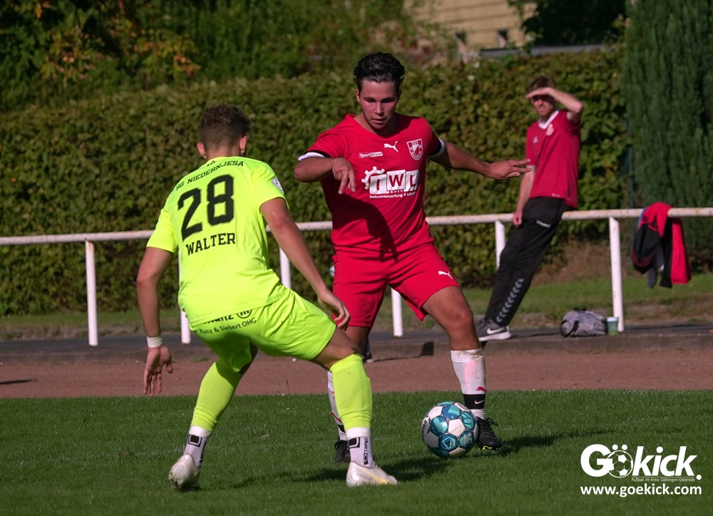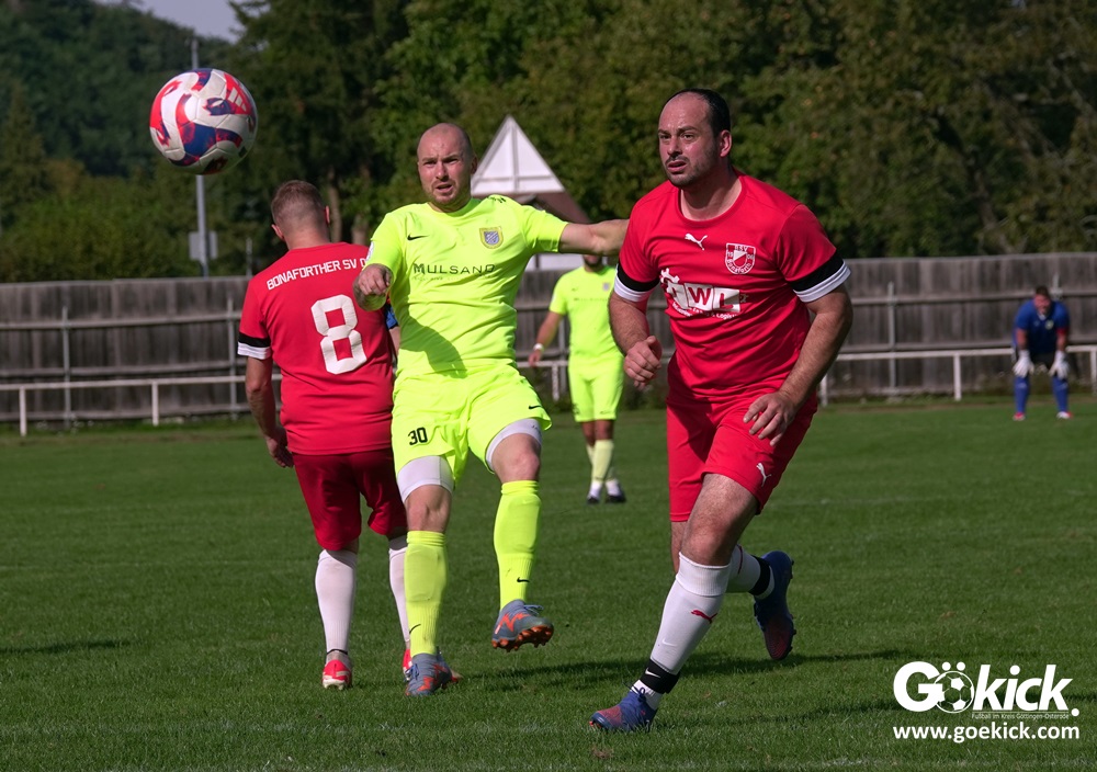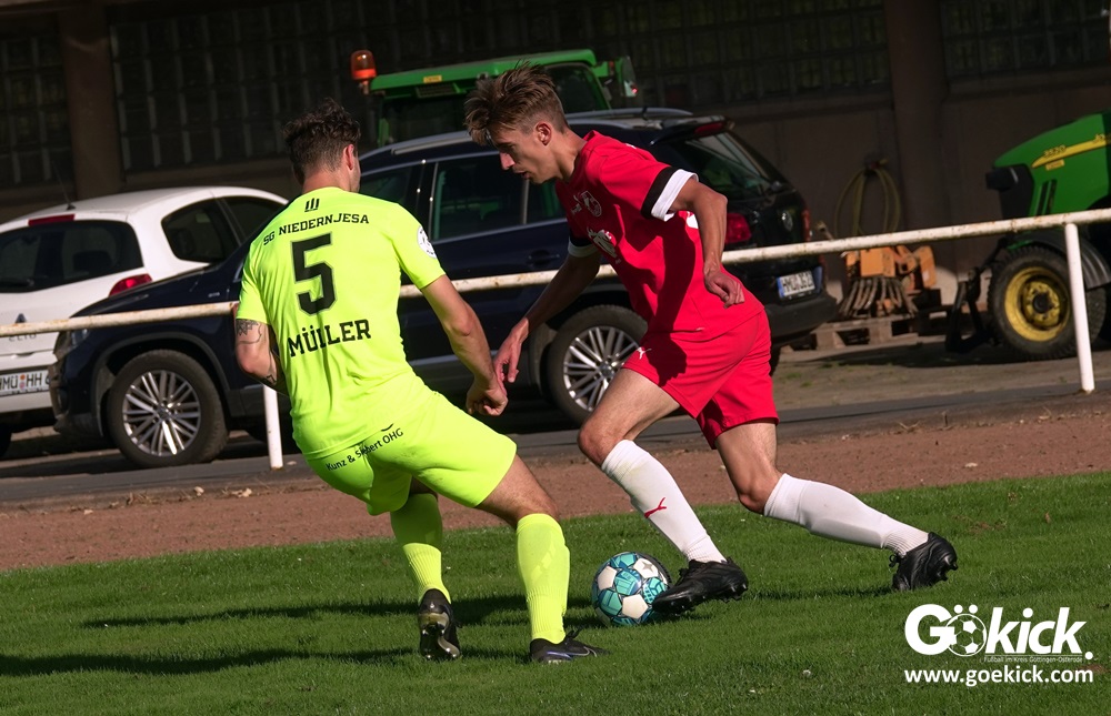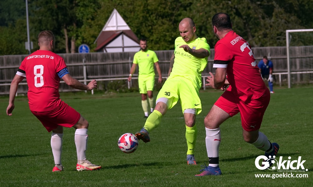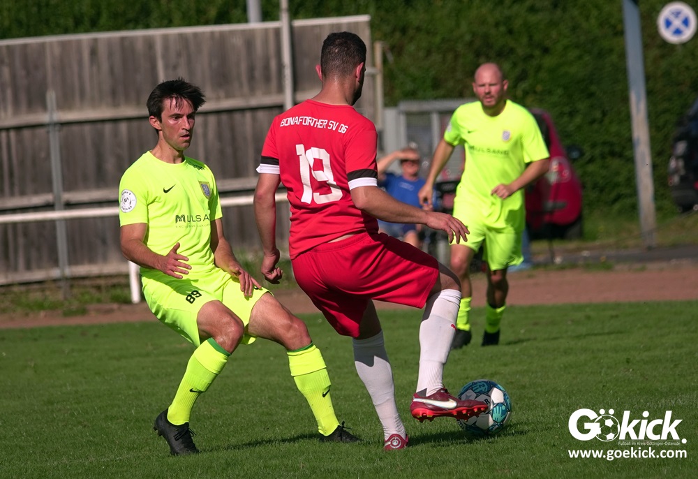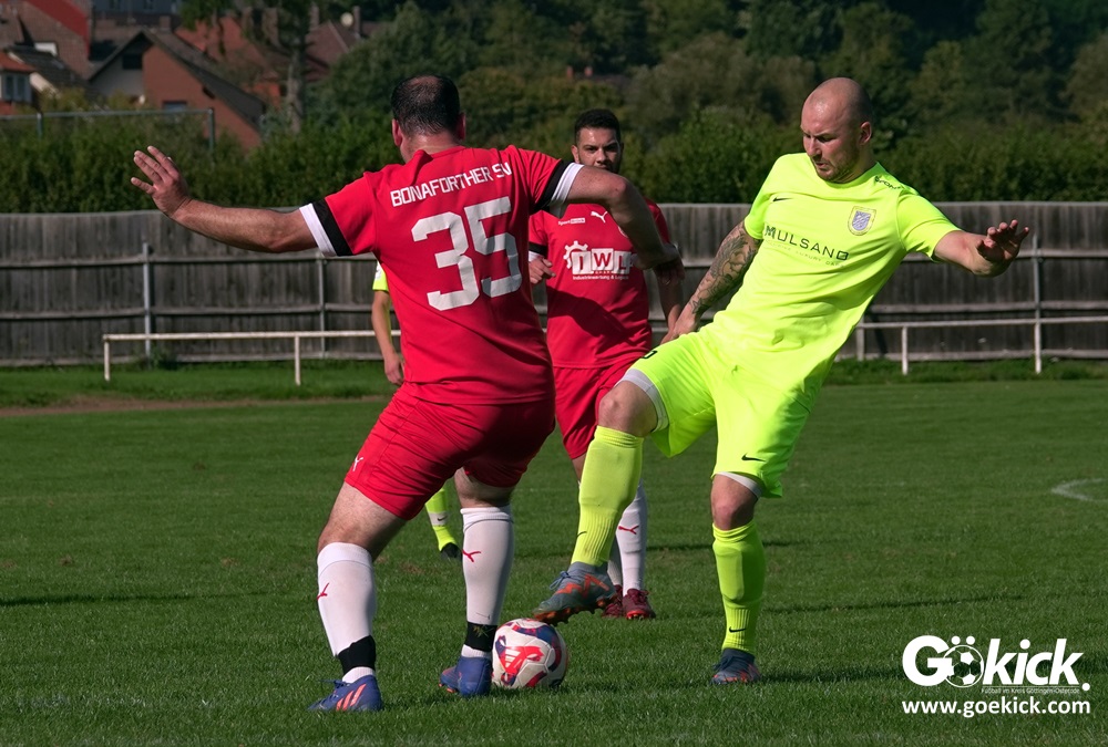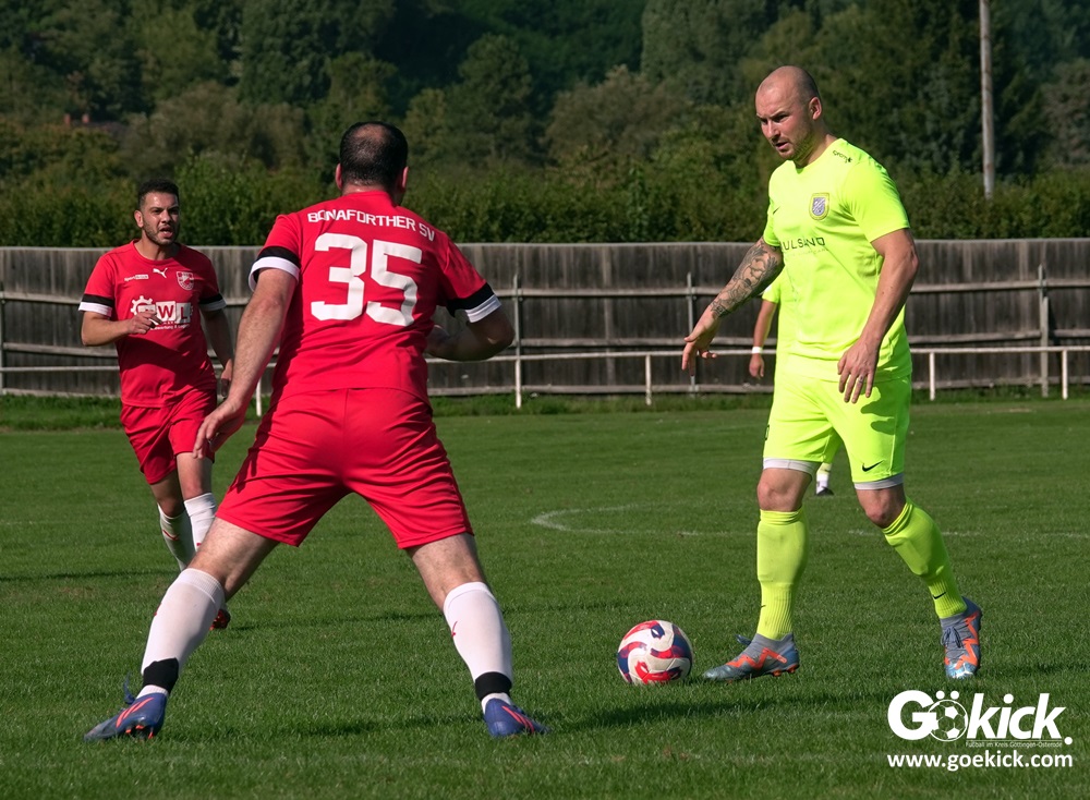 Im Vorjahr unterlag die SG Niedernjesa beim Bonaforther SV noch mit 1:2, damals aber auf dem gerade sanierten Sportplatz in Bonaforth. Diese Niederlage war der Tiefpunkt der schwachen Rückrunde der SG Niedernjesa, die mit dem undankbaren dritten Tabellenplatz endete. Diesmal, das war der SG Niedernjesa anzumerken, wollten die Spieler eine solche Pleite vermeiden. Doch nach sechs Minuten musste der Gast zuerst einmal einen Rückstand verkraften. Julian Bonic kam am Strafraum vor SGN-Schlussmann Dominick „Latscho“ Theune zum Abschluss und ließ diesem bei seinem Flachschuss keine Abwehrchance. Wütende Angriffe folgten, Bonaforths Schlussmann Michael Trapp stand fortan im Fokus des Geschehens. Das 1:1 war ein Geniestreich des ehemaligen SVG-Spielmachers Josú De las Héras Vicuña: Sein Freistoß praktisch von der linken Grundlinie landete im langen Winkel in den Maschen der Hausherren (17.). Mit dem 1:1 wurden die Seiten gewechselt.