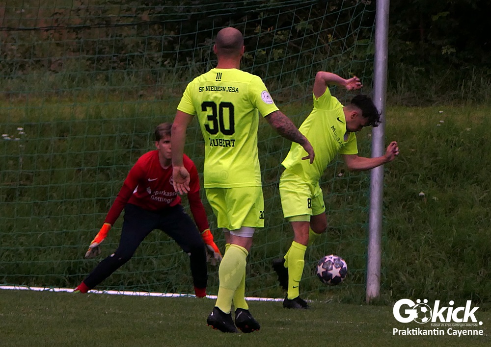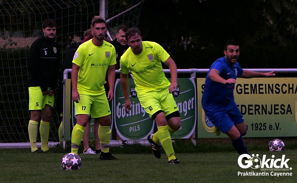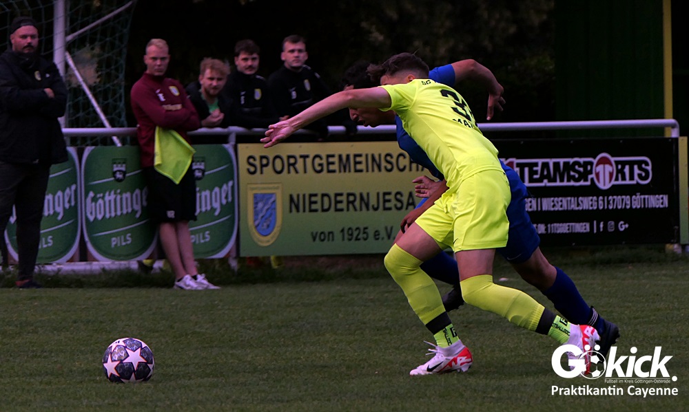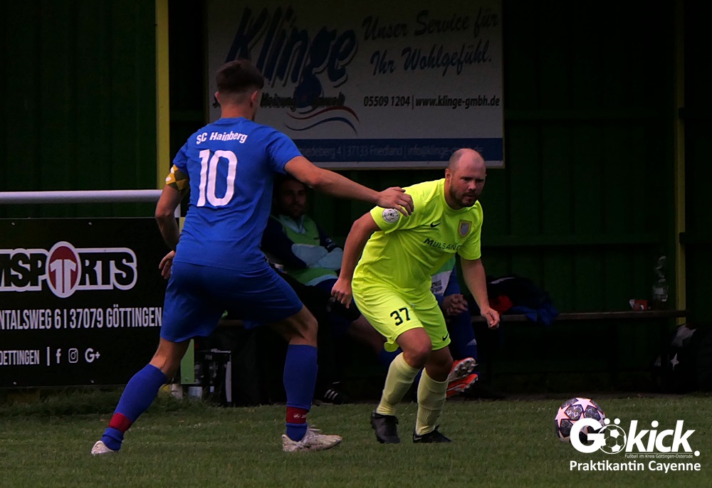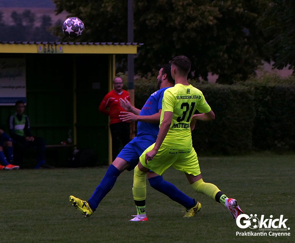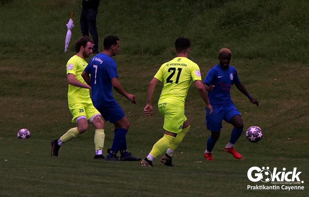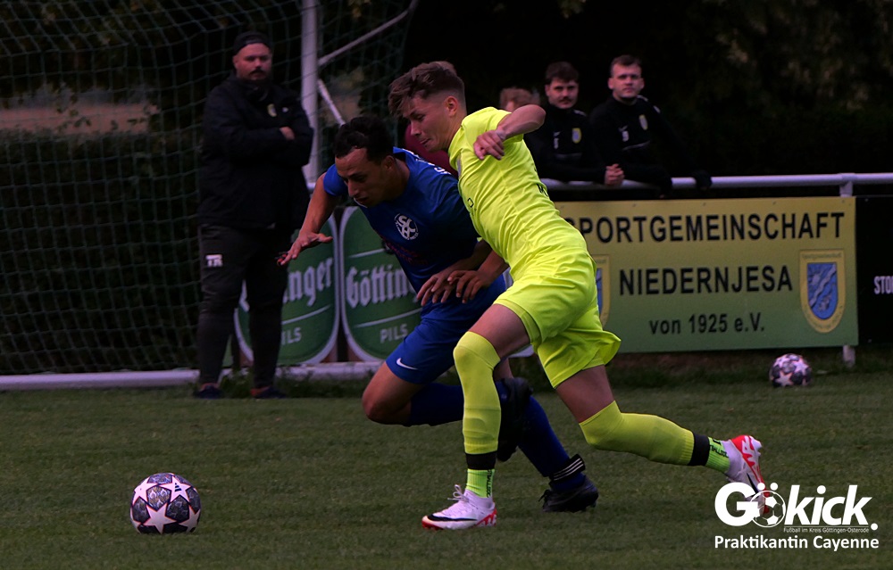 Dunkle Regenwolken zogen auf, als die beiden Mannschaften das Spiel begannen. Der Regen setzte aber erst in der zweiten Halbzeit ein. Die Gastgeber bestimmten das Spiel, hatten aber Mühe, sich durch die Reihen der sich tapfer wehrenden Hainberger zu kombinieren. Zudem vergaben die Offensiv-Kräfte die wenigen, sich bietenden Möglichkeiten teilweise kläglich. Und hinter der Gäste-Abwehr stand mit Justus Mühlhausen ein starker Schlussmann, der zwei Großchancen der Hausherren vereitelte. Die Zuschauer auf dem Sportplatz in Niedernjesa, so sie das Heimteam unterstützten, waren mit dem 0:0 beim Seitenwechsel unzufrieden.