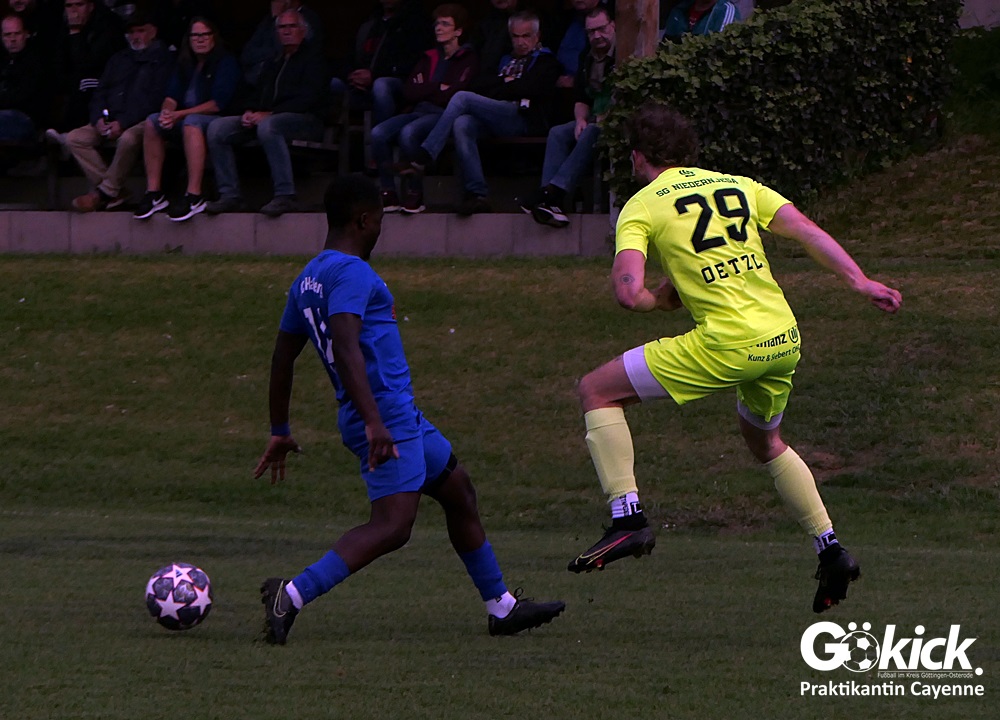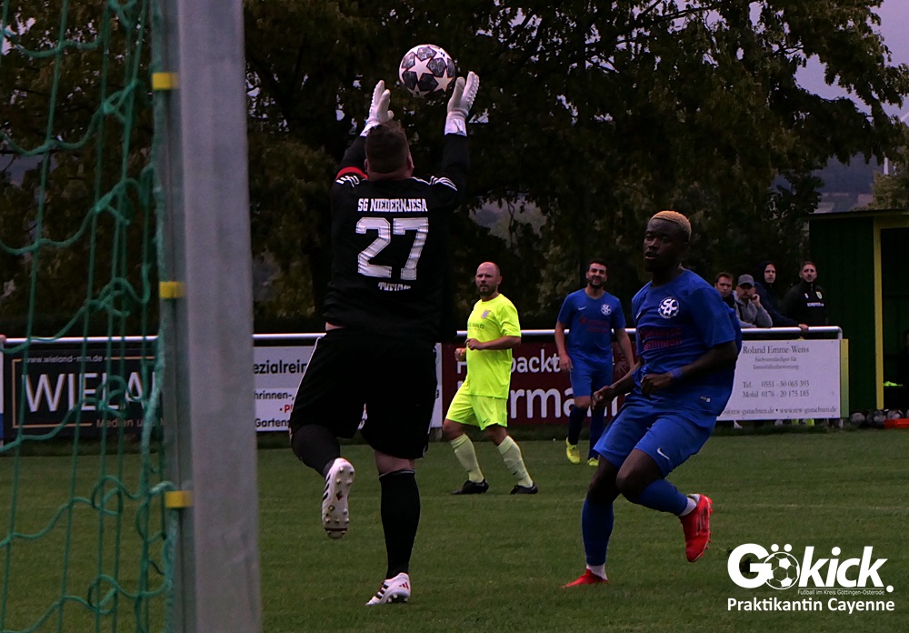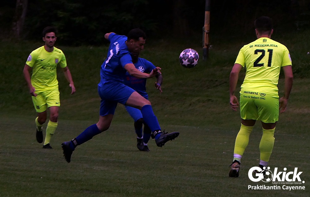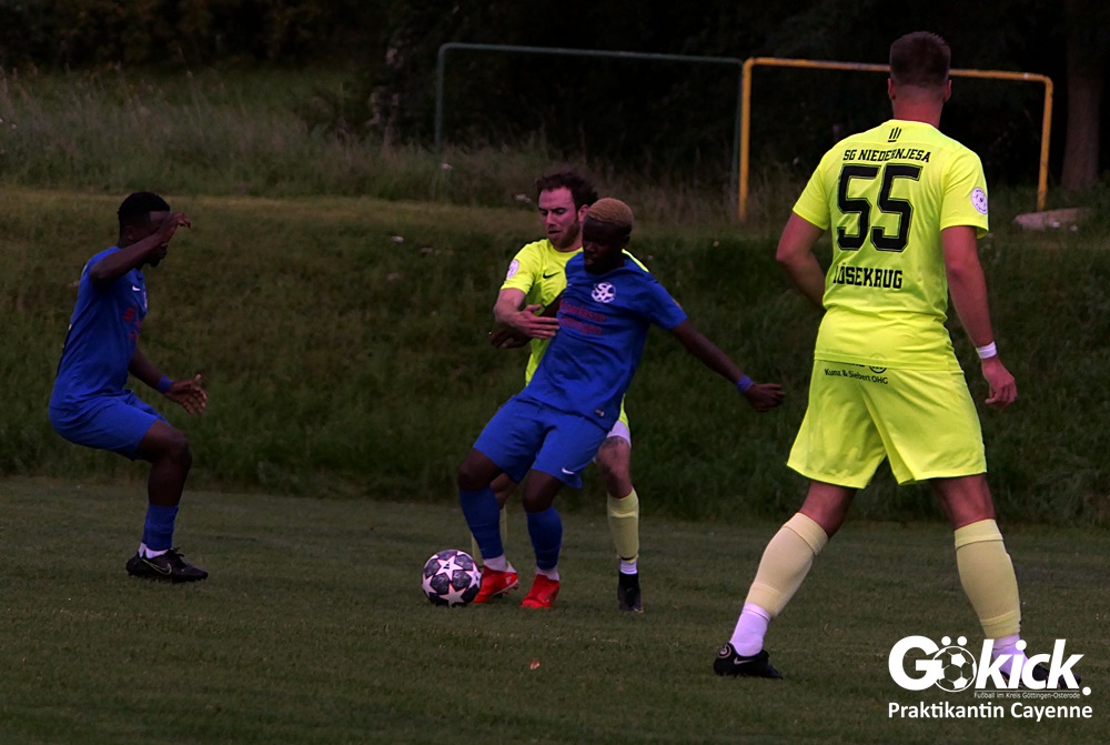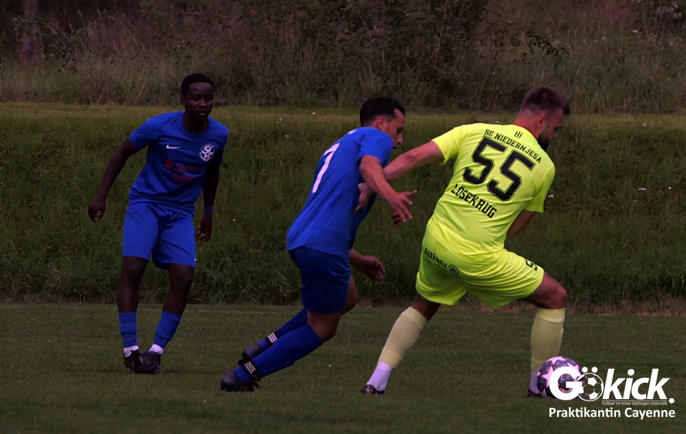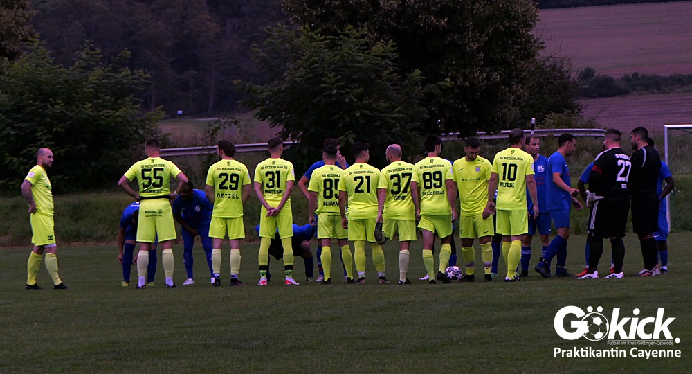 Dunkle Regenwolken zogen auf, als die beiden Mannschaften das Spiel begannen. Der Regen setzte aber erst in der zweiten Halbzeit ein. Die Gastgeber bestimmten das Spiel, hatten aber Mühe, sich durch die Reihen der sich tapfer wehrenden Hainberger zu kombinieren. Zudem vergaben die Offensiv-Kräfte die wenigen, sich bietenden Möglichkeiten teilweise kläglich. Und hinter der Gäste-Abwehr stand mit Justus Mühlhausen ein starker Schlussmann, der zwei Großchancen der Hausherren vereitelte. Die Zuschauer auf dem Sportplatz in Niedernjesa, so sie das Heimteam unterstützten, waren mit dem 0:0 beim Seitenwechsel unzufrieden.