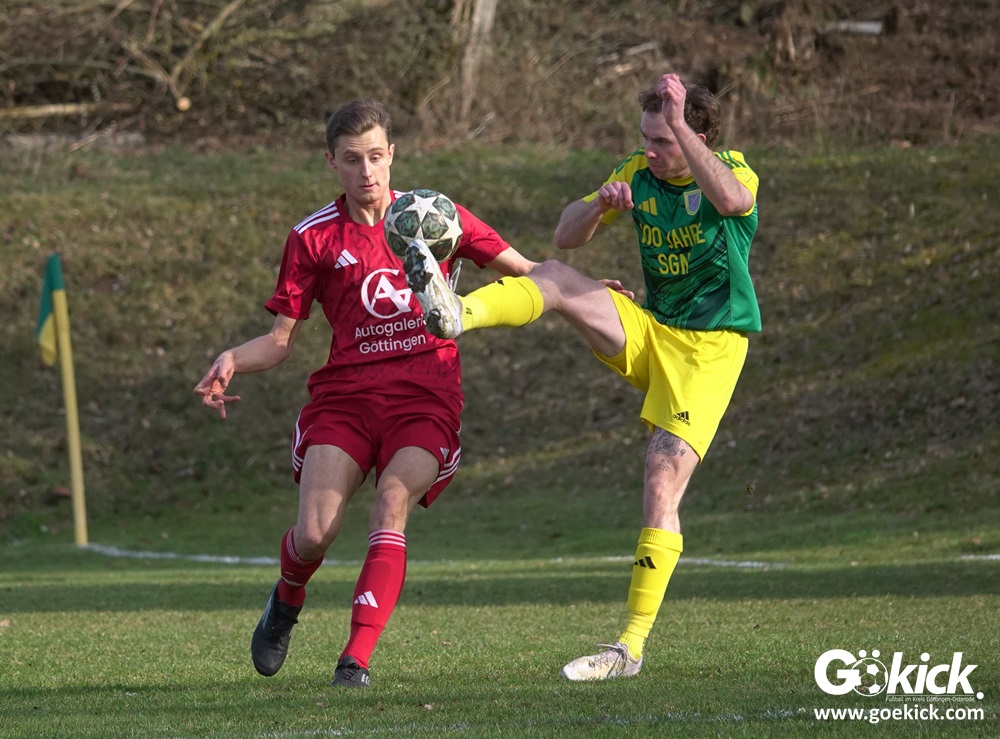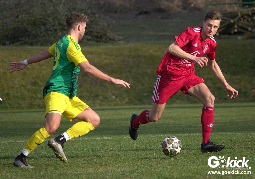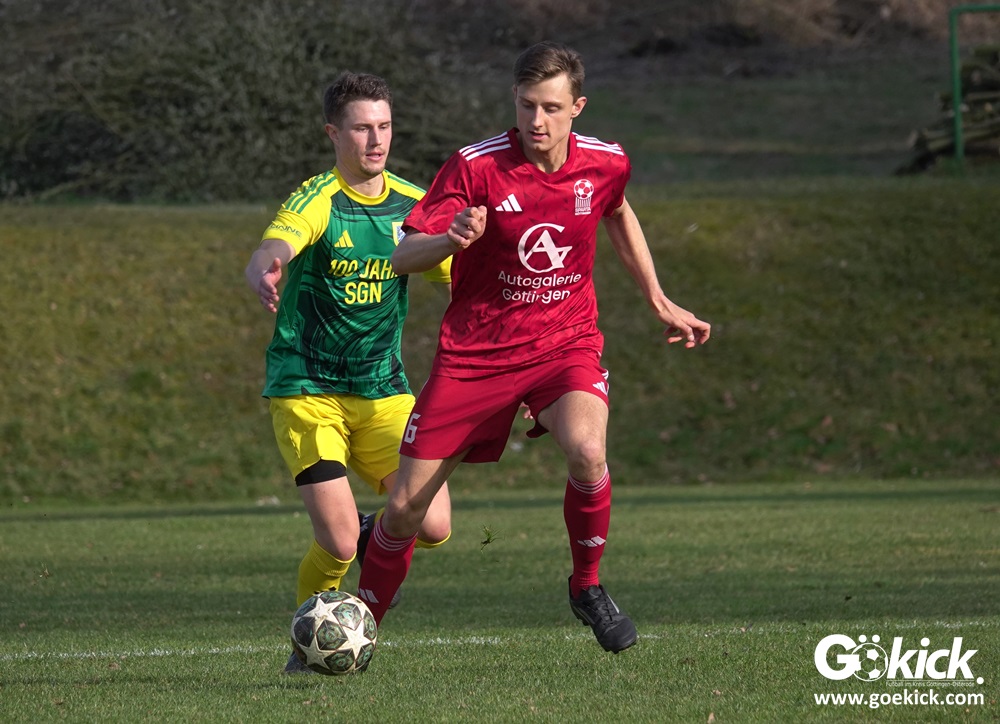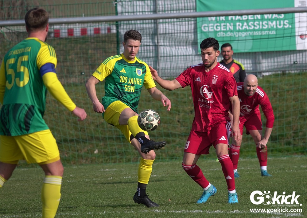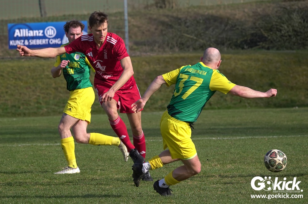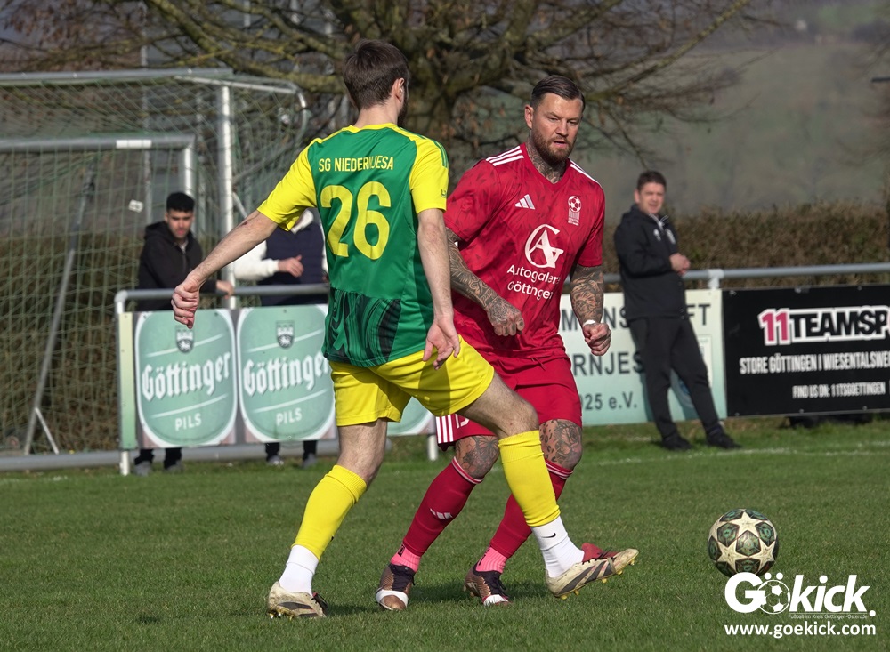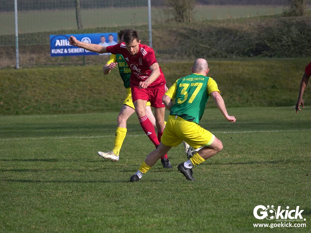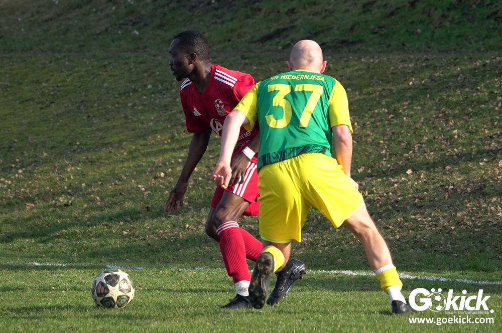 Die Begegnung entwickelte sich anschließend zu einem intensiven und kampfbetonten Spiel, bei dem die Platzverhältnisse eine bedeutende Rolle spielten. Besonders die Gäste hatten Schwierigkeiten, ihr gewohntes Spiel aufzuziehen. Mit der knappen, aber verdienten Führung der SG Niedernjesa ging es schließlich in die Pause, die Schiedsrichter Sebastian Jopp mit dem Halbzeitpfiff einleitete.