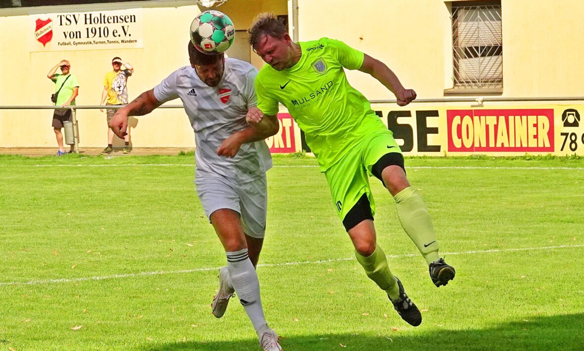 Im ersten Abschnitt waren beide Teams auf Sicherheit eingestellt. Die Zuschauer, die trotz Sommerhitze und wegen eines Reitturniers fehlender Parkplätze den Weg zum Holtenser Sportplatz gefunden hatten, durften nur wenige Strafraumszenen bewundern. Zwei Chancen durch Marcel Heimbüchel besaßen die Gastgeber von Trainer Enrico Weiß, beide vereitelte ein aufmerksamer Dominick Theune im Tor der Gäste. Er fing einst auch für den TSV die Bälle aus der Luft. Die Gäste brachten im ersten Abschnitt nur einmal den Kasten des TSV in Gefahr. Ansonsten sahen die Zuschauer viele verbissen geführte Zweikämpfe und dichtgestaffelte Abwehrreihen. Torlos ging es in die Halbzeitpause. „Wir haben im ersten Abschnitt abwartend reagiert, wussten, dass sie viel mit langen Bällen agieren. Da wollten wir sicher stehen.“, fasst Christian Dreher die erste Halbzeit aus seiner Sicht zusammen.