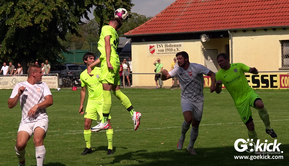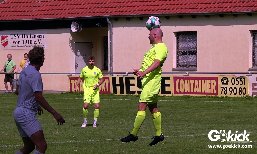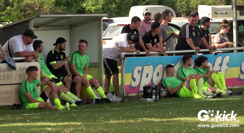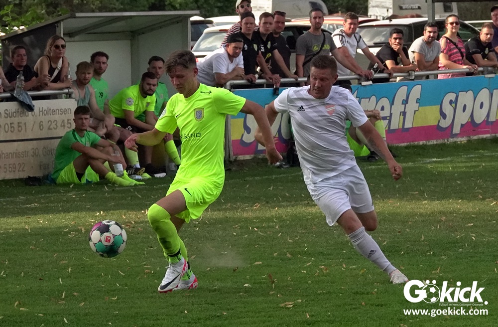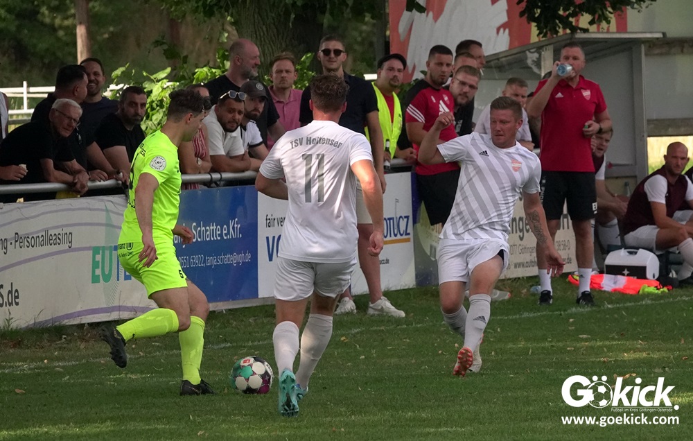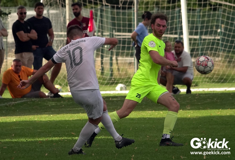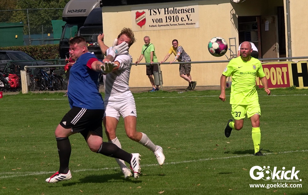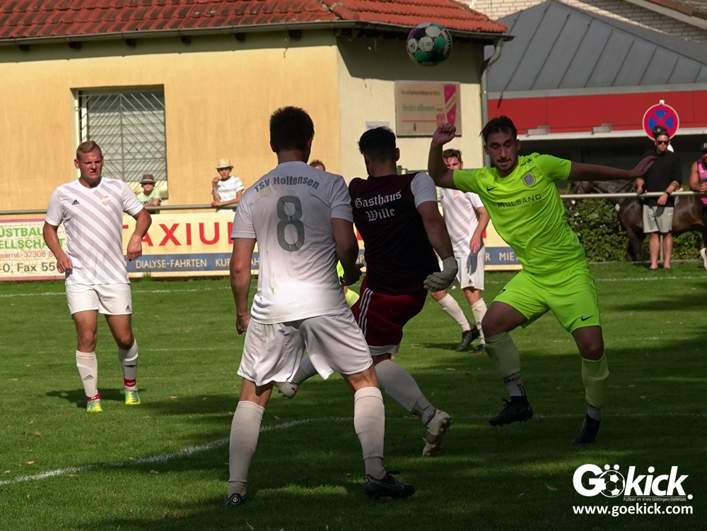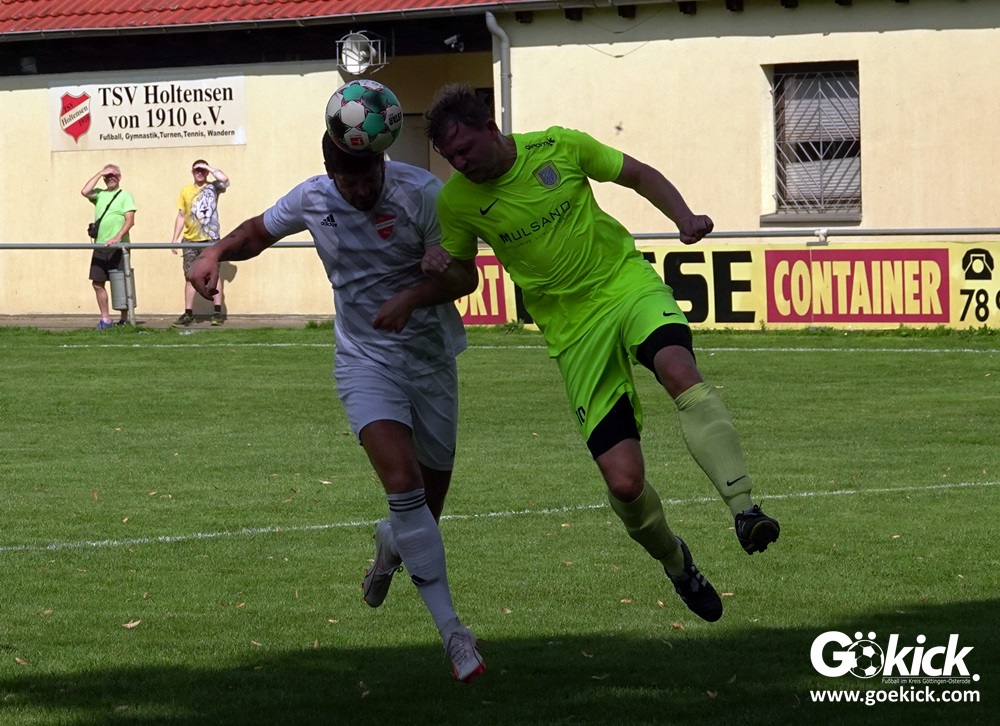 Im ersten Abschnitt waren beide Teams auf Sicherheit eingestellt. Die Zuschauer, die trotz Sommerhitze und wegen eines Reitturniers fehlender Parkplätze den Weg zum Holtenser Sportplatz gefunden hatten, durften nur wenige Strafraumszenen bewundern. Zwei Chancen durch Marcel Heimbüchel besaßen die Gastgeber von Trainer Enrico Weiß, beide vereitelte ein aufmerksamer Dominick Theune im Tor der Gäste. Er fing einst auch für den TSV die Bälle aus der Luft. Die Gäste brachten im ersten Abschnitt nur einmal den Kasten des TSV in Gefahr. Ansonsten sahen die Zuschauer viele verbissen geführte Zweikämpfe und dichtgestaffelte Abwehrreihen. Torlos ging es in die Halbzeitpause. „Wir haben im ersten Abschnitt abwartend reagiert, wussten, dass sie viel mit langen Bällen agieren. Da wollten wir sicher stehen.“, fasst Christian Dreher die erste Halbzeit aus seiner Sicht zusammen.