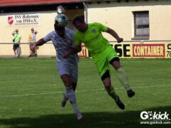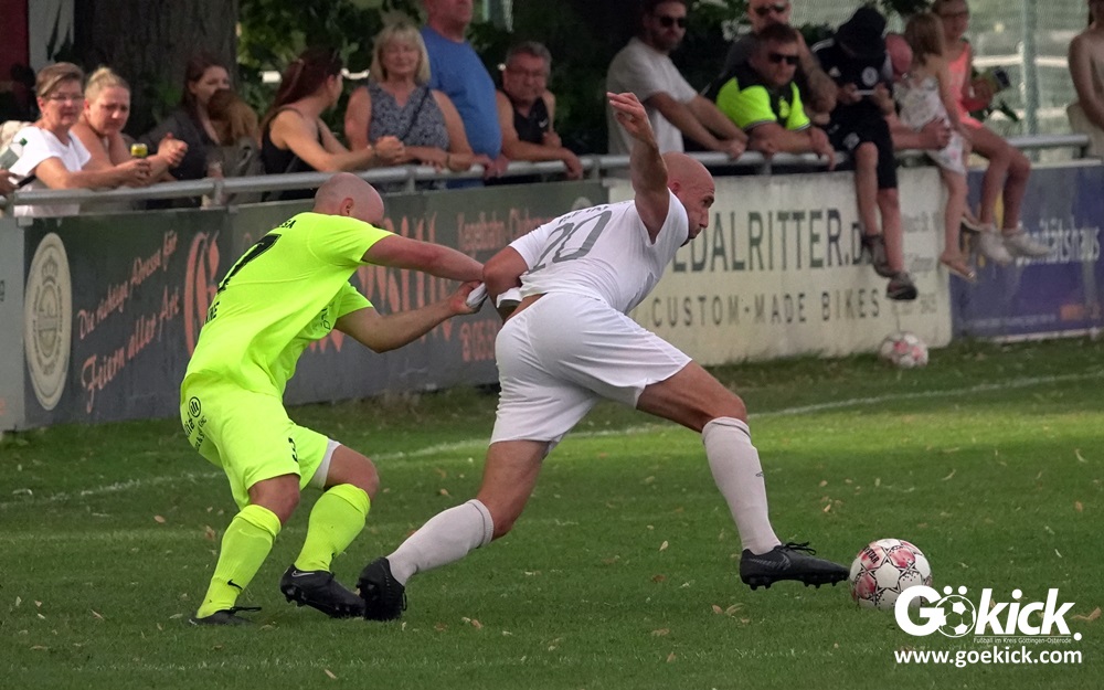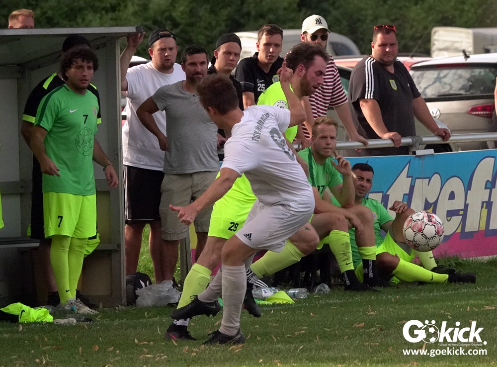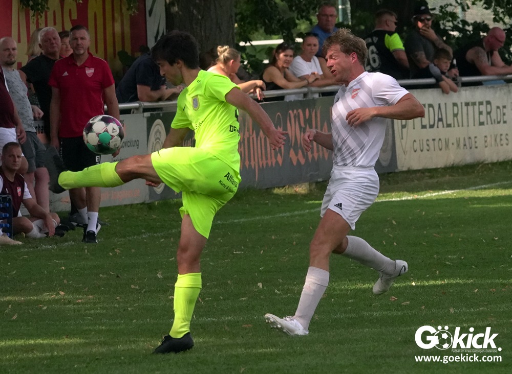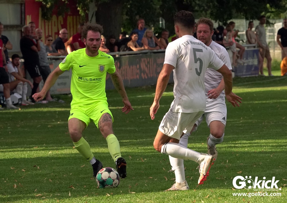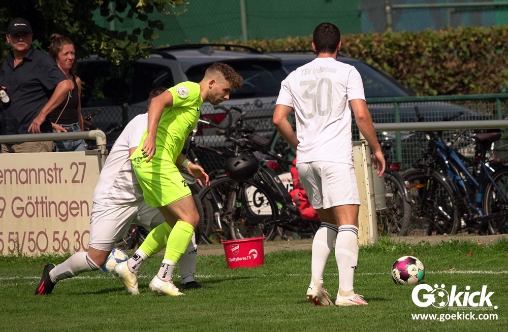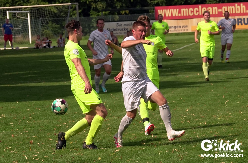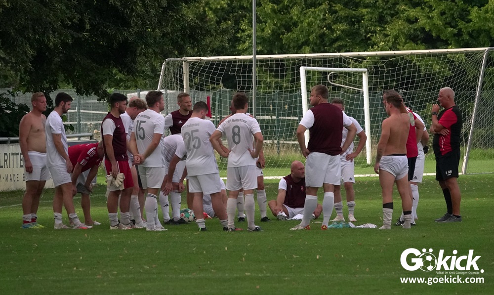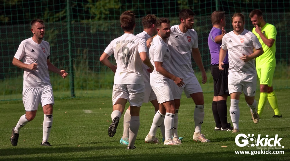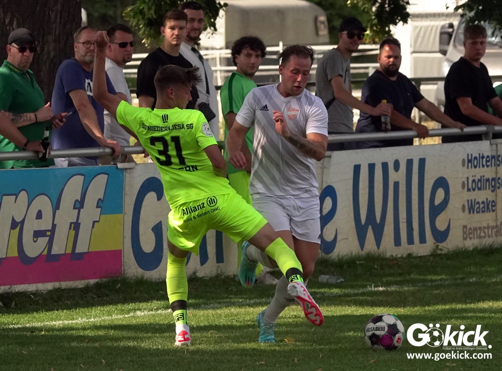 Im ersten Abschnitt waren beide Teams auf Sicherheit eingestellt. Die Zuschauer, die trotz Sommerhitze und wegen eines Reitturniers fehlender Parkplätze den Weg zum Holtenser Sportplatz gefunden hatten, durften nur wenige Strafraumszenen bewundern. Zwei Chancen durch Marcel Heimbüchel besaßen die Gastgeber von Trainer Enrico Weiß, beide vereitelte ein aufmerksamer Dominick Theune im Tor der Gäste. Er fing einst auch für den TSV die Bälle aus der Luft. Die Gäste brachten im ersten Abschnitt nur einmal den Kasten des TSV in Gefahr. Ansonsten sahen die Zuschauer viele verbissen geführte Zweikämpfe und dichtgestaffelte Abwehrreihen. Torlos ging es in die Halbzeitpause. „Wir haben im ersten Abschnitt abwartend reagiert, wussten, dass sie viel mit langen Bällen agieren. Da wollten wir sicher stehen.“, fasst Christian Dreher die erste Halbzeit aus seiner Sicht zusammen.