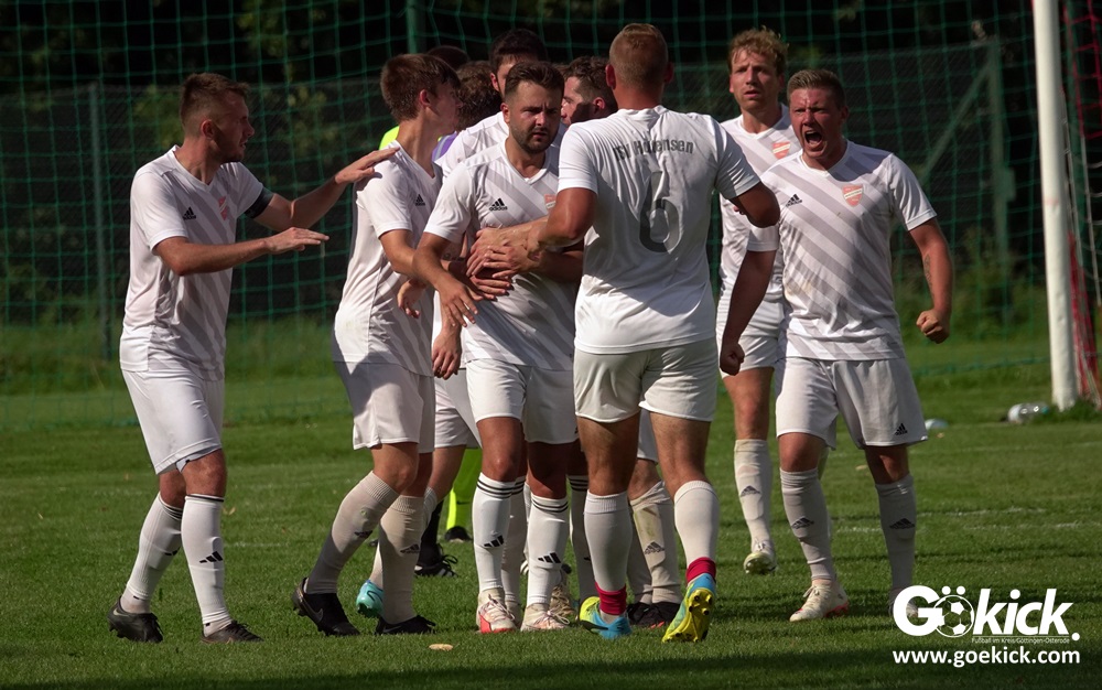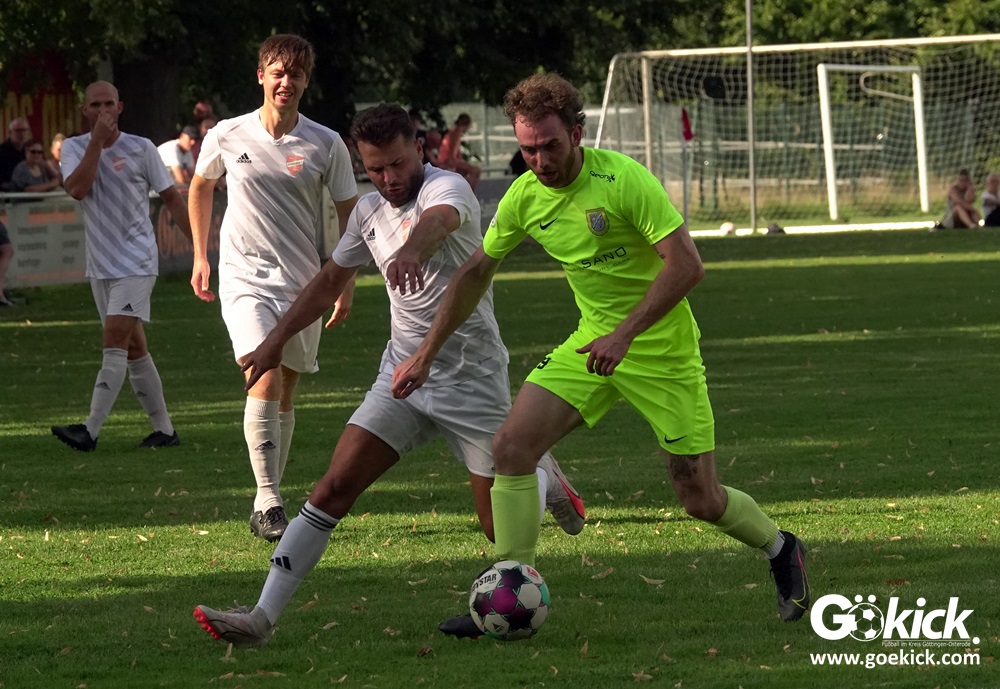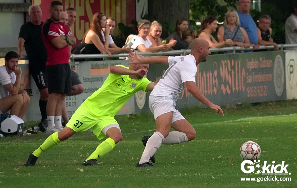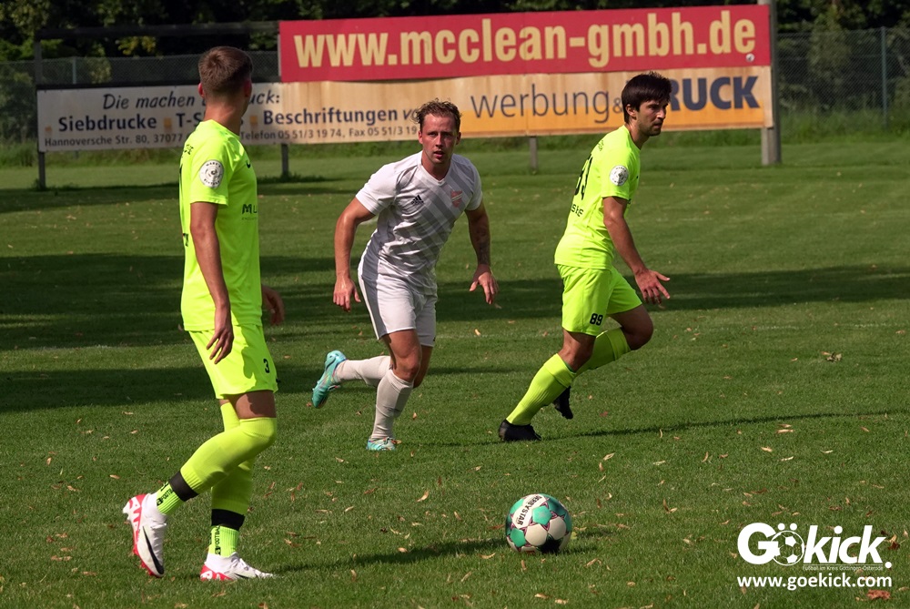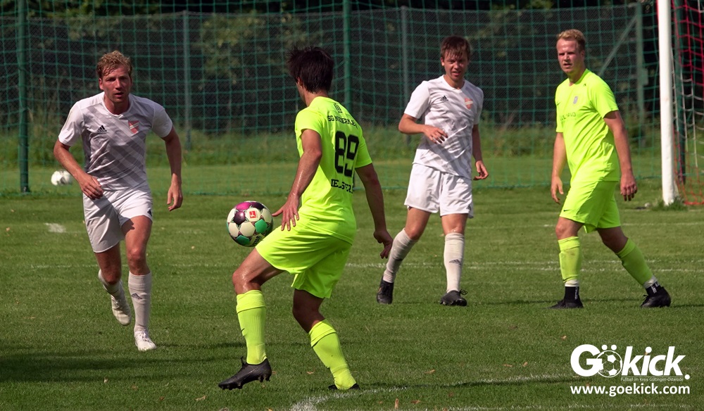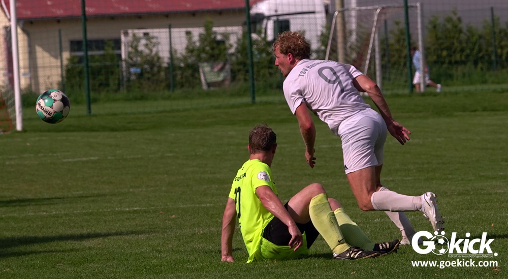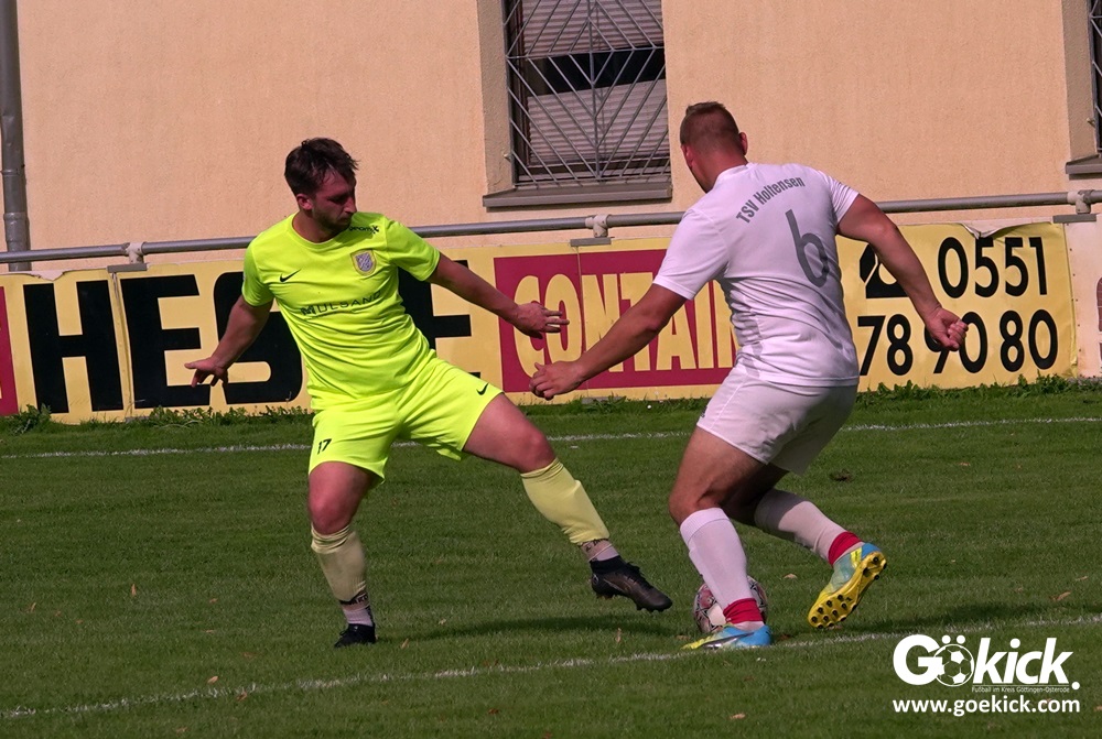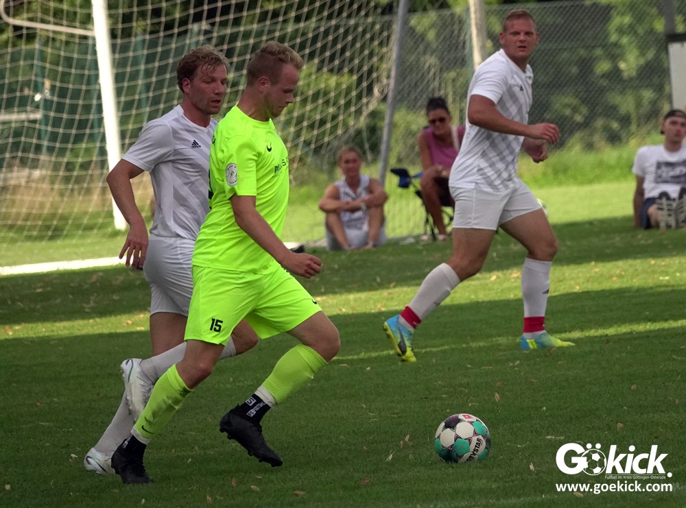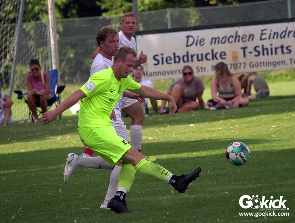 Im ersten Abschnitt waren beide Teams auf Sicherheit eingestellt. Die Zuschauer, die trotz Sommerhitze und wegen eines Reitturniers fehlender Parkplätze den Weg zum Holtenser Sportplatz gefunden hatten, durften nur wenige Strafraumszenen bewundern. Zwei Chancen durch Marcel Heimbüchel besaßen die Gastgeber von Trainer Enrico Weiß, beide vereitelte ein aufmerksamer Dominick Theune im Tor der Gäste. Er fing einst auch für den TSV die Bälle aus der Luft. Die Gäste brachten im ersten Abschnitt nur einmal den Kasten des TSV in Gefahr. Ansonsten sahen die Zuschauer viele verbissen geführte Zweikämpfe und dichtgestaffelte Abwehrreihen. Torlos ging es in die Halbzeitpause. „Wir haben im ersten Abschnitt abwartend reagiert, wussten, dass sie viel mit langen Bällen agieren. Da wollten wir sicher stehen.“, fasst Christian Dreher die erste Halbzeit aus seiner Sicht zusammen.