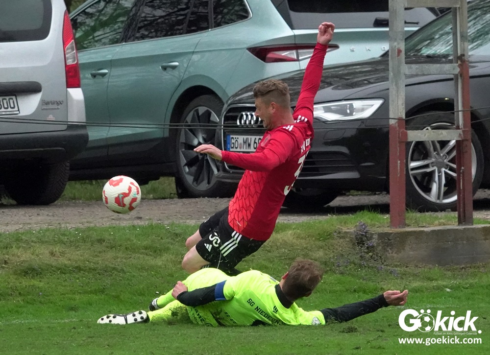 Das Spiel verlief im ersten Abschnitt sehr ausgeglichen, der Gastgeber hatte sich in Abwesenheit des urlaubenden Trainers Patrick Marquardt gegen den Ligaprimus offensichtlich vorgenommen, sich nicht in die eigene Hälfte zu verkriechen. So mussten die Abwehrspieler der Gäste manch brenzlige Situation bereinigen, was ihnen aber immer gelang. Die Gäste hingegen waren gezwungen, viel mit langen Bällen zu agieren. Nach 21 Spielminuten vollendete Dominik-Marcel Brömsen eine Hereingabe zum Gäste-Führung. Nach 38 Minuten musste SGN-Spielmacher Josú De las Héras Vicuña mit einer Muskel-Verletzung die Partie verlassen. Für ihn kam Jan Kuhlemeier in die Partie. Das Derby blieb bis zur Pause ausgeglichen, dem Gast schenkte die Führung jedoch Sicherheit. Mit der knappen 1:0-Führung ging es in die Kabine.