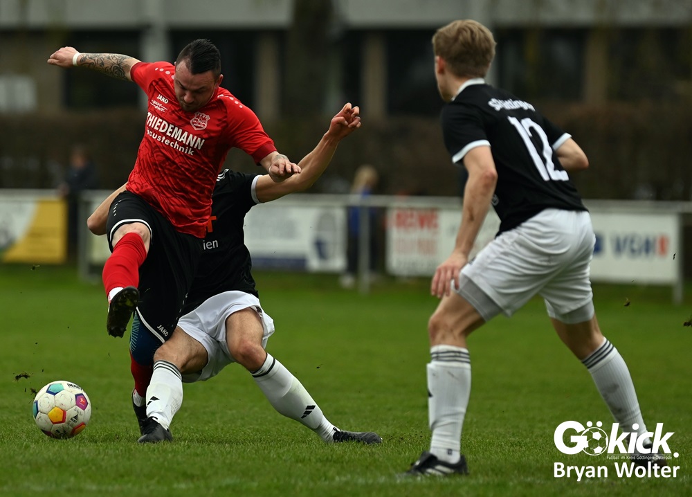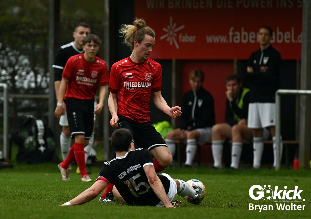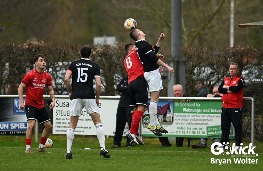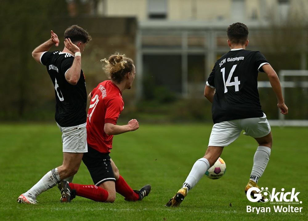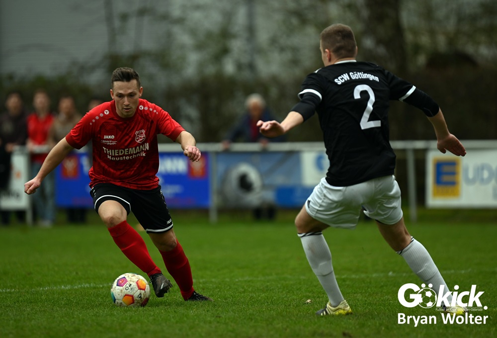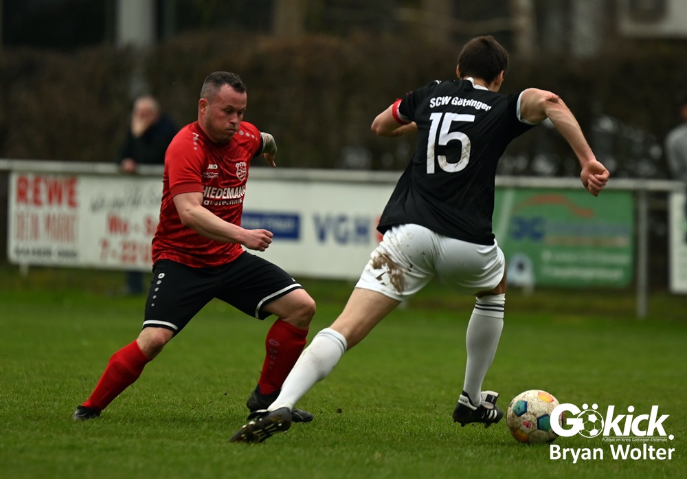 35 Minuten verlief die Partie torlos. Dann kamen die verrückten sechs Minuten: Zuerst brachte Kai Armbrust den Gastgeber mit 1:0 in Führung. Nur zwei Minuten später erhöhte Maximilian Ring auf 2:0. Die Freude über die Führung währte nur eine Minute, ehe SCW-Kapitän Jasper Frohn den Anschlusstreffer erzielte. Und erneut nur drei Minuten nach dem ersten SCW-Treffer erzielte Johannes Mädge den Ausgleich für die Gäste aus der Universitätsstadt. Doch damit hatten die Akteure auf dem Platz auch ihrn Pulver verschossen. Das 2:2 hatte nicht nur zum Pausenpfiff Bestand, es blieb auch bis zum Ende der Partie bei diesem Spielstand.