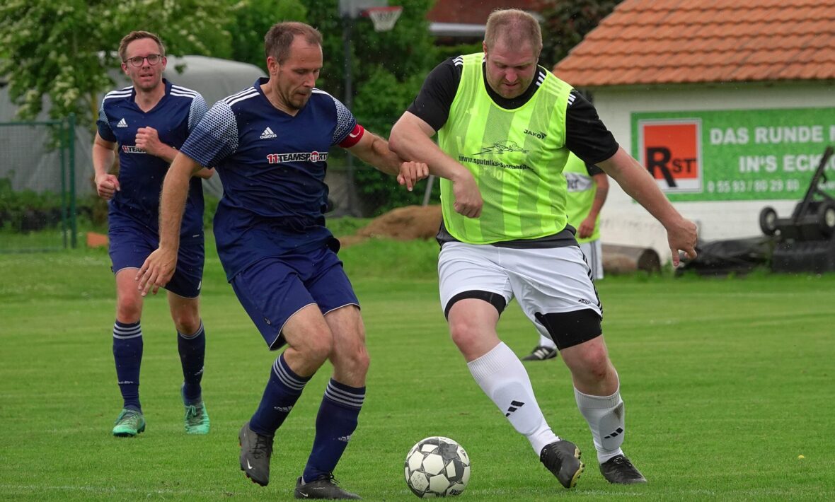 Die Gäste aus Dransfeld und Umland kamen mit vielen bekannten Gesichtern nach Lenglern. Der Grund: Am 14. Juni spielt die Altherren-Mannschaft der SG Hoher Hagen in Dransfeld gegen die Traditionsmannschaft des VfL Wolfsburg. Um nicht ganz unsportlich zu wirken, nutzten viele in die Jahre gekommene Spieler das Kleinfeldspiel, um ihre Fitness zu verbessern. Das gelang auch wirklich gut. Die Gäste waren das bessere Team und hatten ein deutliches Chancenplus. Sie gingen nach 15 Minuten durch Sebastian Fritz mit 1:0 in Führung. Zehn Minuten später glichen die Hausherren, die sehr kampfstark agierten, durch Christian Clasing aus. Beim Stand von 1:1 wurden die Seiten gewechselt.