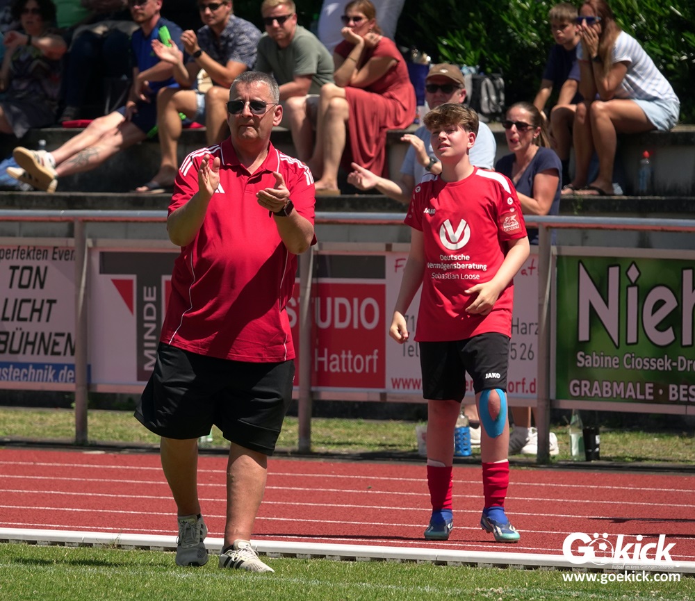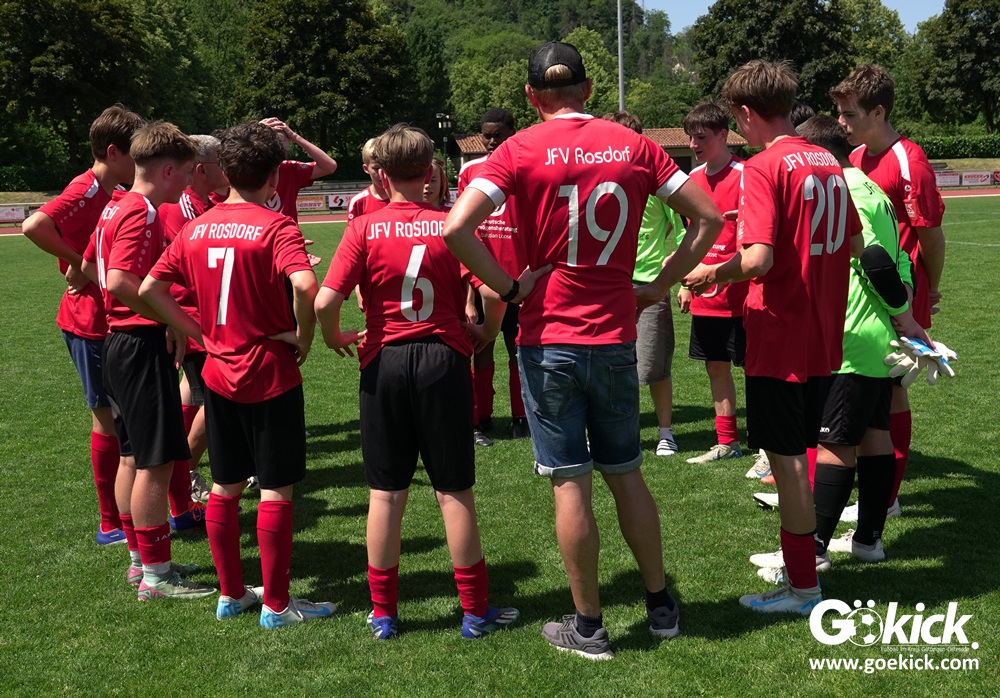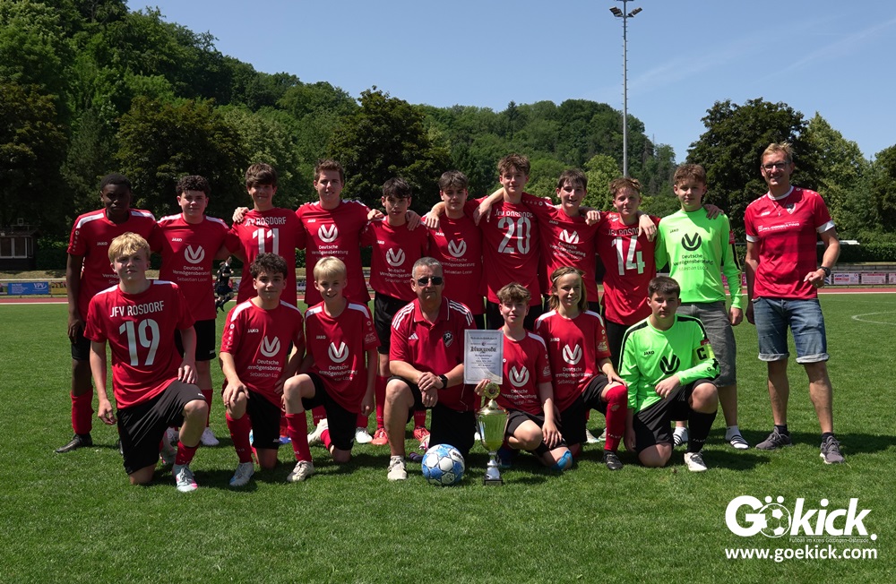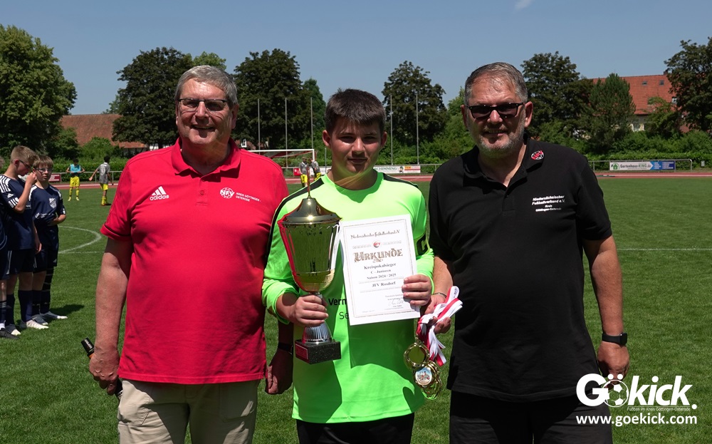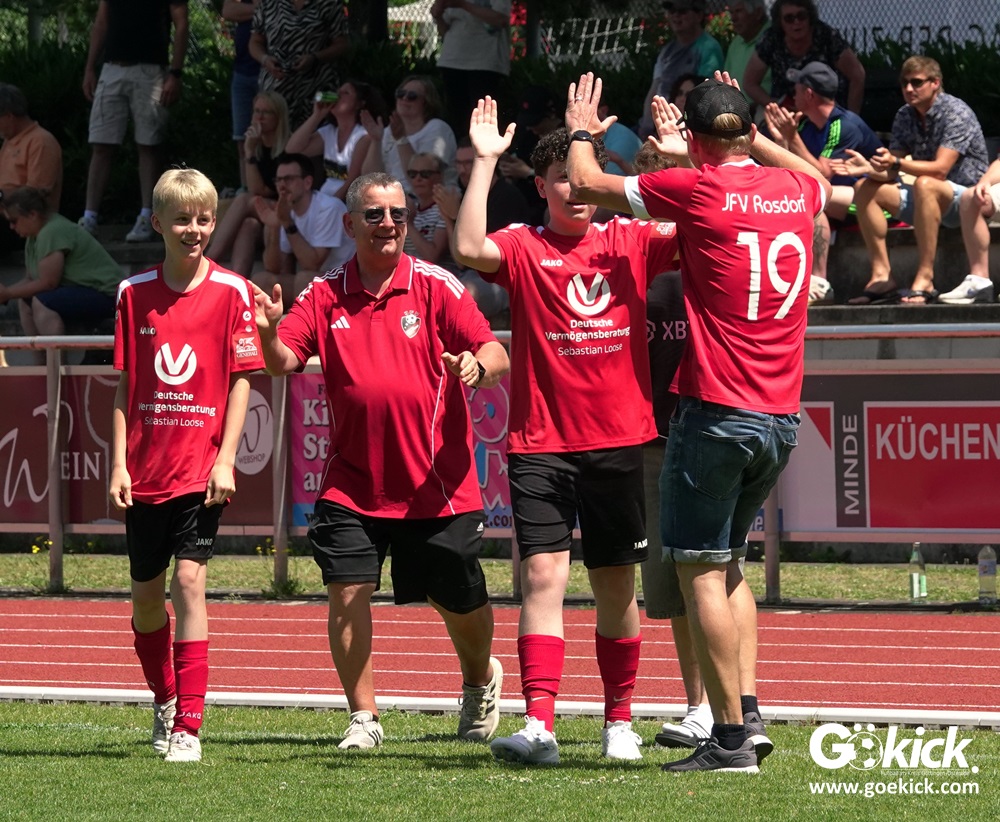 Hier schien die Pausenansprache der beiden Rosdorfer Trainer Daniel Milbradt und Thomas Binkowski sichtlich die Leistung ihrer Jungs zu verbessern. Denn schon nach 42 Minuten gelang Bela Moses Günther der Anschlusstreffer zum 2:3 aus Sicht der Rosdorfer. Und zehn Minuten später fiel gar der Ausgleich: Dzenan Ramoviq erzielte ihn. Nun waren die Außenseiter obenauf, der Favorit konnte die Niederlage nicht mehr aufhalten. Mit seinem zweiten Tagetreffer sorgte Tarik Pasic für den viel umjubelten Siegestreffer für den JFV Rosdorf. “Endlich haben wir einmal effektiv unsere Chancen genutzt. Das war während der Saison unser großes Manko!“, freute sich Rosdorfs Trainer Thomas Binkowski nach dem Schlusspfiff euphorisch. Aufgrund der Leistung im zweiten Abschnitt siegte der JFV Rosdorf dieses Finale verdient und darf sich nun Kreispokalsieger 2025 nennen! Das Team sucht übrigens für die kommende Saison noch einen Torwart der Jahrgänge 2009 bis 2011 für den B-Jugend-Spielbetrieb.
