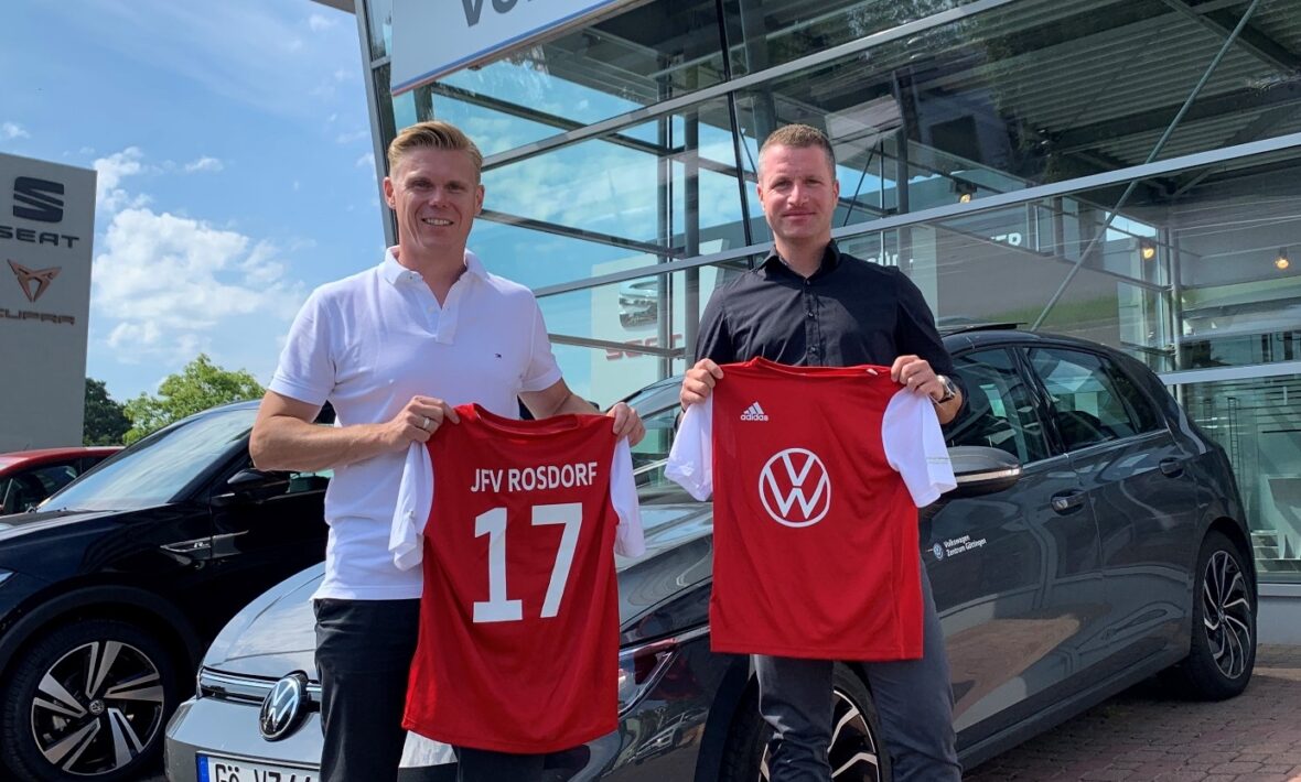 Am vergangenen Dienstag war es endlich soweit: E-Jugend-Trainer Carsten Ilse (links auf dem Foto mit Verkaufsberater Johannes Gunkel) konnte den vom Volkswagen Zentrum Autohaus Südhannover gesponserten Trikotsatz in Empfang nehmen. Der JFV Rosdorf bedankt sich herzlich für die Bereitstellung des Trikotsatzes mit insgesamt 20 Feldspieler- und zwei Torwarttrikots sowie zugehörigen Hosen und Stutzen für die E1 und E2. Eine Übergabe mit Gruppenbild war leider aufgrund der aktuellen Situation sowie der anstehenden Ferienzeit nicht möglich.
