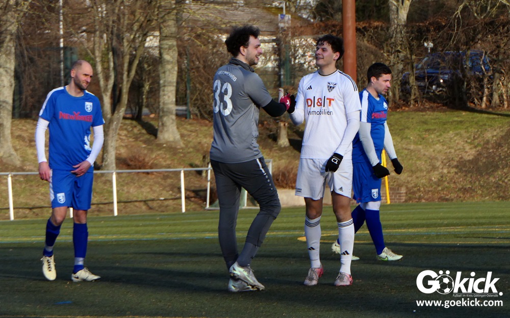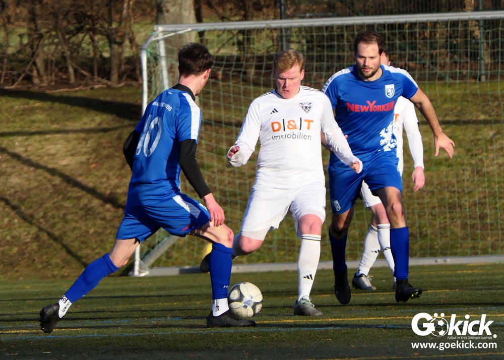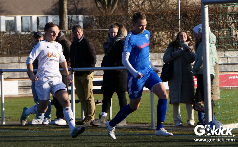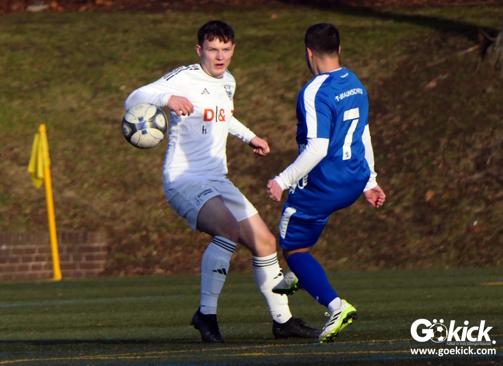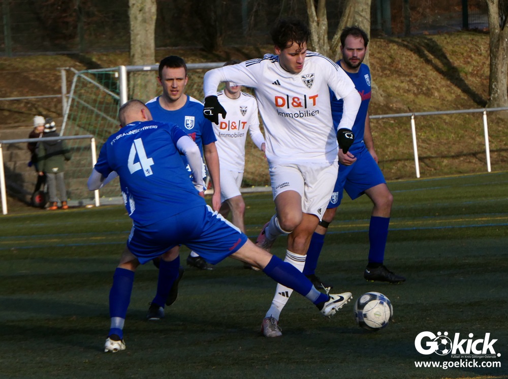 Nach sieben Minuten klingelte es erstmals im Tor der Gäste. Dort stand mit Enno-Bendix Behrens ein Torwart, der einst für den Gastgeber und zuvor auch für den TSV Groß Schneen zwischen den Pfosten stand. Lucca Sielaff konnte ihn überwinden. Doch nur vier Minuten später gelang Lennart Appel der Ausgleich für die Löwenstädter. Weiter fünf Minuten waren verstrichen, da konnte Mehmet Kaan Arlier die Heimmannschaft per verwandelten Strafstoß erneut in Führung schießen. Für das 2:2 in der 39. Spielminute sorgte der Braunschweiger Nils Helbing. Damit ging es auch in die Halbzeitpause.