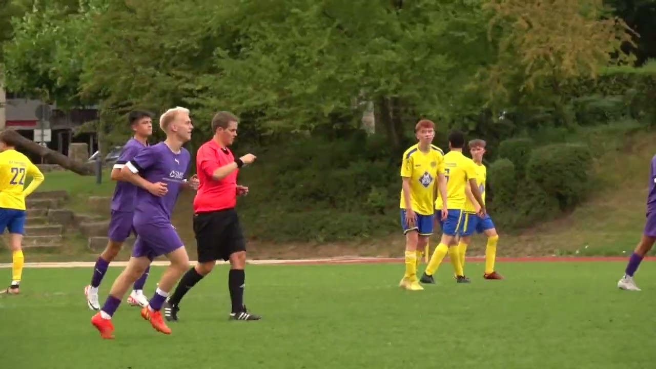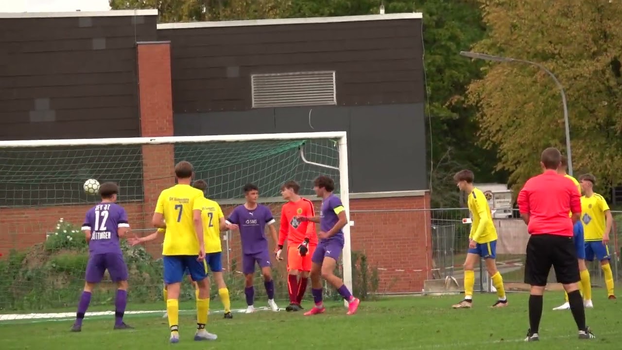 Ein Abtasten gab es auch dem schwer zu bespielenden Rasen nicht. Beide Mannschaften spielten mit hohem Tempo und rasant in der Zweikampfführung. Zwar besaß der JFV 37 ein spielerisches Übergewicht, die Gäste hielten ihren Kasten aber mit einer robusten, aber fairen Spielweise sauber. Deshalb mussten für die Göttinger Standards herhalten. Das 1:0 nach 34 Minuten entsprang einem Eckball, den Kalle Geisenhainer mit dem Kopf zur JFV-Führung verwandelte (Video).