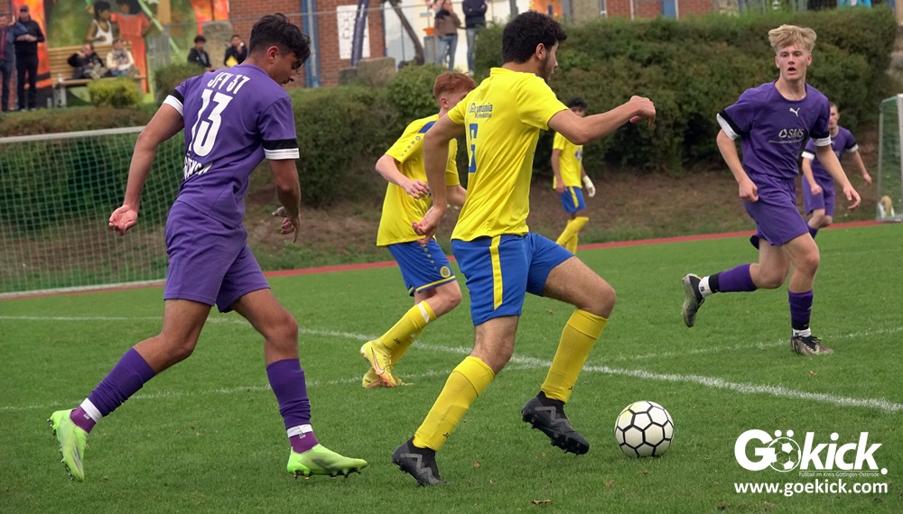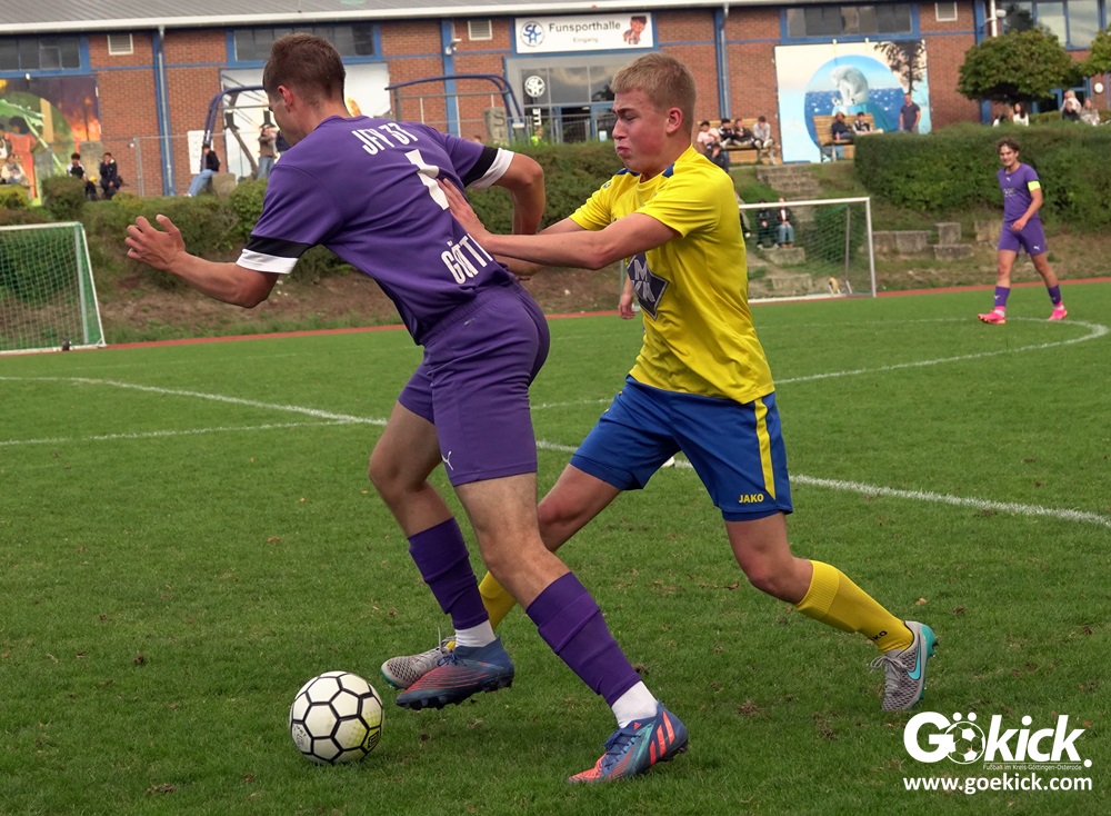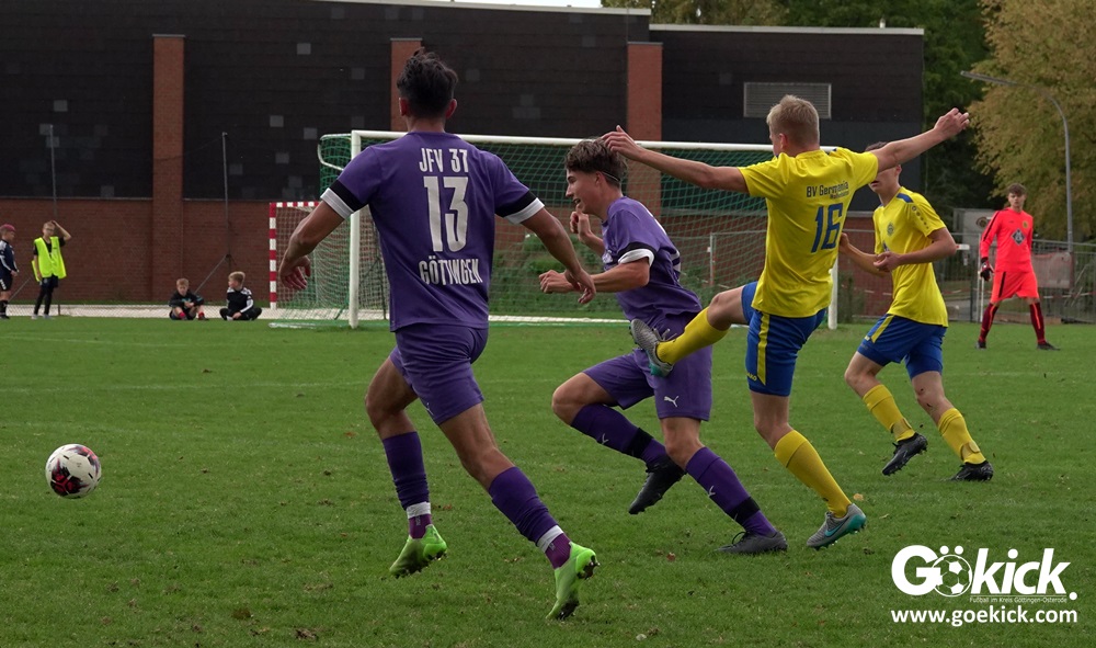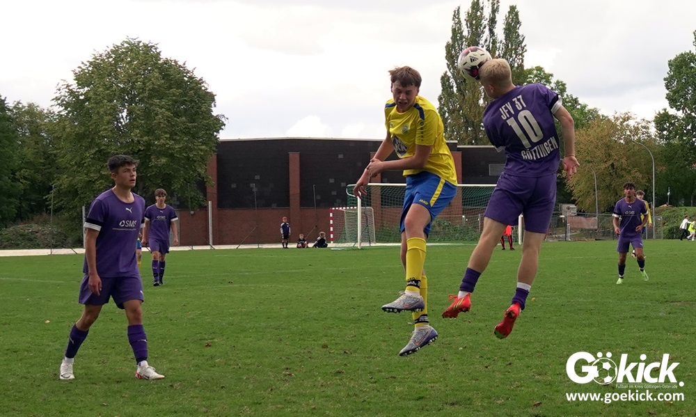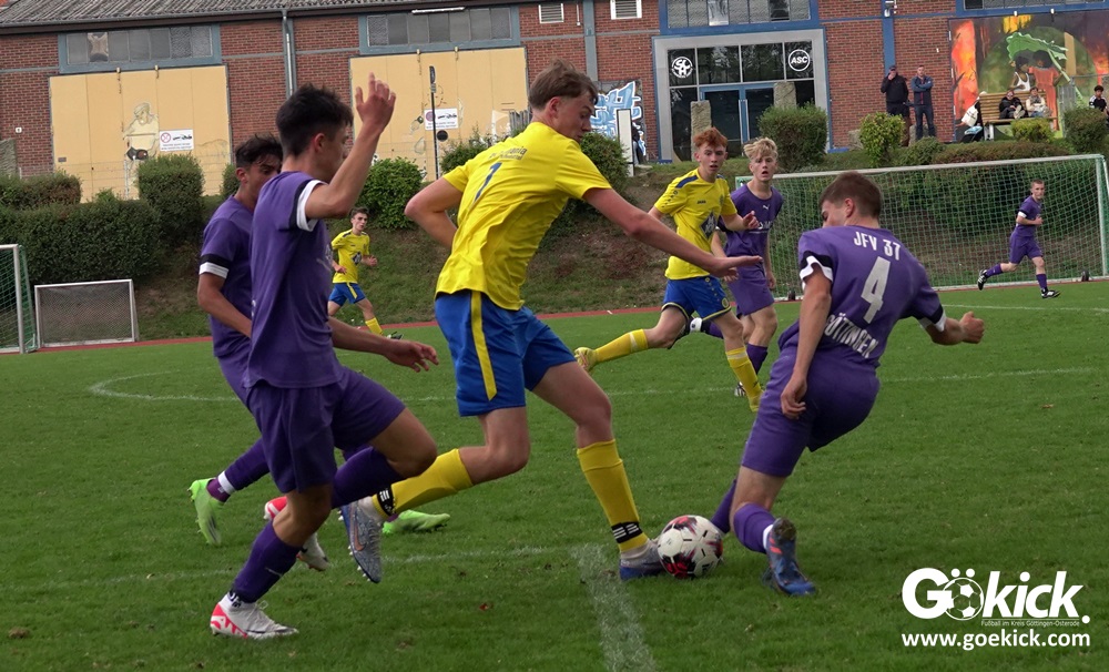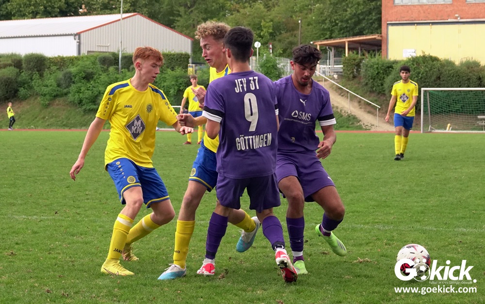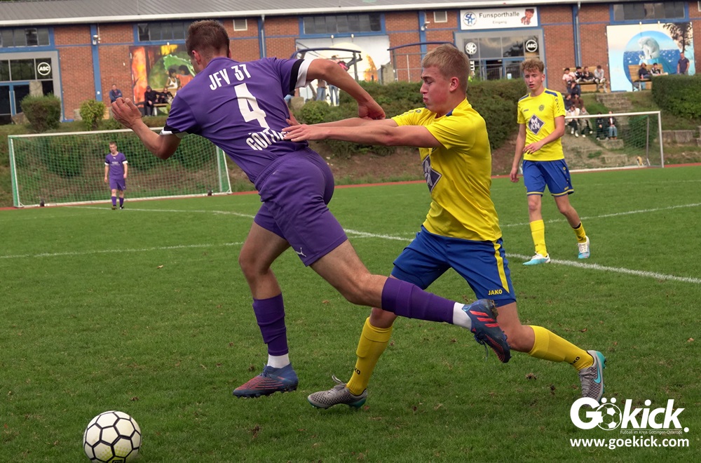 Ein Abtasten gab es auch dem schwer zu bespielenden Rasen nicht. Beide Mannschaften spielten mit hohem Tempo und rasant in der Zweikampfführung. Zwar besaß der JFV 37 ein spielerisches Übergewicht, die Gäste hielten ihren Kasten aber mit einer robusten, aber fairen Spielweise sauber. Deshalb mussten für die Göttinger Standards herhalten. Das 1:0 nach 34 Minuten entsprang einem Eckball, den Kalle Geisenhainer mit dem Kopf zur JFV-Führung verwandelte (Video).