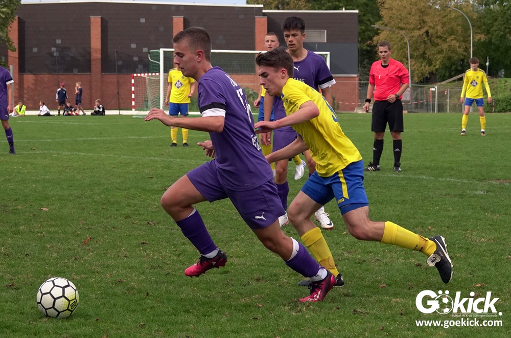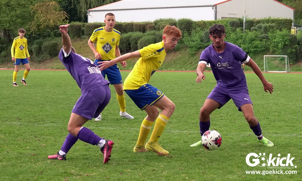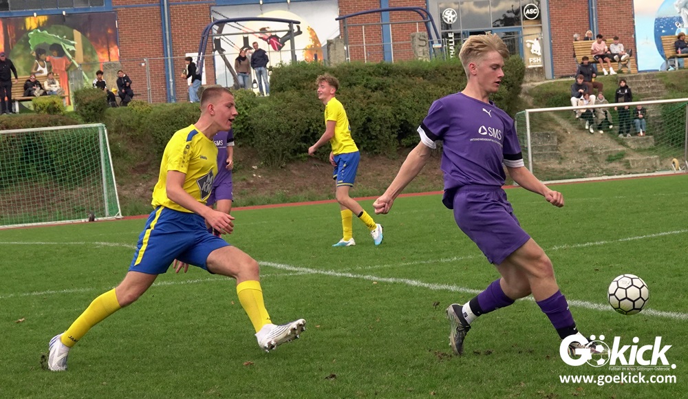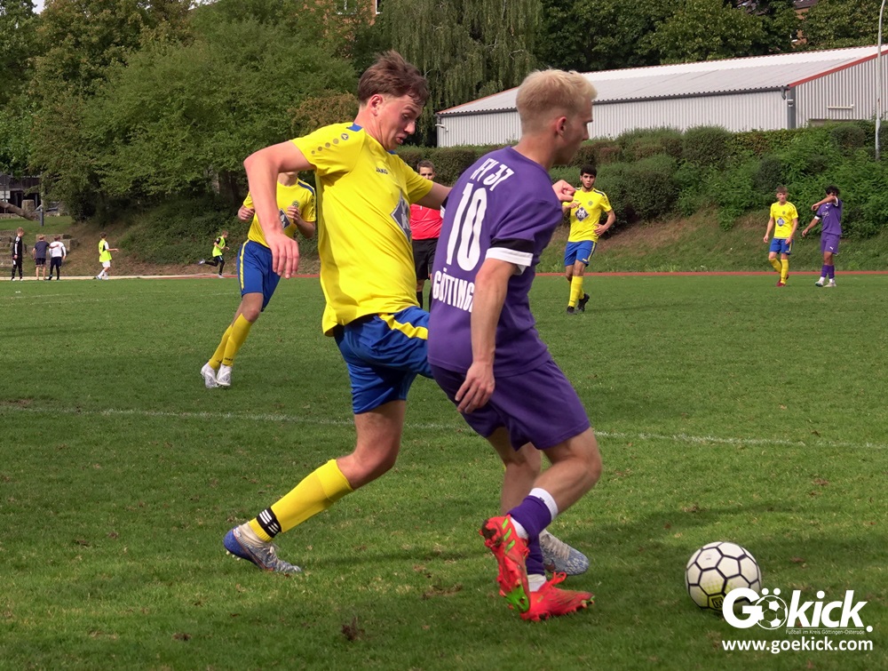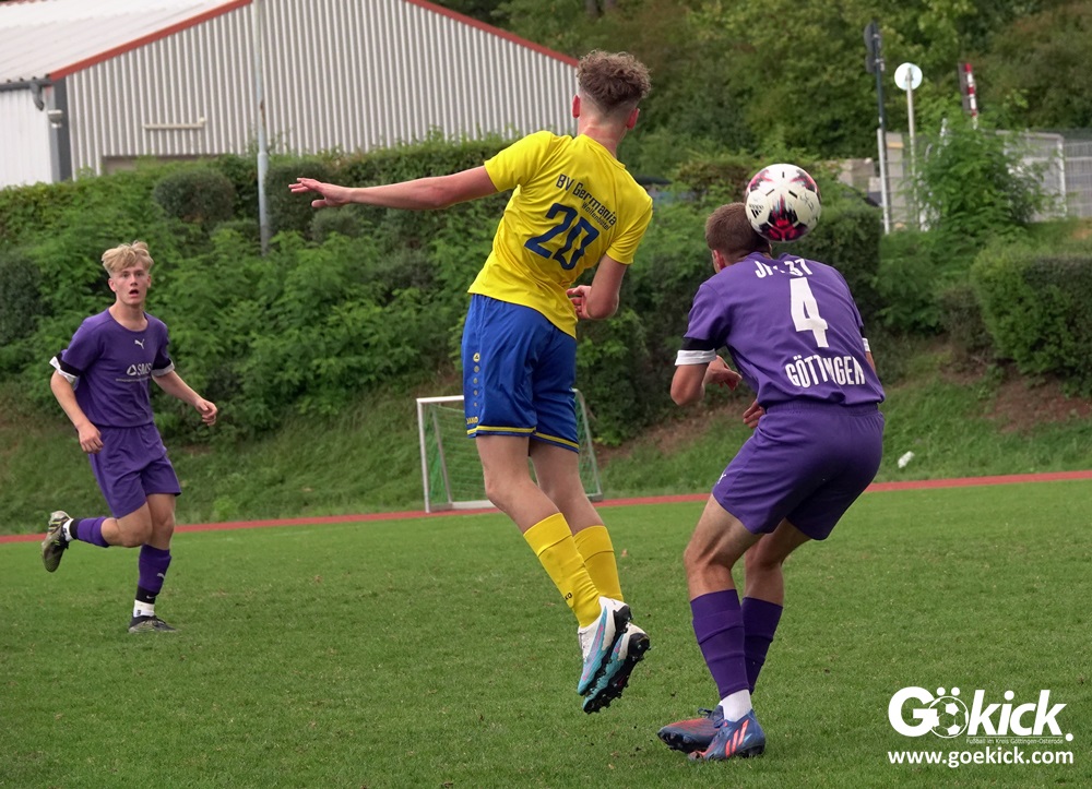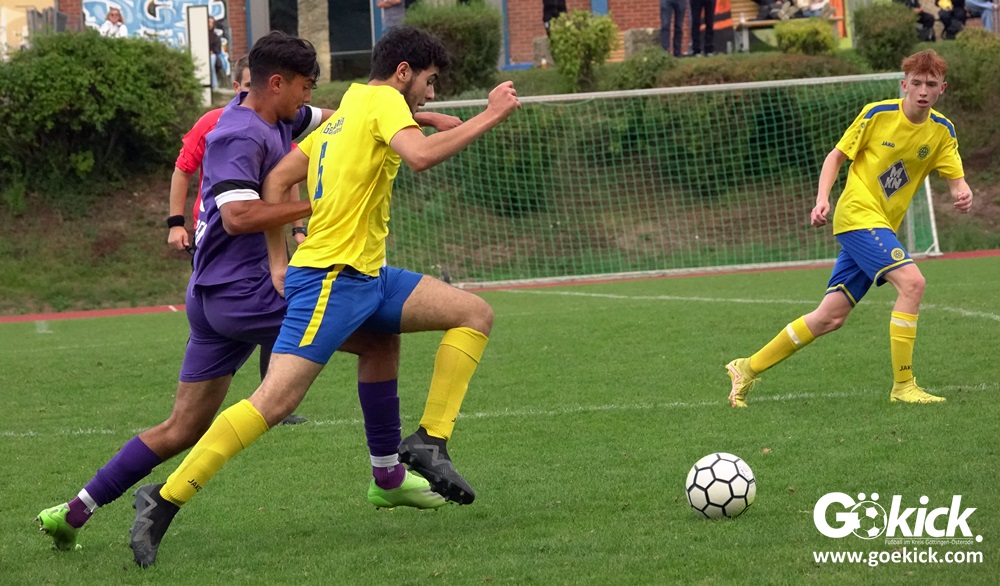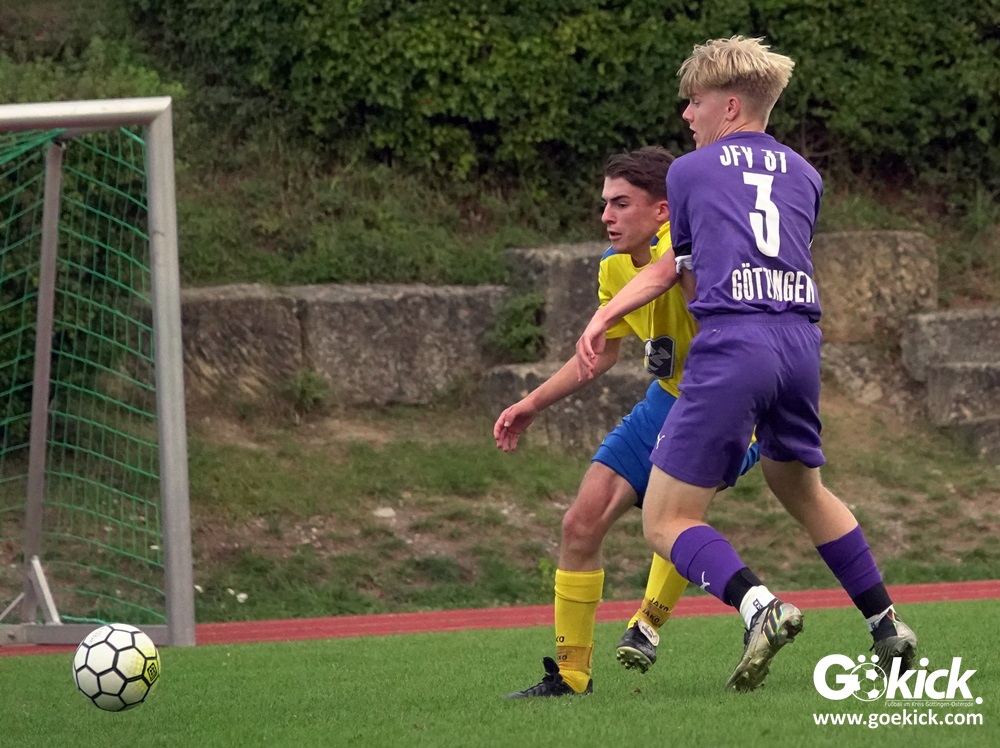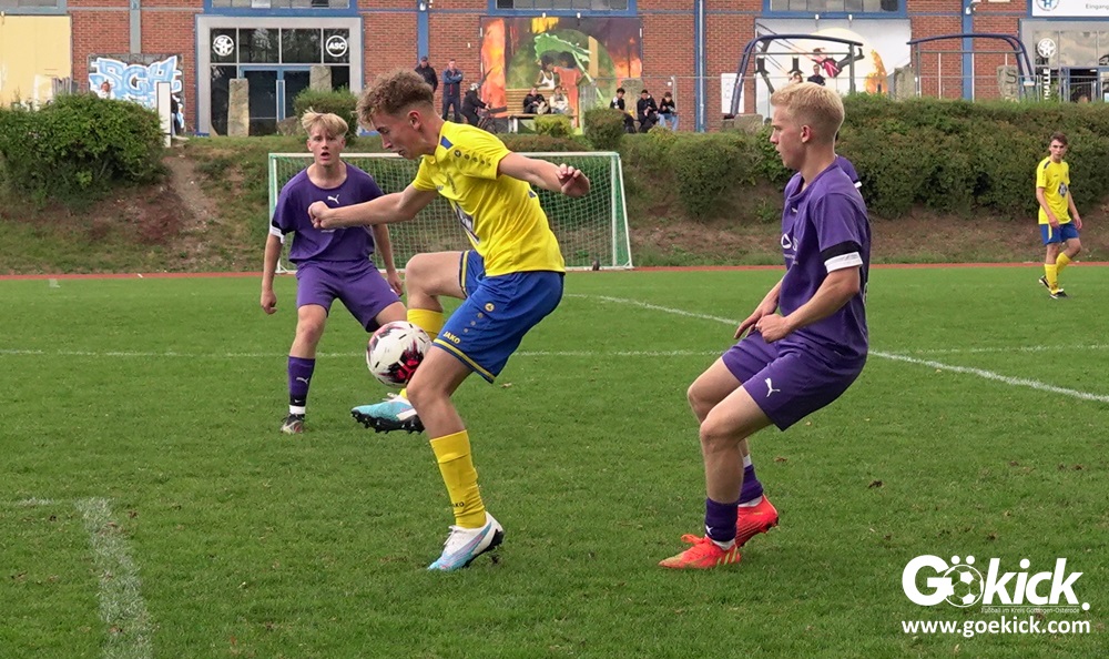 Ein Abtasten gab es auch dem schwer zu bespielenden Rasen nicht. Beide Mannschaften spielten mit hohem Tempo und rasant in der Zweikampfführung. Zwar besaß der JFV 37 ein spielerisches Übergewicht, die Gäste hielten ihren Kasten aber mit einer robusten, aber fairen Spielweise sauber. Deshalb mussten für die Göttinger Standards herhalten. Das 1:0 nach 34 Minuten entsprang einem Eckball, den Kalle Geisenhainer mit dem Kopf zur JFV-Führung verwandelte (Video).