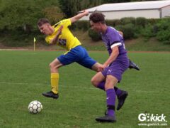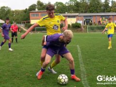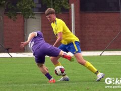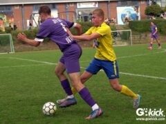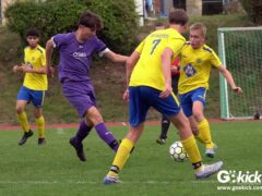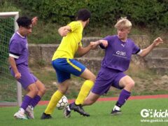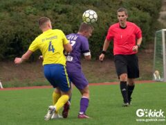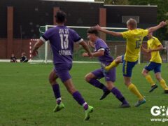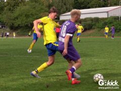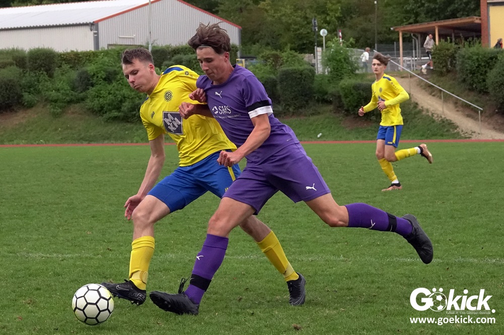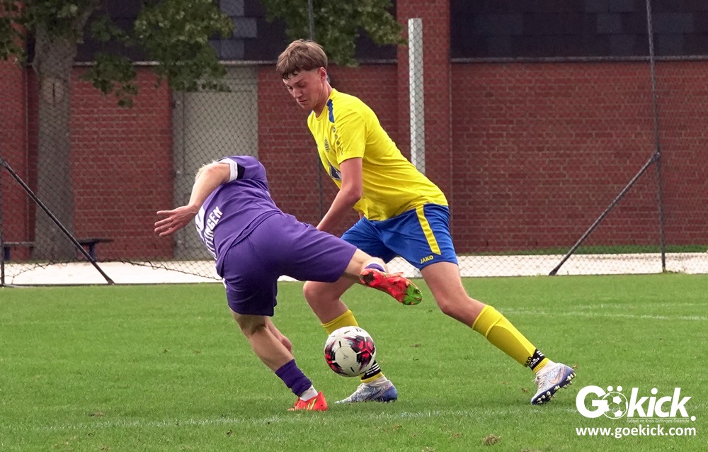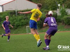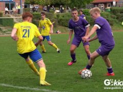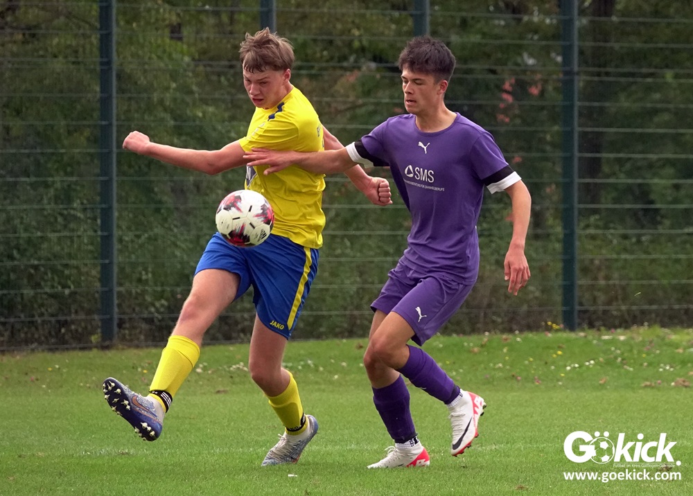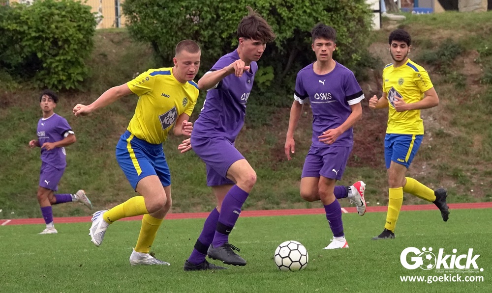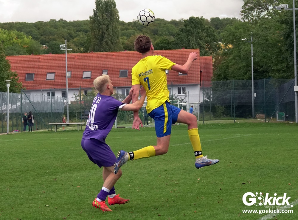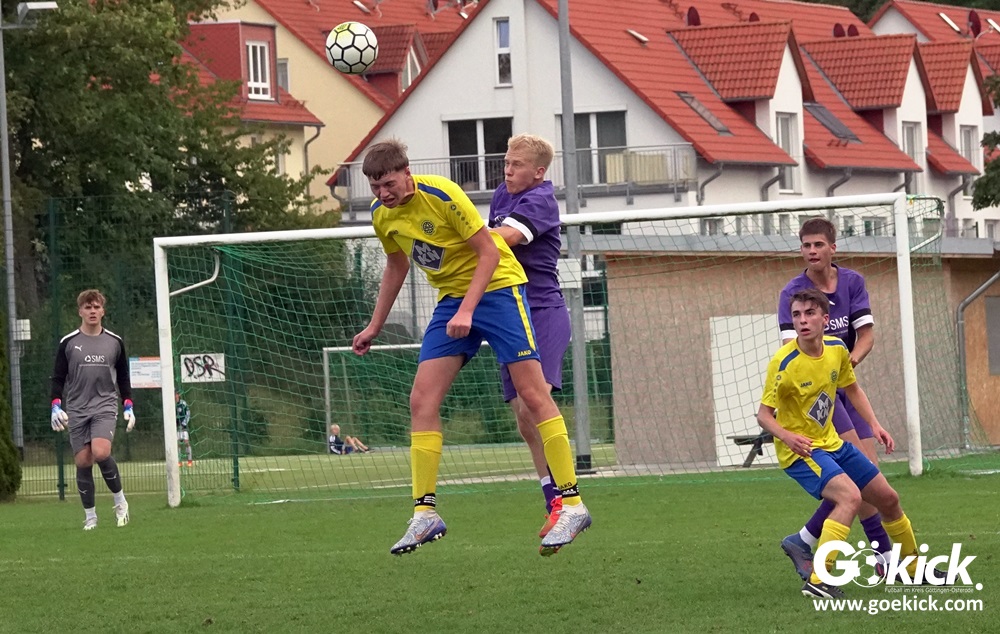 Ein Abtasten gab es auch dem schwer zu bespielenden Rasen nicht. Beide Mannschaften spielten mit hohem Tempo und rasant in der Zweikampfführung. Zwar besaß der JFV 37 ein spielerisches Übergewicht, die Gäste hielten ihren Kasten aber mit einer robusten, aber fairen Spielweise sauber. Deshalb mussten für die Göttinger Standards herhalten. Das 1:0 nach 34 Minuten entsprang einem Eckball, den Kalle Geisenhainer mit dem Kopf zur JFV-Führung verwandelte (Video).