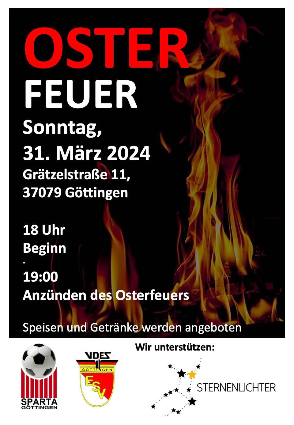 Auch die Sportler der Göttinger Vereine ESV Rot-Weiß und Sparta begehen in diesem Jahr gemeinsam und feierlich die Tradition des Osterfeuers. Zur Veranstaltung ist jeder eingeladen, der sich anschließen möchte. Auf dem Areal zwischen den beiden Sportanlagen der Nachbarn wird das Feuer ab 19:00 Uhr entzündet. Die Veranstaltung, bei der auch Speisen und Getränke käuflich erworben werden können, beginnt 18:00 Uhr.
