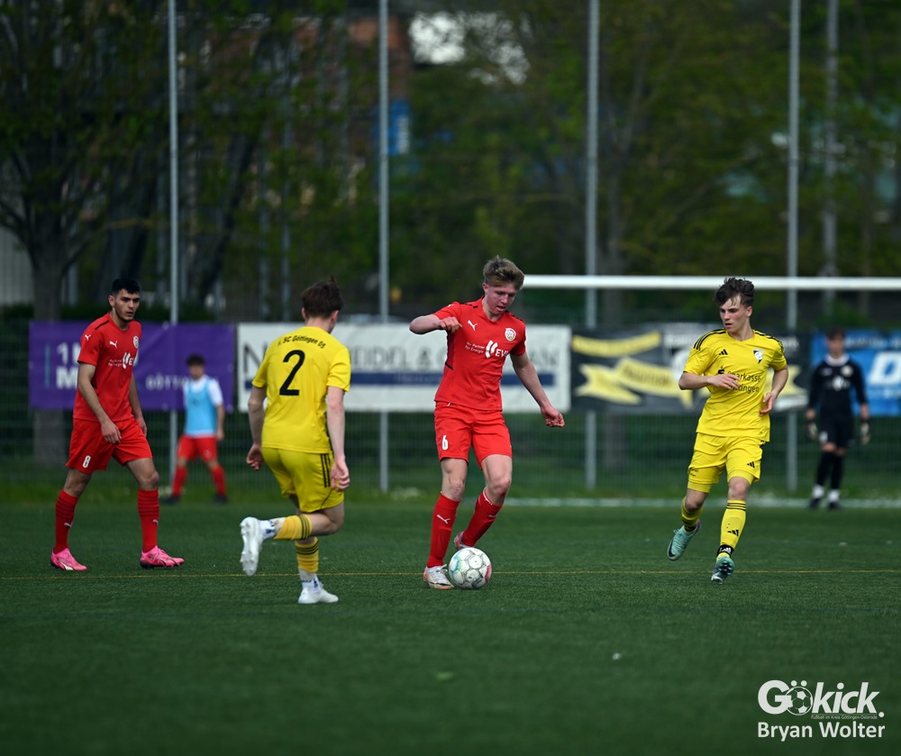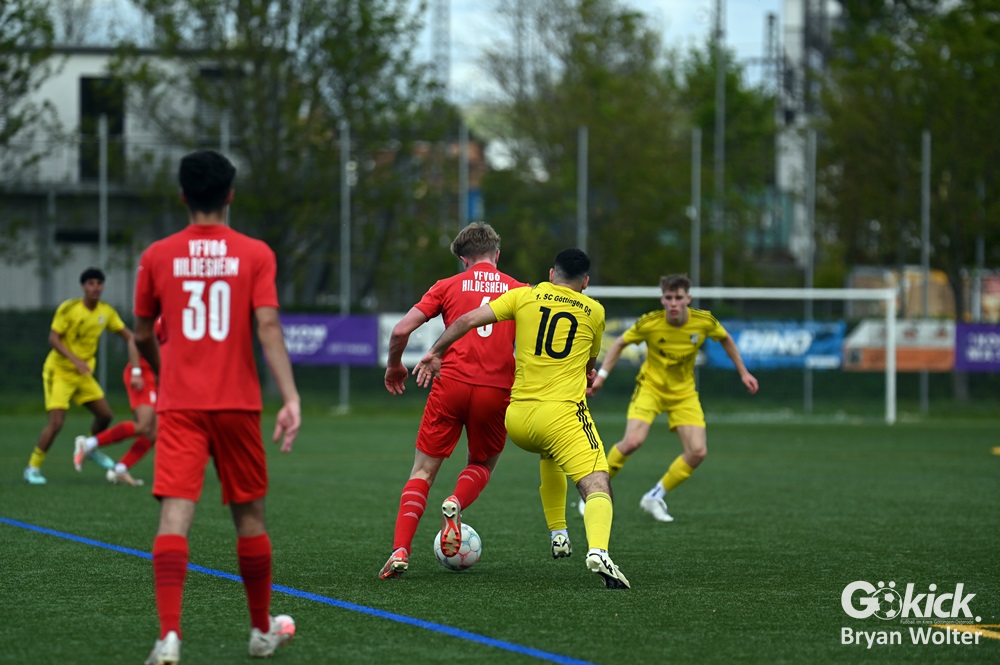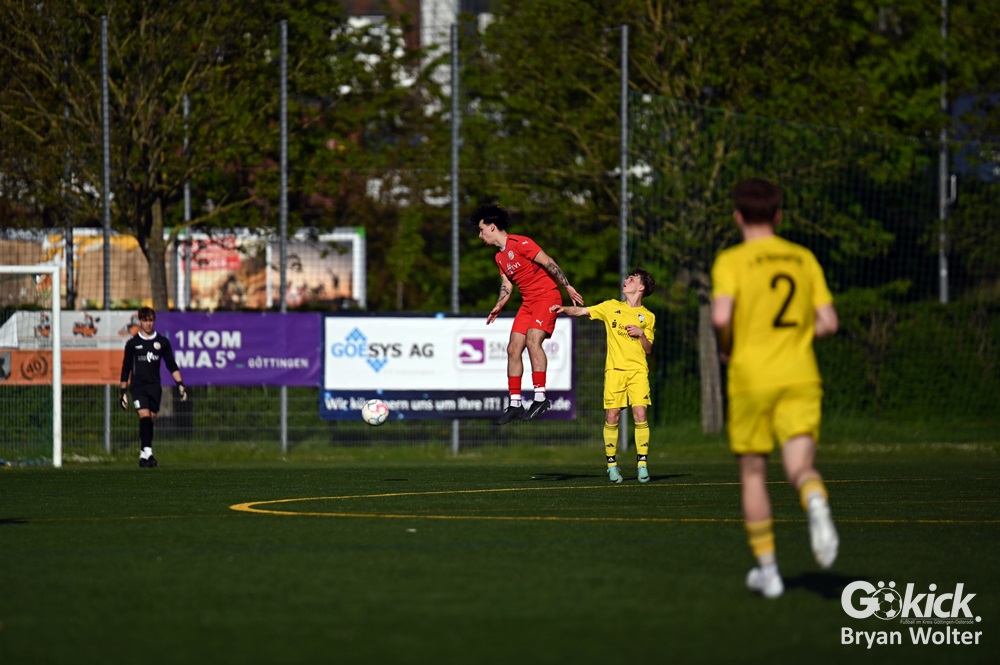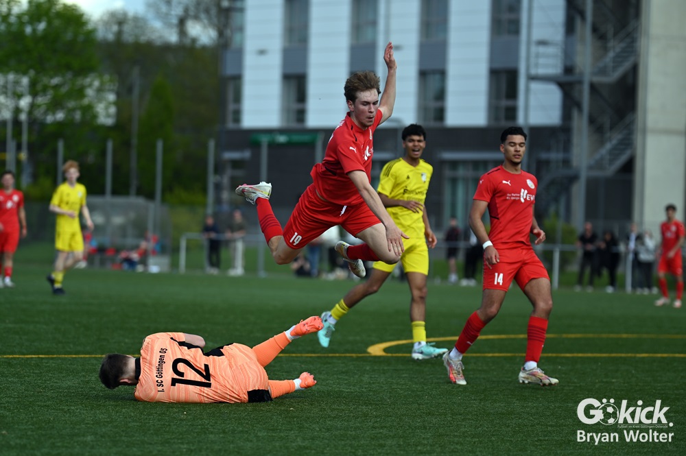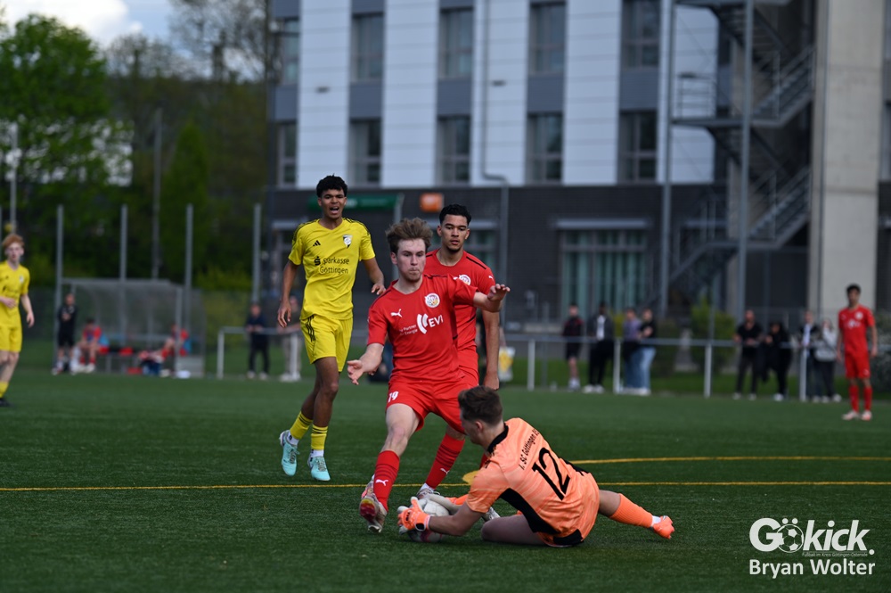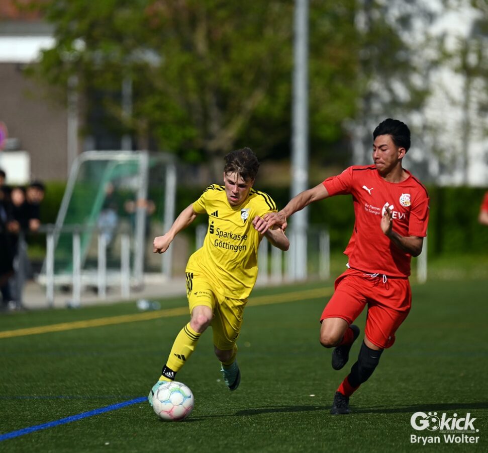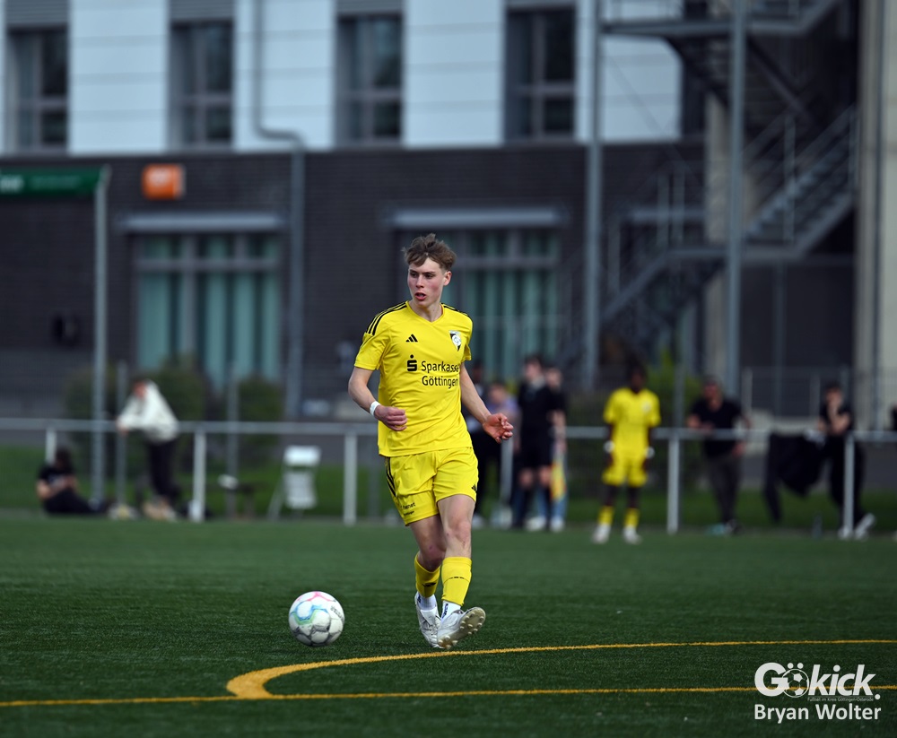 Die U19 des 1. SC Göttingen 05 hat dem Spitzenreiter der A-Jugend-Niedersachsenliga, dem VfV Borussia 06 Hildesheim, auch die zweite Saison-Niederlage zugefügt. Nach dem 6:4-Sieg des Teams von Trainer Jan Steiger im Hinspiel im März, gewannen die Göttinger auch das Rückspiel am vergangenen Samstag im heimischen Maschpark mit 2:1 (2:0). Durch diesen Sieg verkürzte das schwarz-gelbe Team den Rückstand zum Tabellenführer auf drei Punkte, hat aber auch ein Spiel mehr ausgetragen. In den restlichen sieben beziehungsweise acht Spielen der Saison könnte noch viel Spannung entstehen.