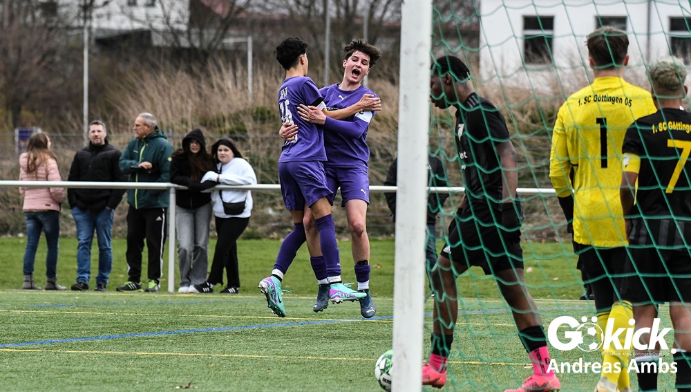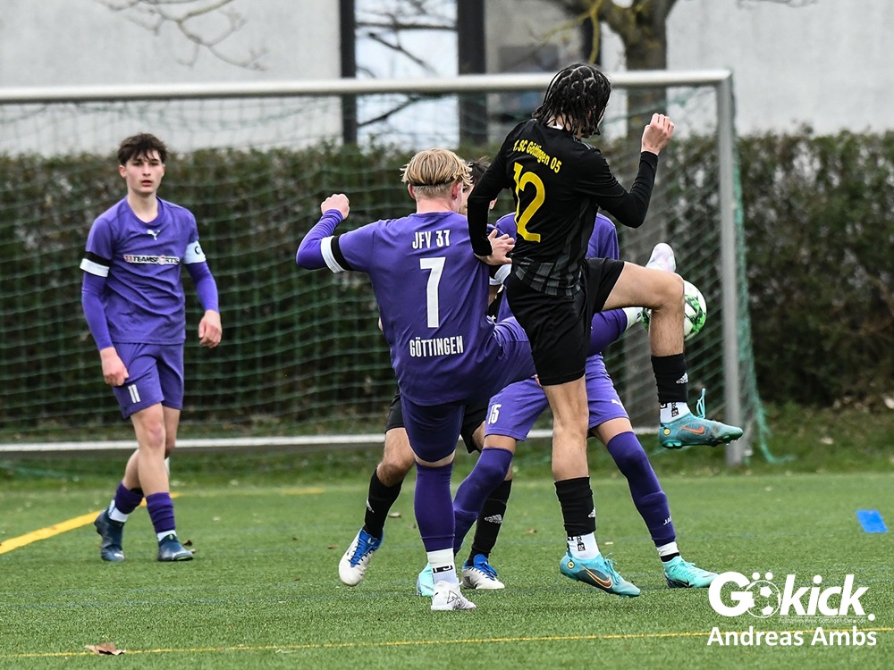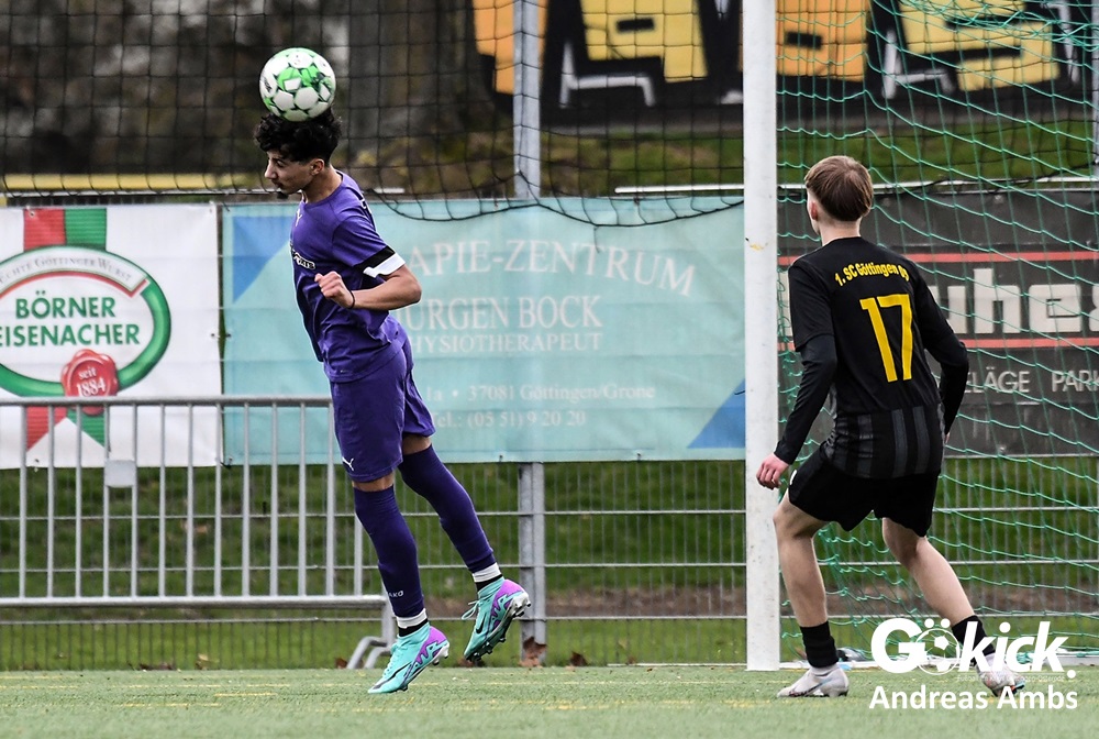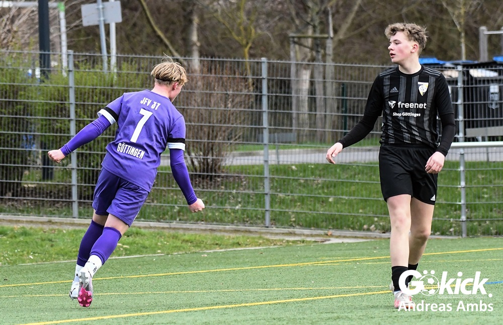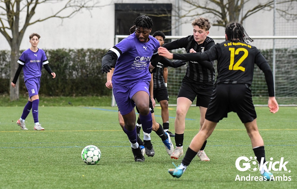 Im Göttinger Derby in der B-Jugend-Bezirksliga empfing am vergangenen Samstag auf dem Kunstrasenplatz des Göttinger Maschparks die U16 des 1. SC Göttingen 05 den Stadtrivalen aus der Göttinger Südstadt, die U16 des JFV 37 Göttingen. Nach 80 abwechslungsreichen Minuten siegte der Gast am Ende verdient mit 4:2 (2:1) und wahrt als Bezirksliga-Zweiter mit drei Punkten Rückstand auf Tabellenführer JSG Seesen die Chance auf die Meisterschaft. Die Hausherren bleiben Fünfter der Spielklasse.
