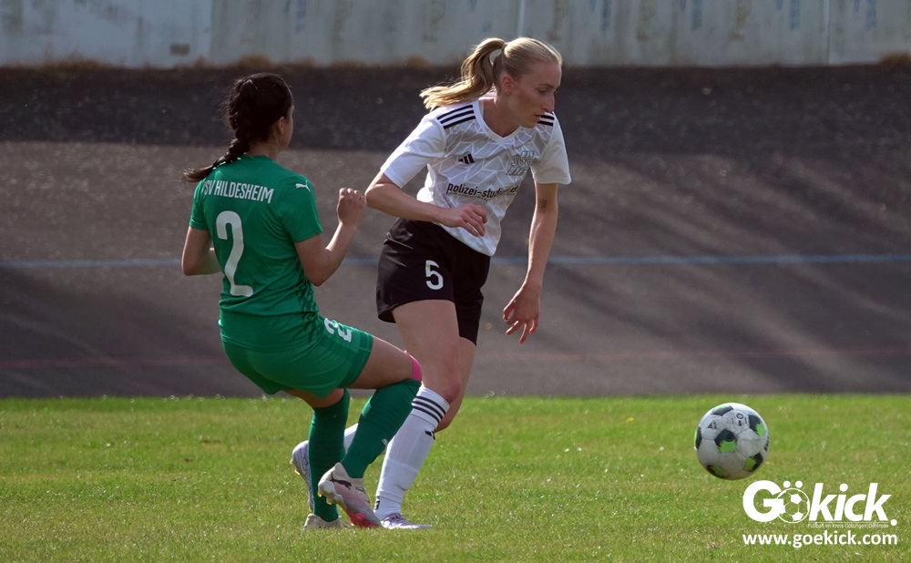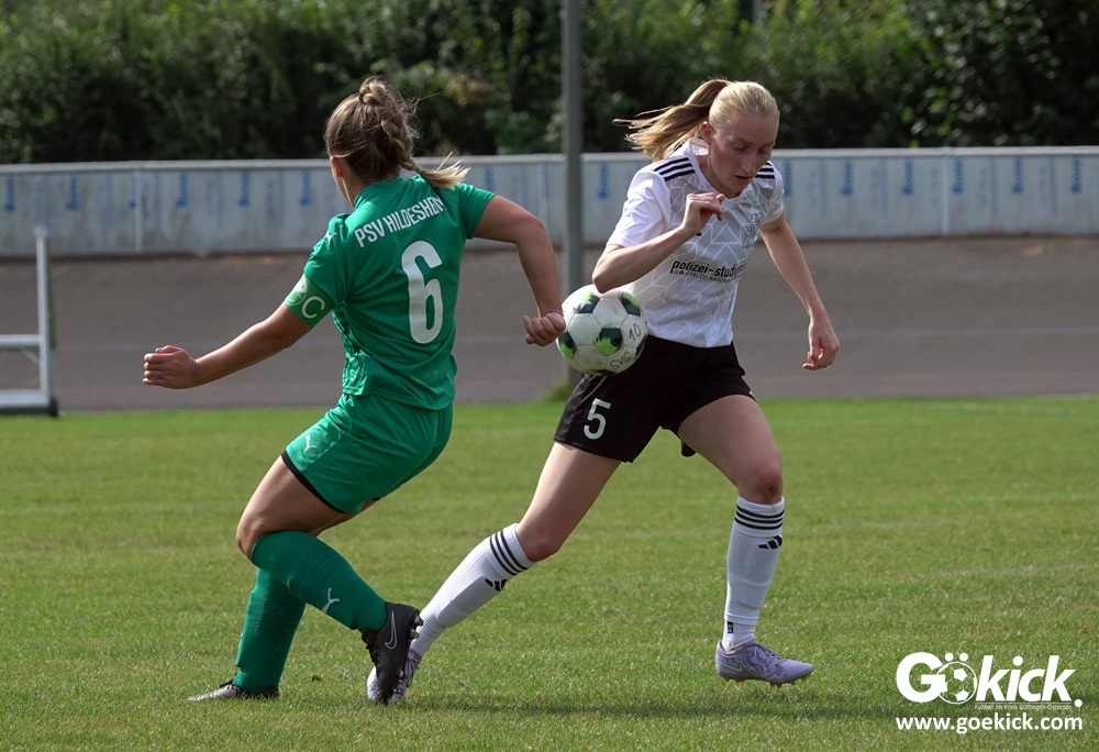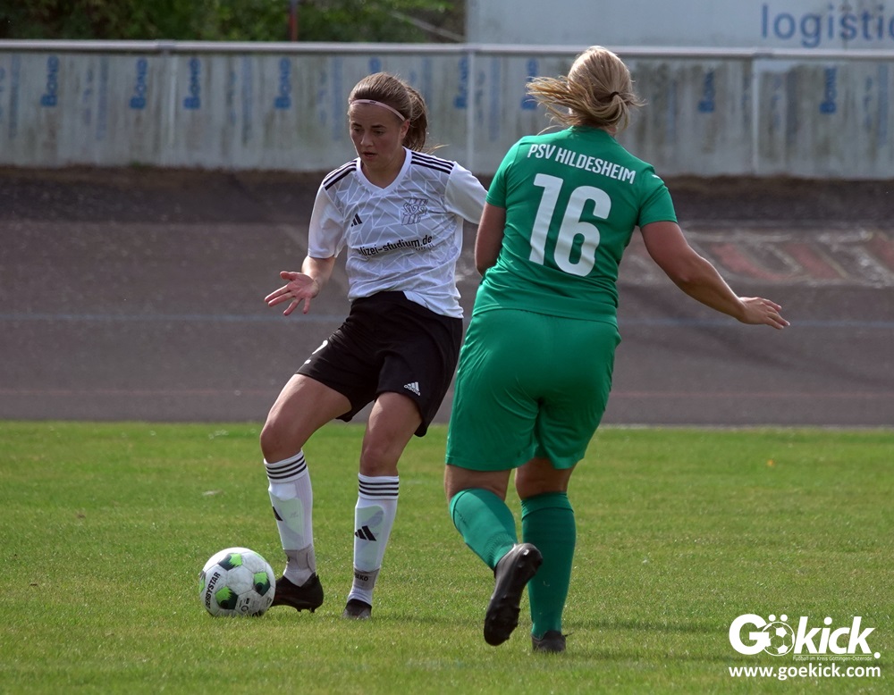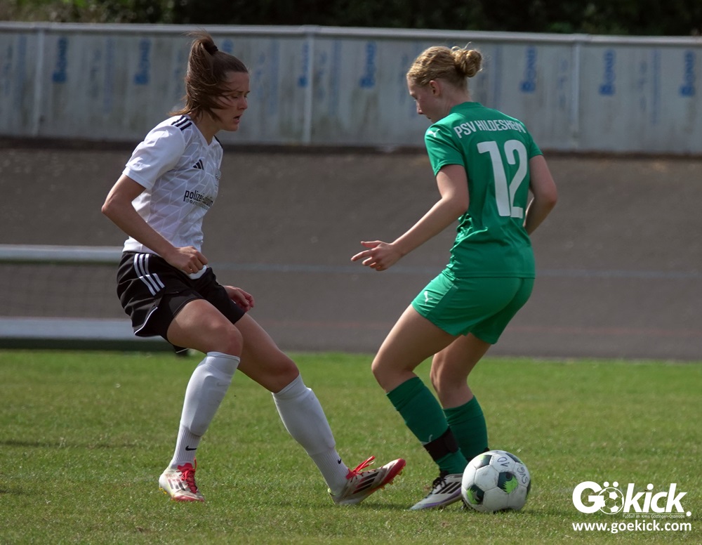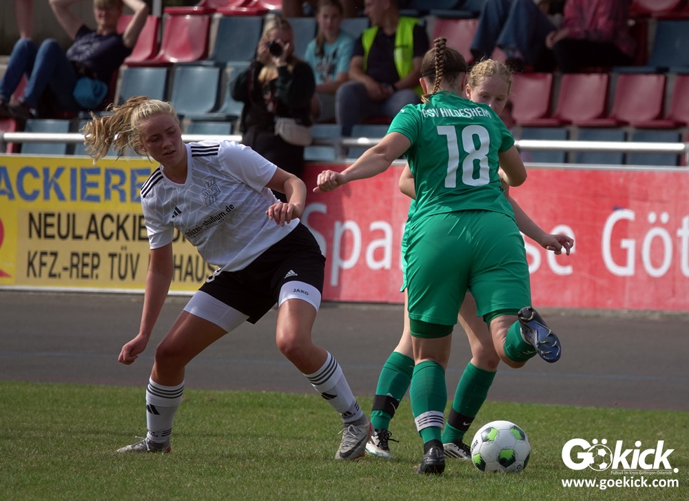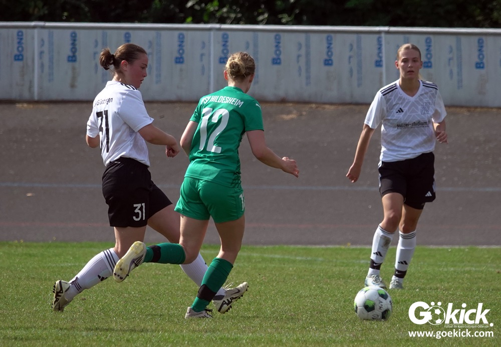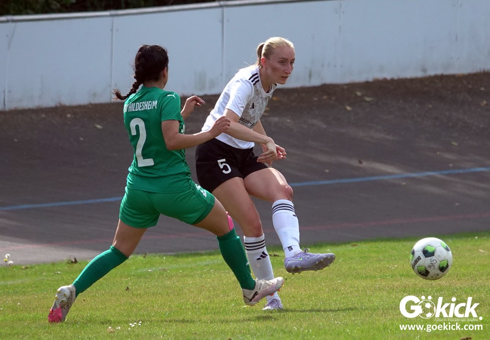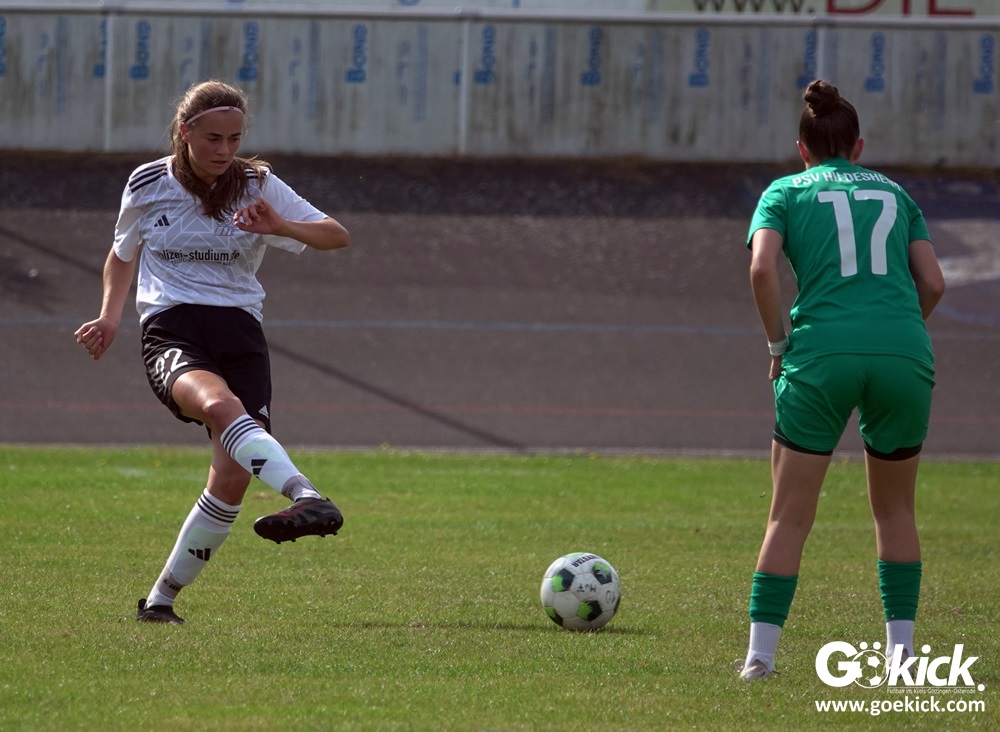 Die Gastgeberinnen bestimmten von Beginn an das Geschehen. Nellie Enabulele hatte in der 21. Minute die große Chance zur Führung, scheiterte aber frei vor Gästetorhüterin Jolien Auracher. Kurz vor der Pause prüfte Emma Hübner die Hildesheimerin mit einem Flachschuss, erneut blieb Auracher Siegerin. Trotz klarer Spielanteile blieb es beim 0:0.