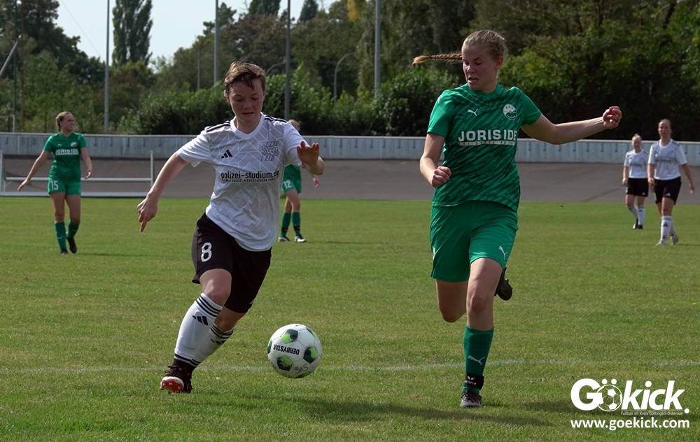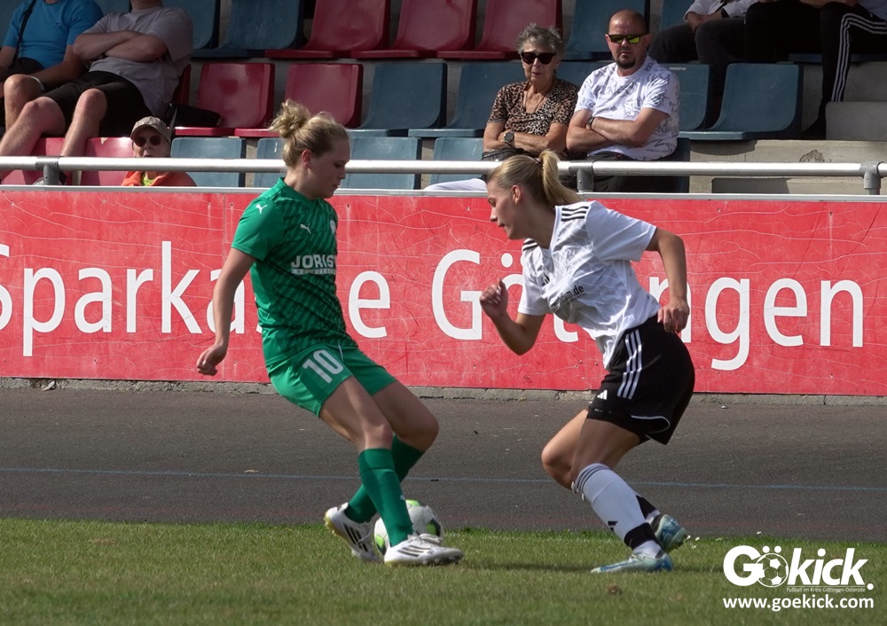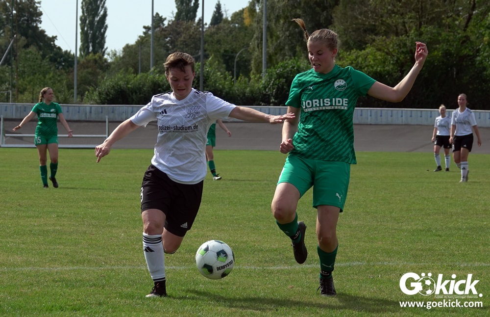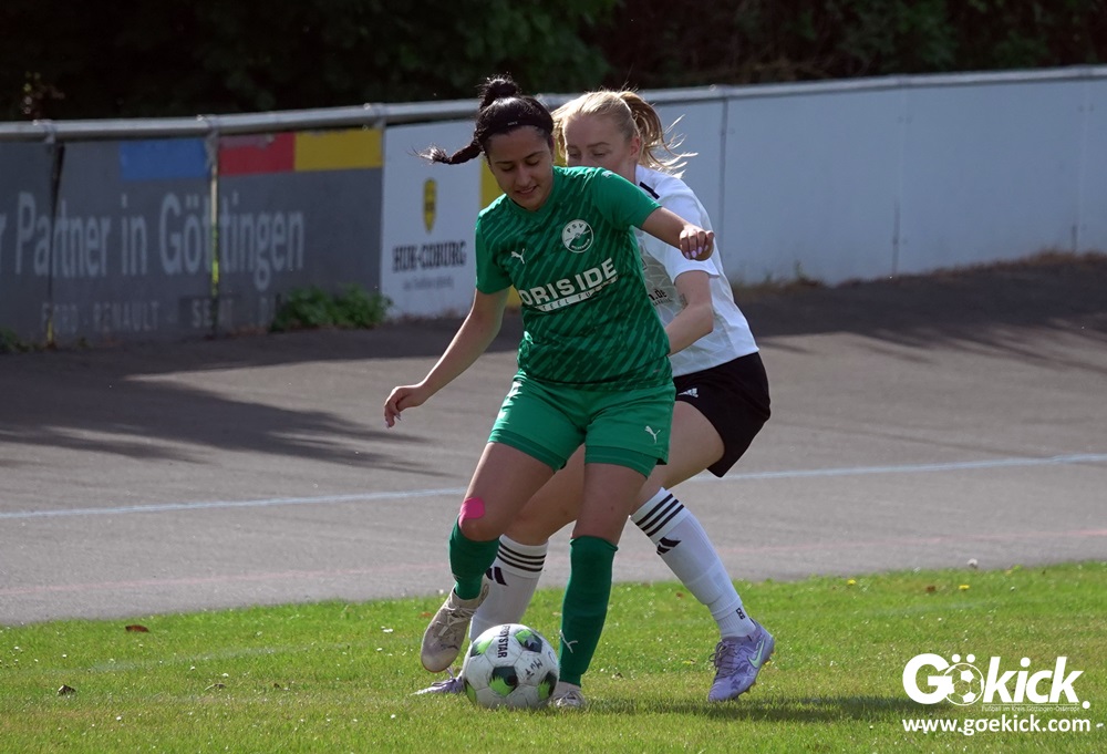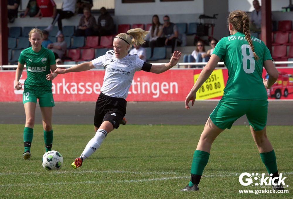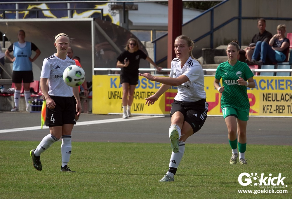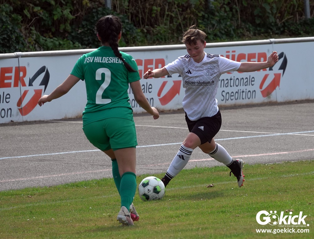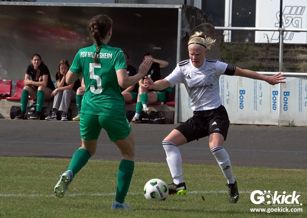 Die Gastgeberinnen bestimmten von Beginn an das Geschehen. Nellie Enabulele hatte in der 21. Minute die große Chance zur Führung, scheiterte aber frei vor Gästetorhüterin Jolien Auracher. Kurz vor der Pause prüfte Emma Hübner die Hildesheimerin mit einem Flachschuss, erneut blieb Auracher Siegerin. Trotz klarer Spielanteile blieb es beim 0:0.
