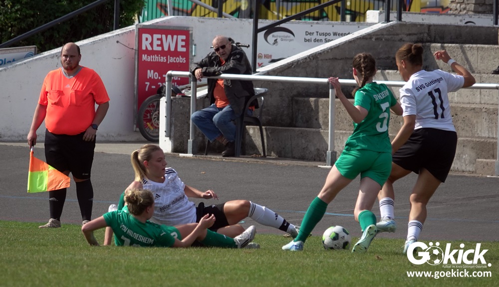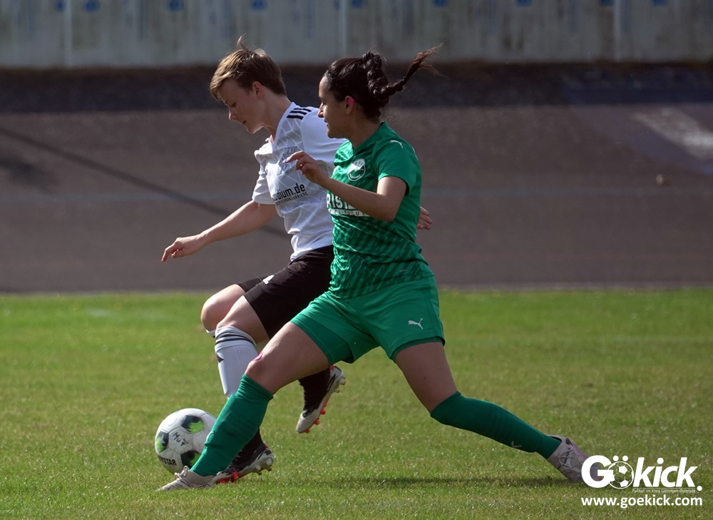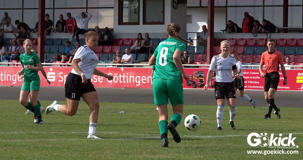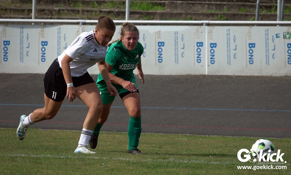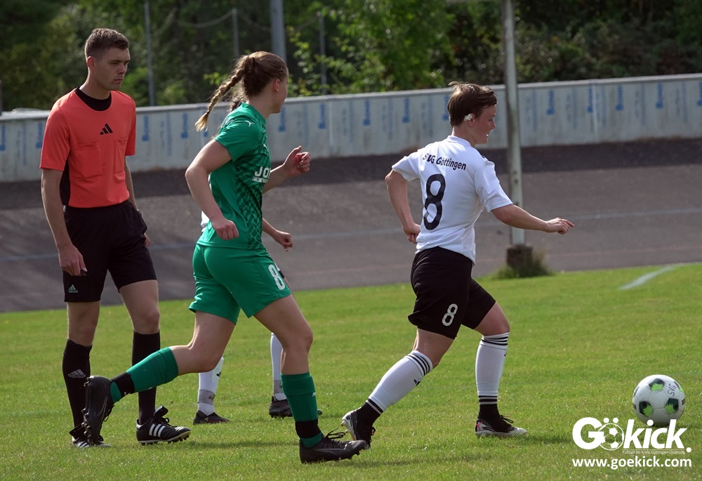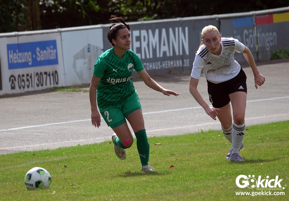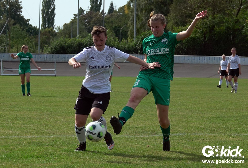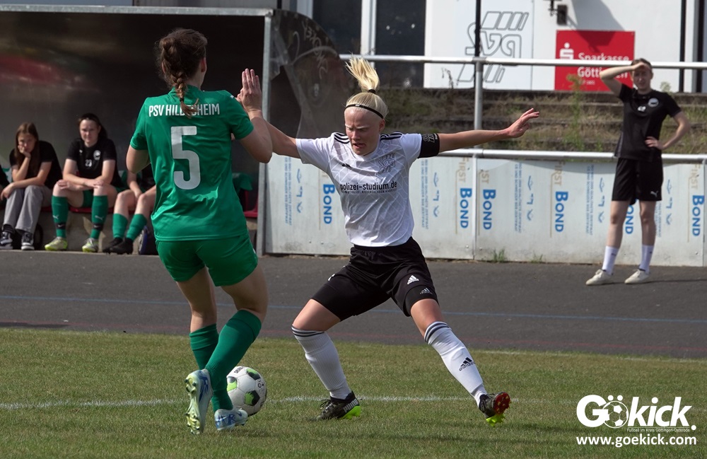 Die Gastgeberinnen bestimmten von Beginn an das Geschehen. Nellie Enabulele hatte in der 21. Minute die große Chance zur Führung, scheiterte aber frei vor Gästetorhüterin Jolien Auracher. Kurz vor der Pause prüfte Emma Hübner die Hildesheimerin mit einem Flachschuss, erneut blieb Auracher Siegerin. Trotz klarer Spielanteile blieb es beim 0:0.