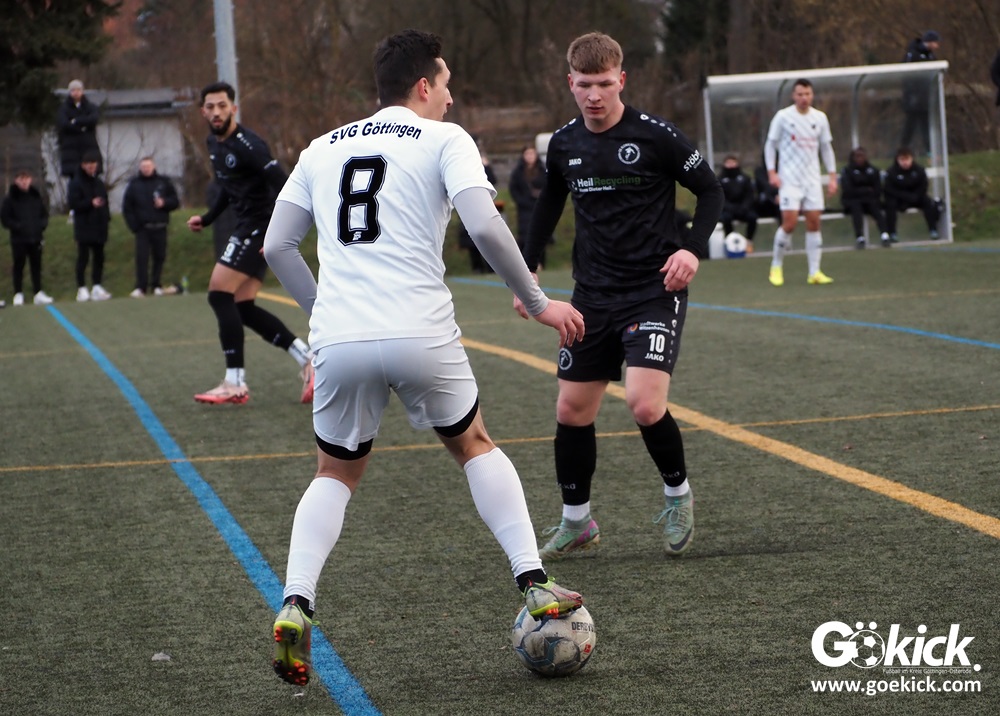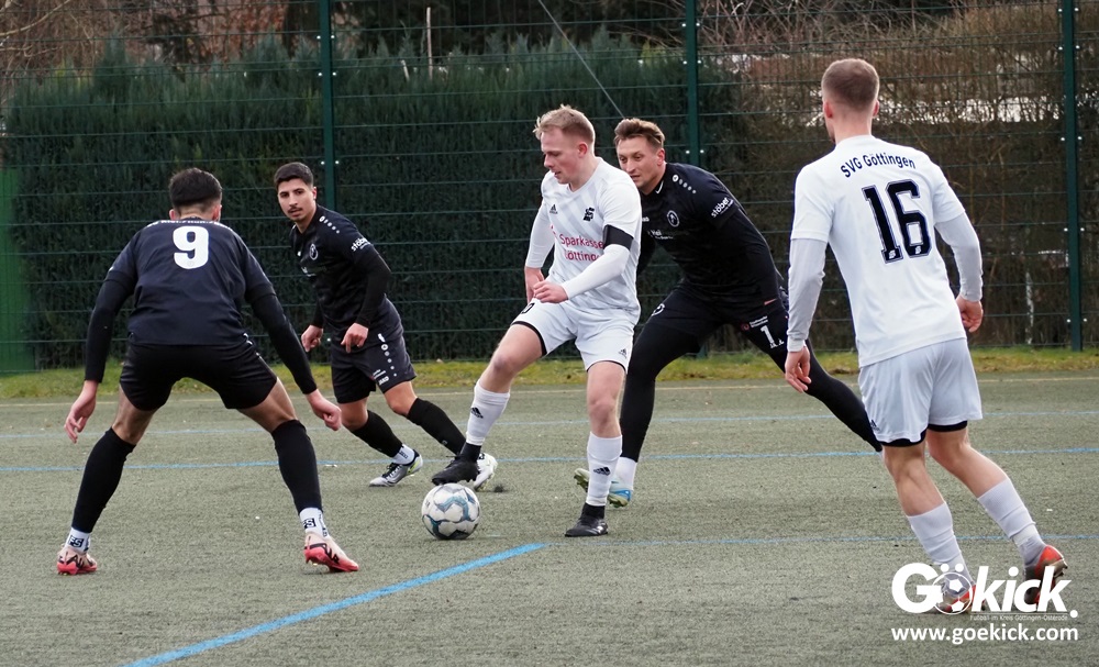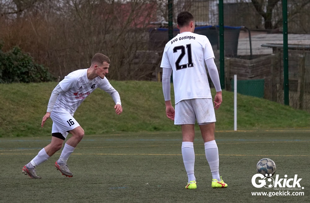 Nach einer Anfangsphase mit hohem Tempo konnte sich der Gast aus der Nähe von Witzenhausen immer wieder aus der Umklammerung der SVG lösen und die ersten Chancen der Partie kreieren. Doch der junge SVG-Schlussmann Jascha Semmelroggen, Stammtorhüter der U19 des JFV 37 Göttingen, hielt seinen Kasten sauber. Auf der anderen Seite bediente Nicolas Krenzek aus dem rechten Halbfeld mit einer maßgenauen Flanke Steen Zimmermann, der aus zwölf Metern den Ball in den Winkel des Gäste-Tores köpfte. Das gab dem Göttinger Team Auftrieb. Fortan war die SVG das spielbestimmende Team. Mit einem wunderbaren, direkten Freistoß – erneut unhaltbar in den Winnkel – erzielte Jannis Kniepen in der 38. Spielminute das 2:0 für den Gastgeber. Damit ging es in die Halbzeitpause.