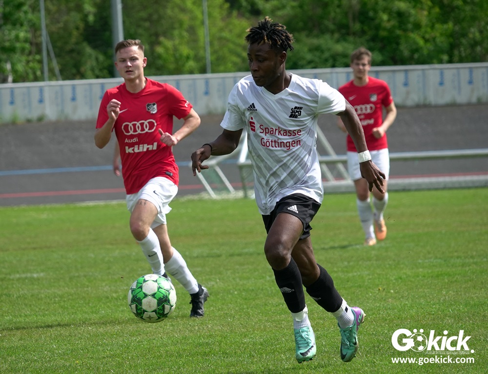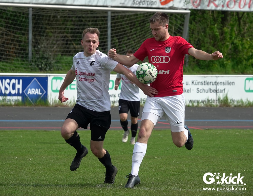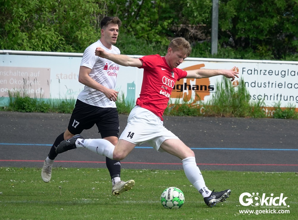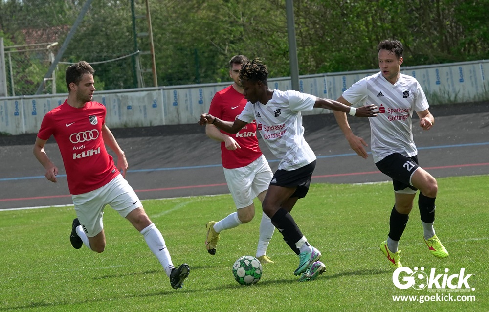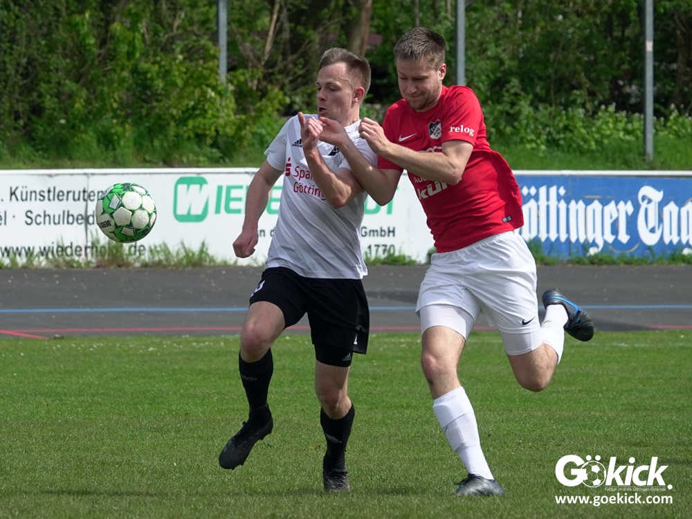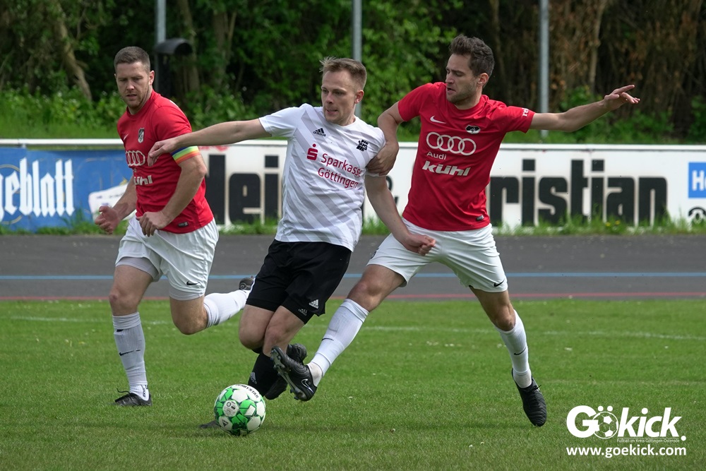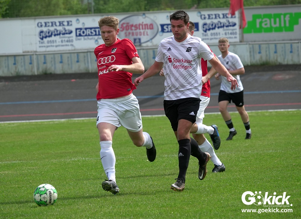 Die Göttinger setzten den Gegner mit geschickt hinter die hoch stehende Abwehr gespielten Pässen immer wieder unter Druck. Ein solcher Angriff führte nach 16 Minuten zum 1:0 durch Nicolas Krenzek, der sich durchsetzungsstark in Szene setzte und dem Gäste-Schlussmann keine Chance ließ. Auch das 2:0 durch Steen Zimmermann in der Nachspielzeit der ersten Halbzeit war nach diesem Muster gestrickt. Mit der verdienten Führung gegen tapfer kämpfende, doch limitierte Gäste ging es zum Pausentee.