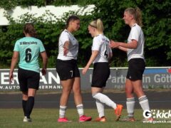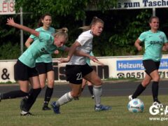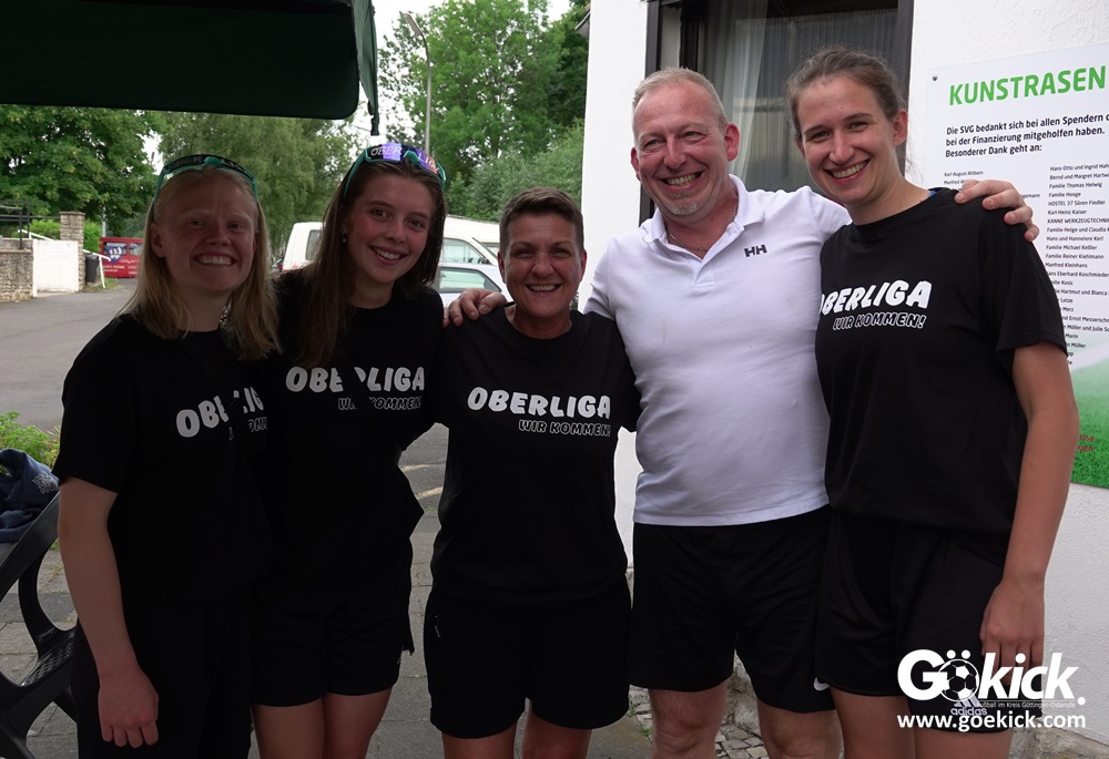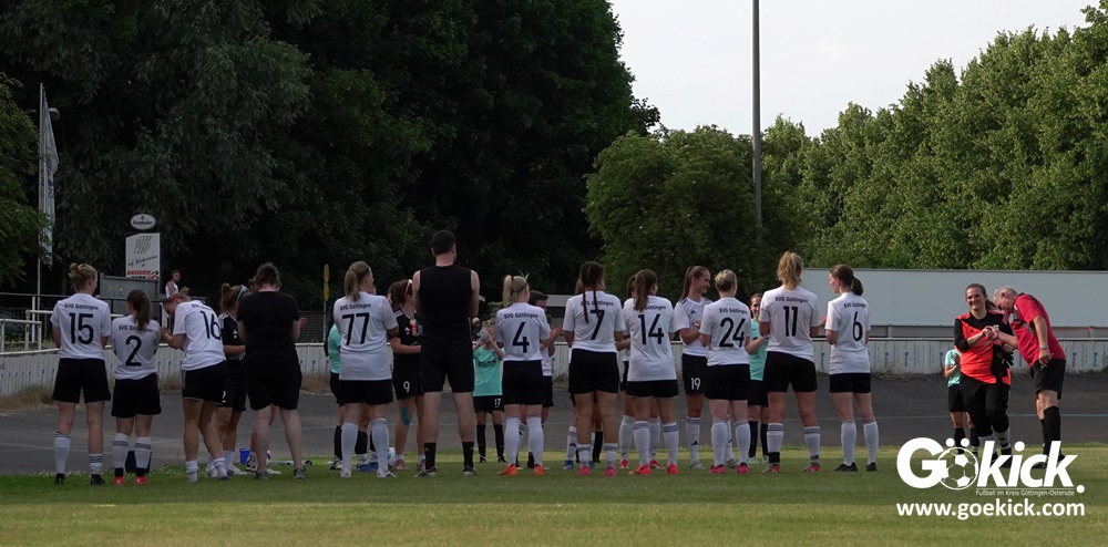 Nach dem 6:2-Sieg im Spitzenspiel beim Verfolger Eintracht Northeim stand für das Frauen-Team der SVG Göttingen die Landesliga-Meisterschaft und der Aufstieg in die Oberliga fest. Im abschließenden, bedeutungslosen Saisonspiel am vergangenen Sonntag kam der Tabellenzehnte SG Hillerse-Leiferde in den Göttinger KRÜGERPARK am Sandweg. Auch diesmal gab sich der Meister von Trainer Robin Gröling keine Blöße. Er siegte glanzlos bei sommerlichen Temperaturen mit 2:0 (1:0). Es war der insgesamt 19. Sieg im 22. Punktspiel der Saison. Anschließend feierten die schwarz-weißen Erfolgsfrauen die grandiose Saison mit dem traditionellen Bad in der Leine.