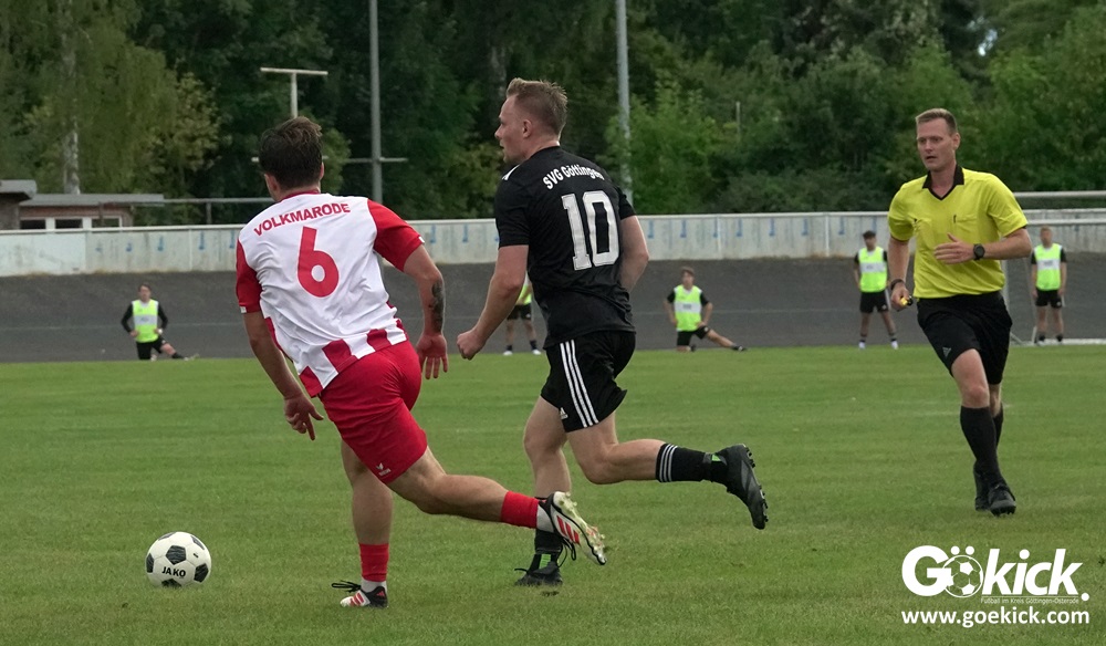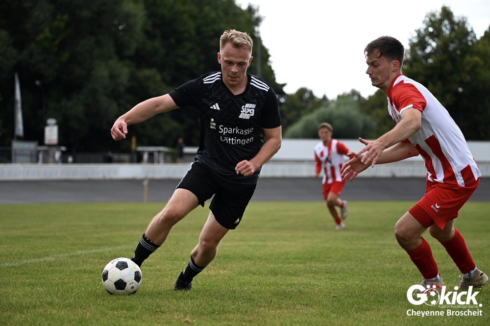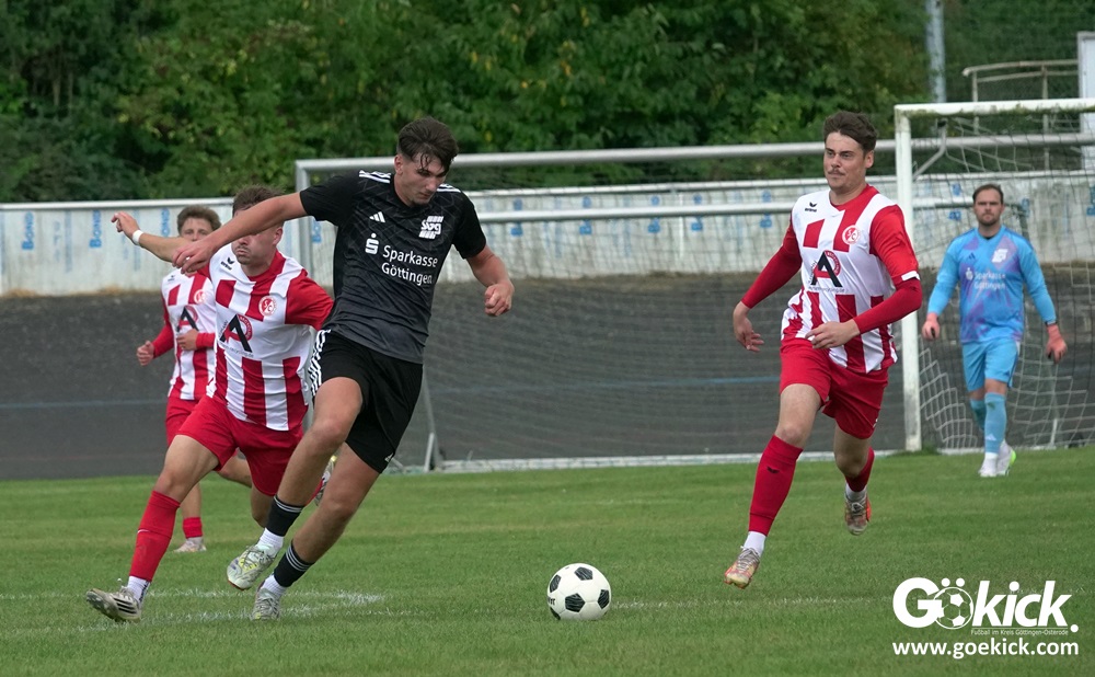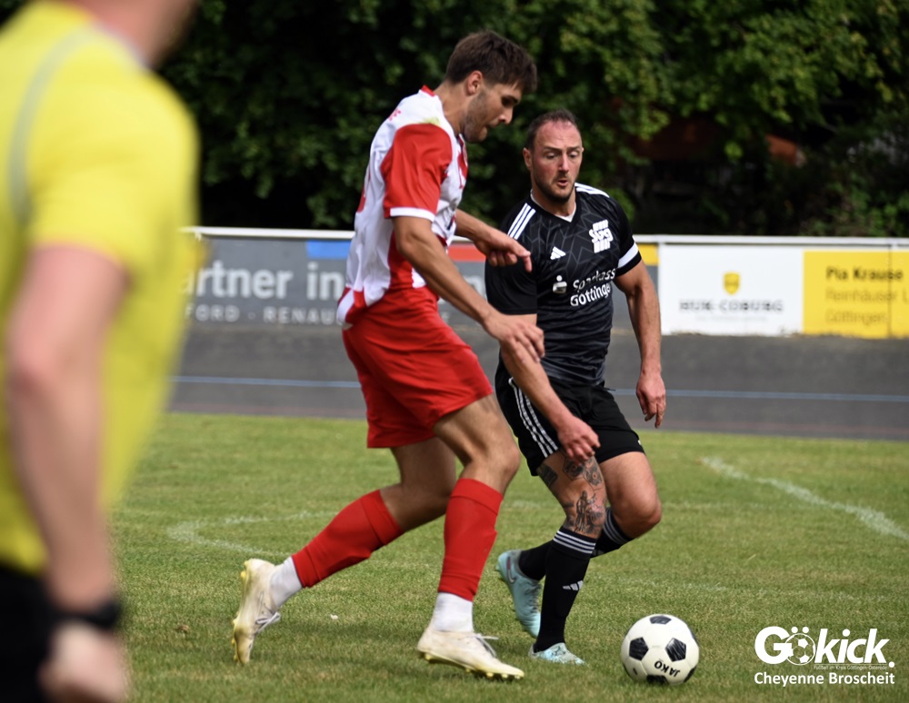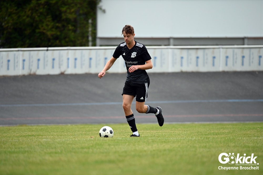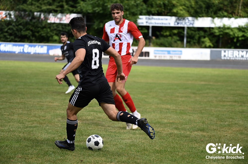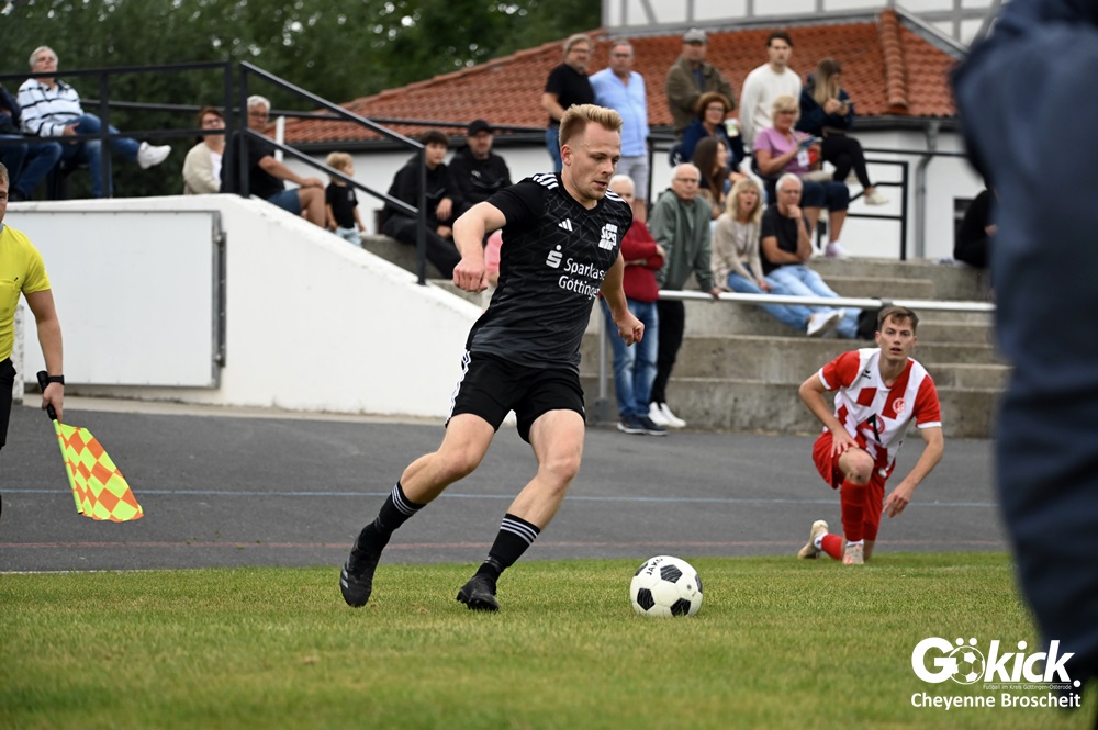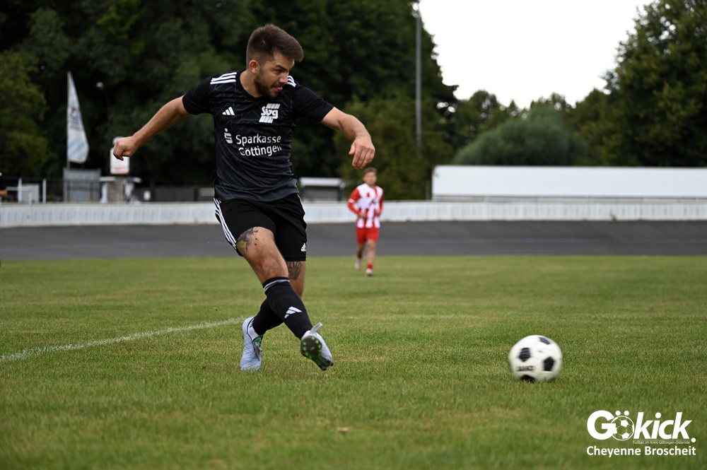 Vor 180 Zuschauern entwickelte sich von Beginn an ein einseitiges Spiel. Die SVG ließ den Ball laufen, hielt die Gäste in Schach und drängte früh auf die Führung. In der 34. Minute belohnte Yannis Fischer die drückende Überlegenheit: Nach einer Hereingabe fasste er sich ein Herz und vollendete per Volley sehenswert zum verdienten 1:0.