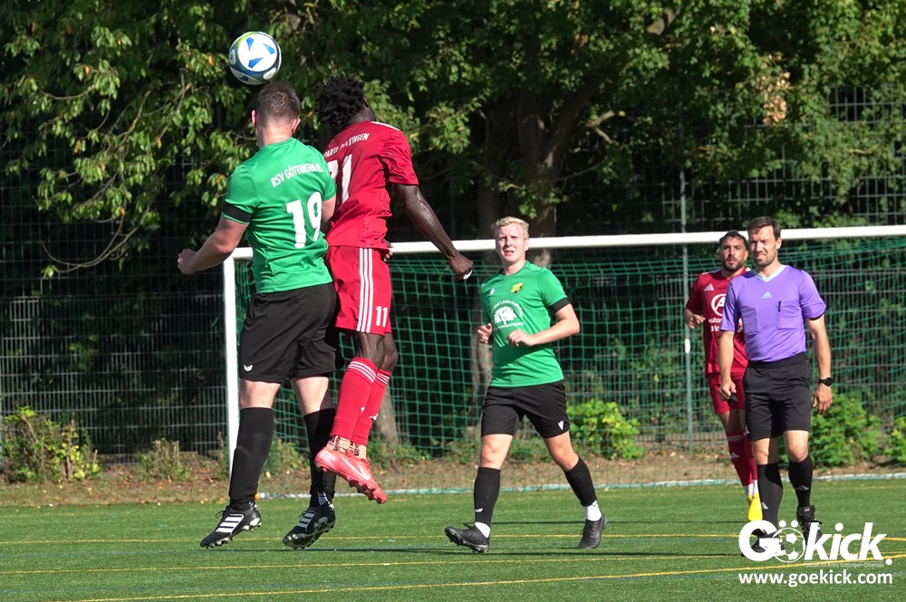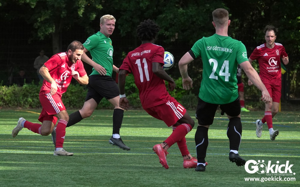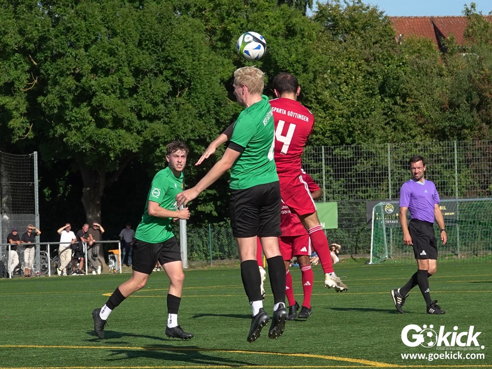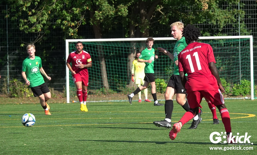 Von Beginn an diktierte Sparta das Geschehen und kam zu zahlreichen Chancen. Sechs hochkarätige Gelegenheiten ließen die Gäste jedoch ungenutzt. In der 32. Minute hatte Geismar Glück, als Torben-Frederik Lemmer für den bereits geschlagenen Torwart Darius Rohleder auf der Linie rettete. Kurz vor der Pause war es dann aber soweit: Abdelhafiz Dalil verwandelte einen direkten Freistoß sehenswert zur verdienten 1:0-Führung (45.).