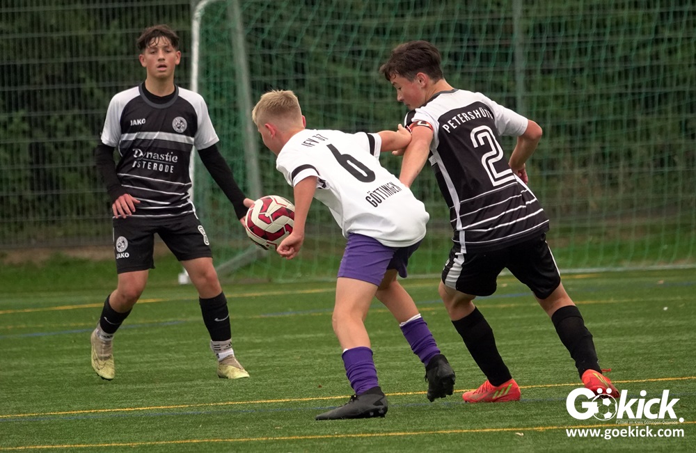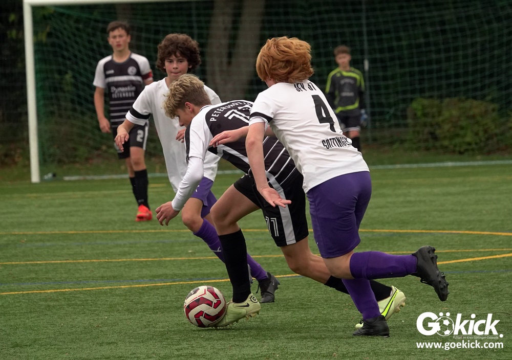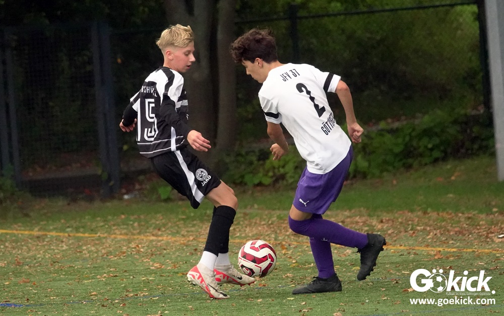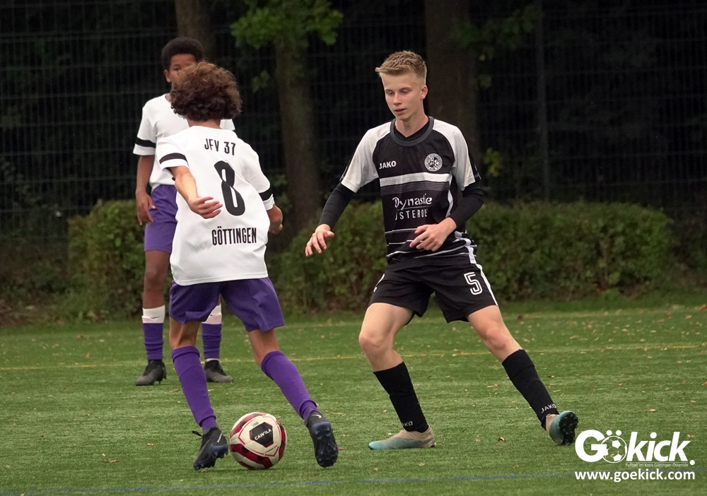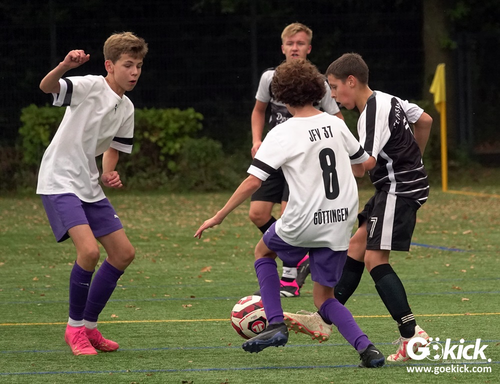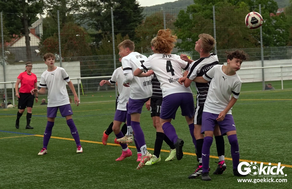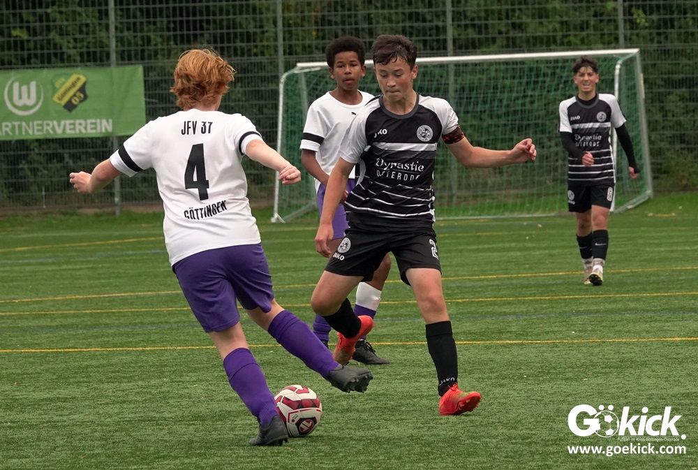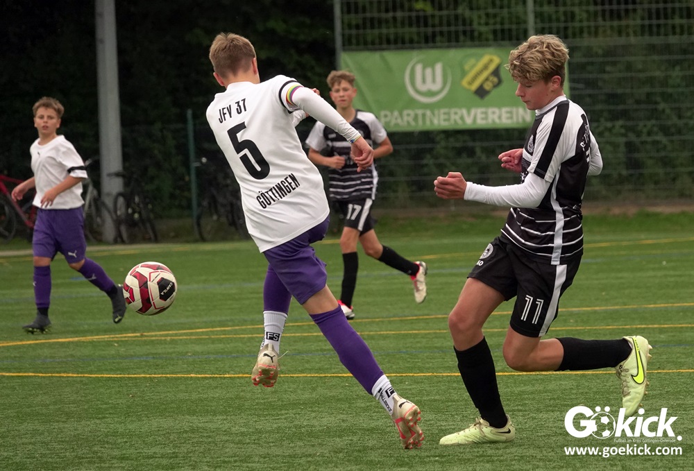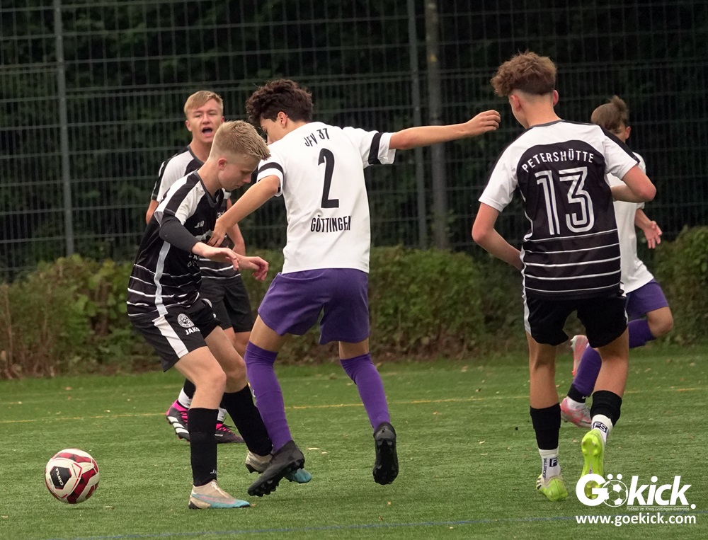 In der C-Jugend-Bezirksliga empfing am vergangenen Samstag die zweite Mannschaft (U14) des JFV 37 Göttingen im Kreis-Derby auf dem Kunstrasenplatz in Göttingen-Geismar den TuSpo Petershütte. Obwohl sich die Harzer Gäste tapfer wehrten, siegte das Heimteam am Ende verdient mit 3:1 (1:0). Mit diesem Sieg bleibt das Göttinger Team von Trainer Robin Blumenstein die einzige ungeschlagene Mannschaft der Spielklasse. Der JFV liegt mit 13 Punkten aus fünf Spielen auf Rang zwei hinter dem Spitzenreiter JSG Goslar. Der TuSpo Petershütte bleibt mit sechs Niederlagen punktloses Schlusslicht der Bezirksliga.