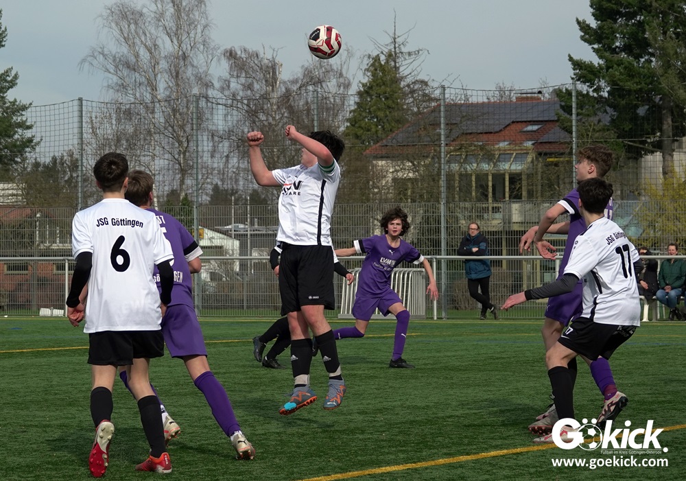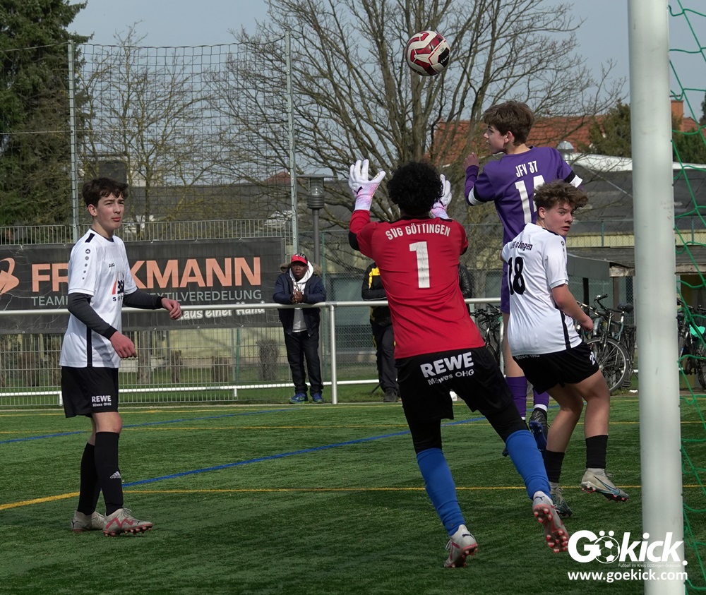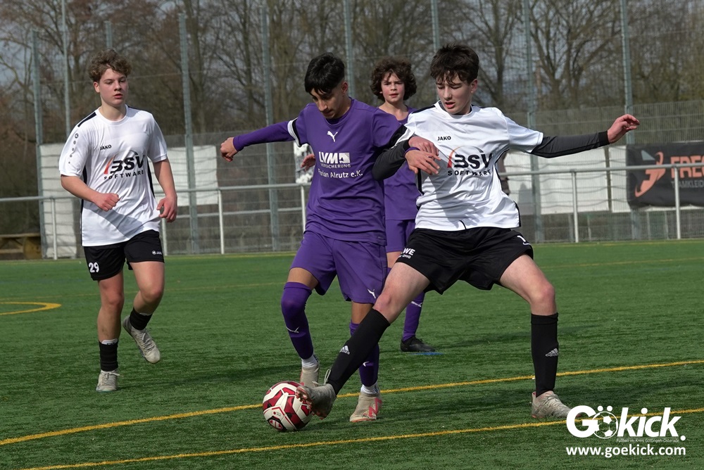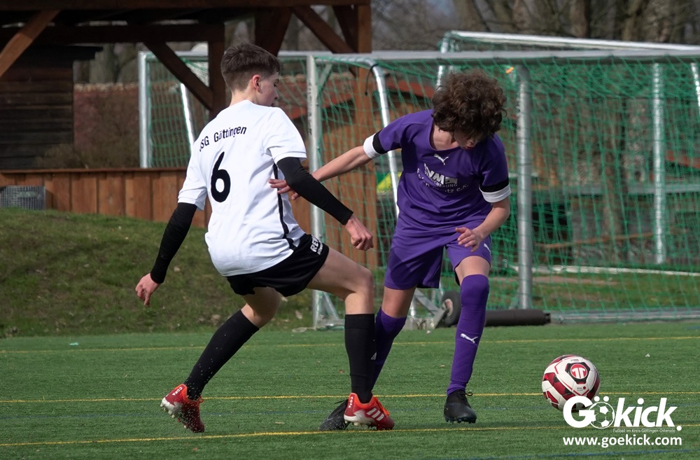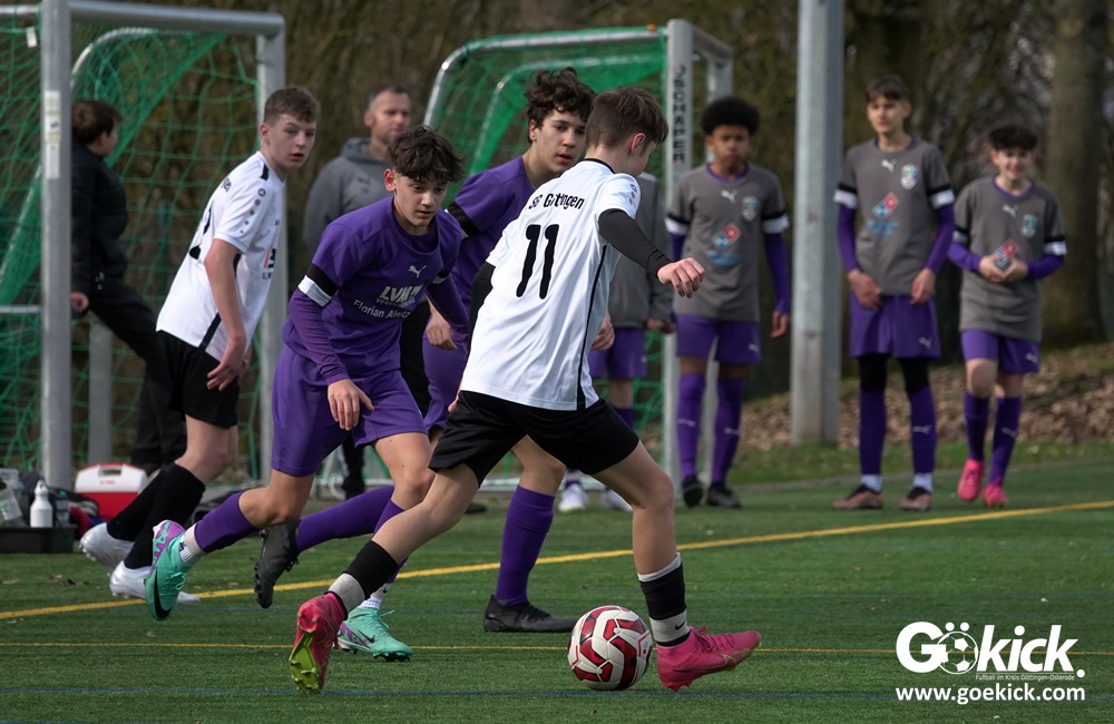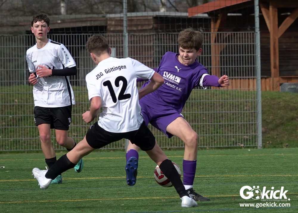 Der C-Jugend-Bezirksligist JFV 37 Göttingen U14 hat in Vorbereitung auf die im April beginnende Rückrunde einen weiteren Test absolviert. Das Team vom Trainerduo Robin Blumenstein und Lüder Sudmann hatte dazu die in der Kreisliga spielende C-Jugend des JFV-Stammvereins SVG Göttingen geladen. Auf dem Kunstrasenplatz im Göttinger Stadtteil Geismar gewann der JFV zwar erwartungsgemäß mit 3:2 (1:1), hatte dabei aber mehr Mühe als prognostiziert.