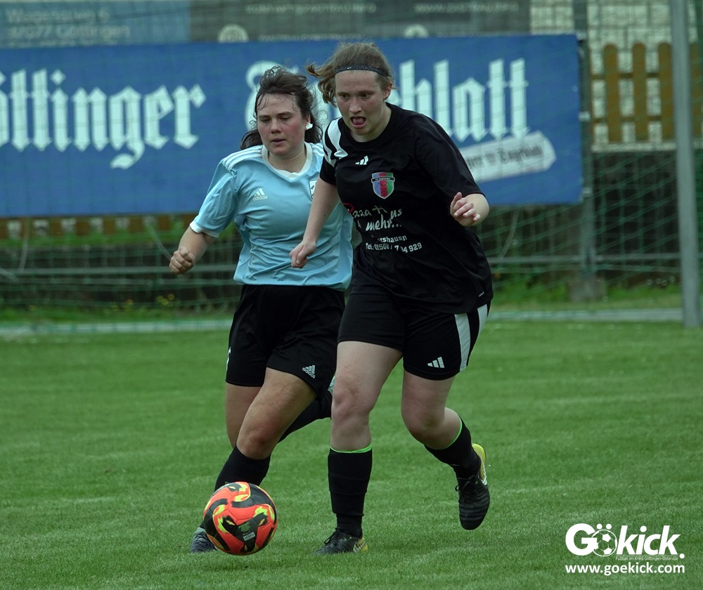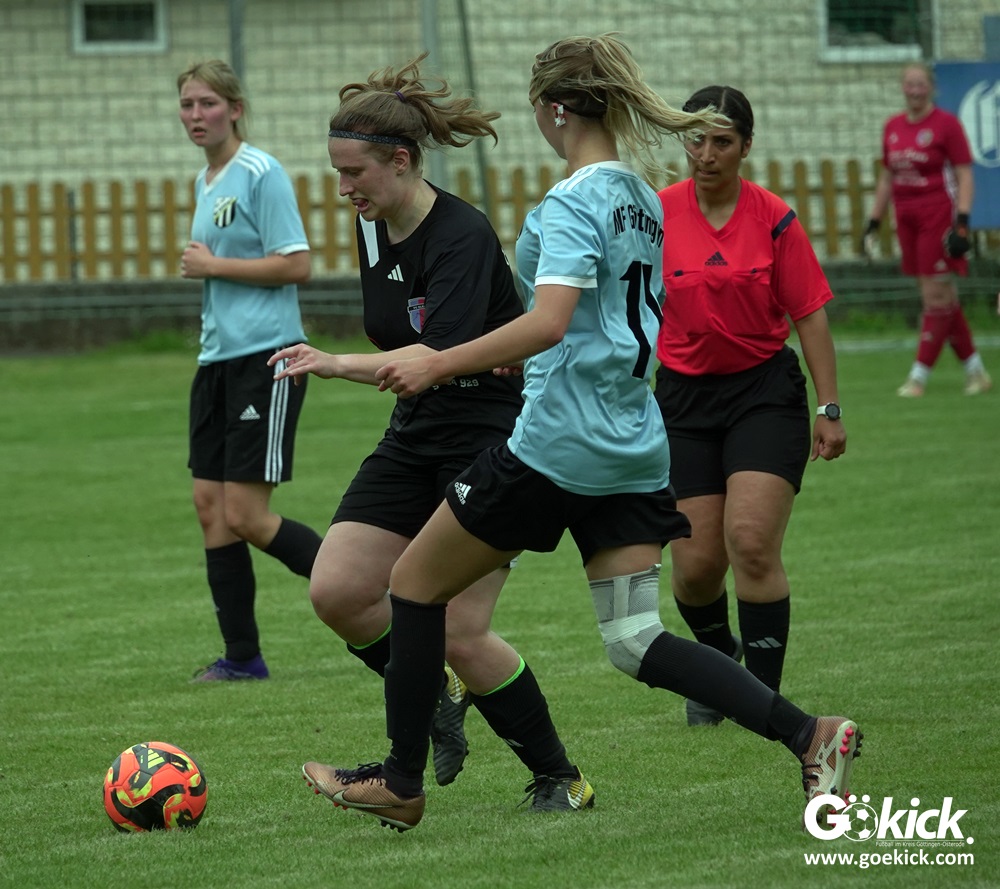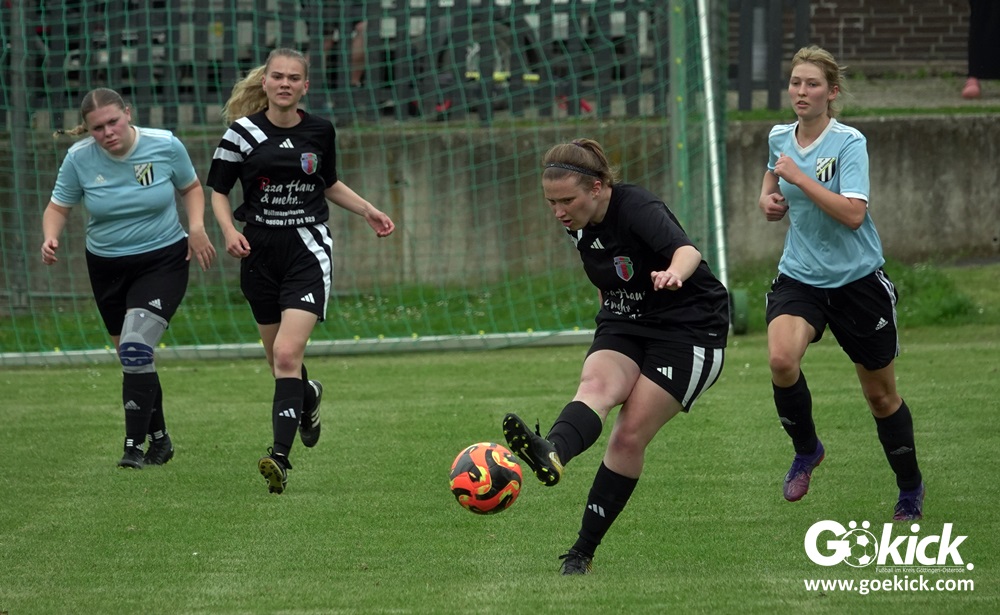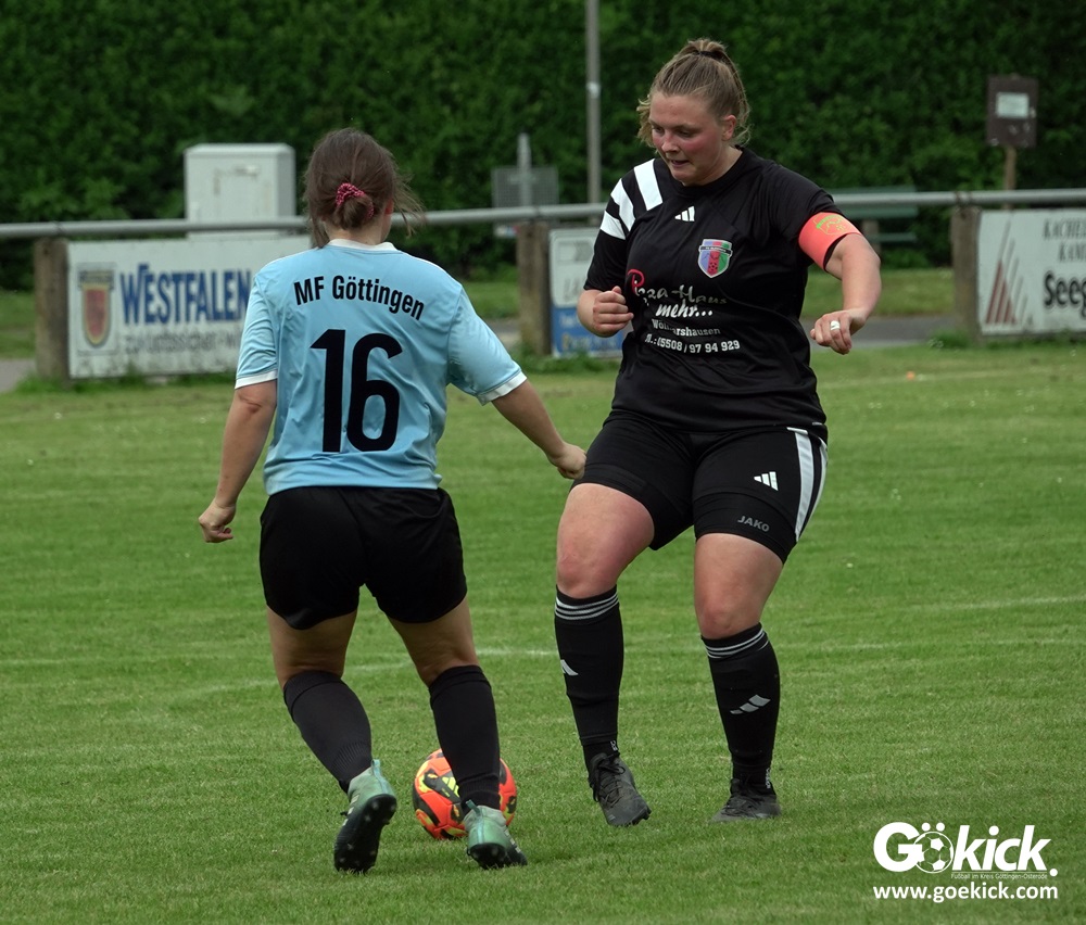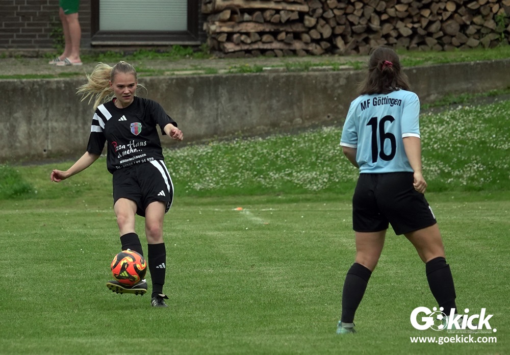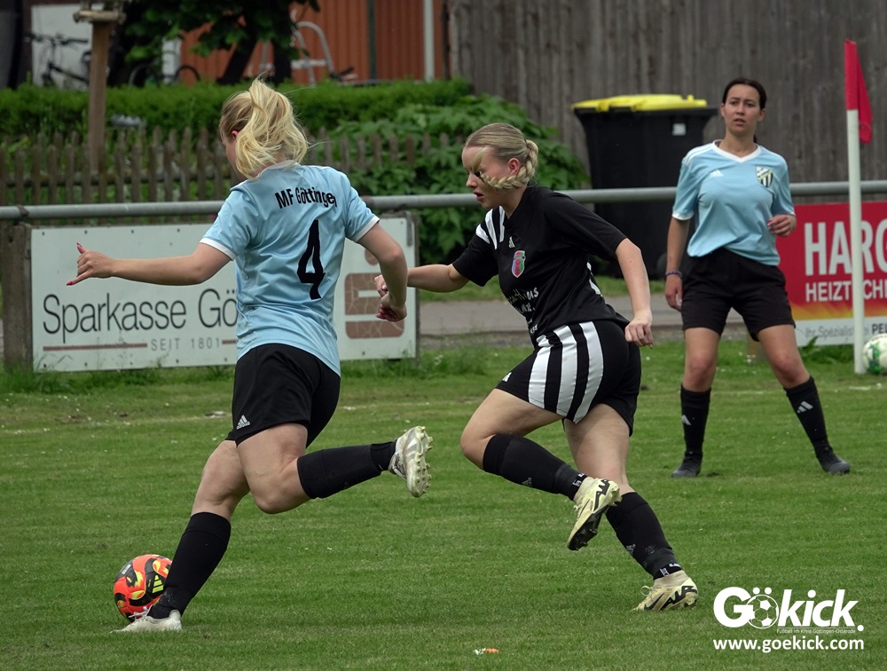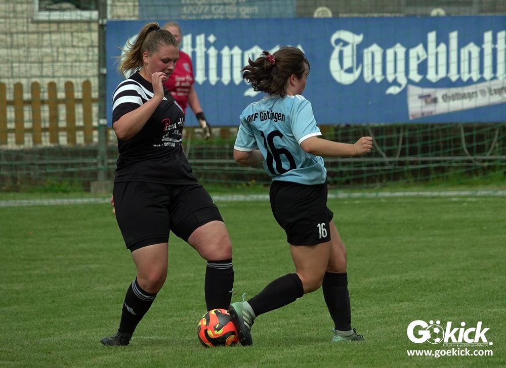 Die Gastgeberinnen waren von Anbeginn das bessere Team. Immer wieder stand Janine Abt im Tor der Gäste im Mittelpunkt. Doch es dauerte immerhin bis zur 20. Spielminute, ehe sich Josephin Oetzel gekonnt in Szene setzte und mit strammen Schuss das 1:0 für die Heimelf erzielte. Zehn Minuten später trat Jule Friedrichs zu einem Freistoß an. Der Ball landete an der Querlatte des Tores, von dort sprang er vor die Füße von Samira Wasmus, die zum 2:0 vollendete. Der Jubel der jungen Frau ließ vermuten, dass ein solches Ereignis für sie Seltenheitswert besitzt – und tatsächlich: es war ihr erster Saisontreffer! Glückwunsch! Bei der Aktion verletzte sich allerdings die MF-Torfrau und musste ausgewechselt werden. Später kam sie aber noch als Spielerin zum Einsatz. Eine Minute vor dem Ende der regulären Spielzeit der überraschende Anschlusstreffer für die Göttinger Gäste. Leandra Emelia Bernsdorff traf in der 44. Spielminute zum 1:2 aus Sicht des MF III. Damit ging es in die Halbzeitpause.