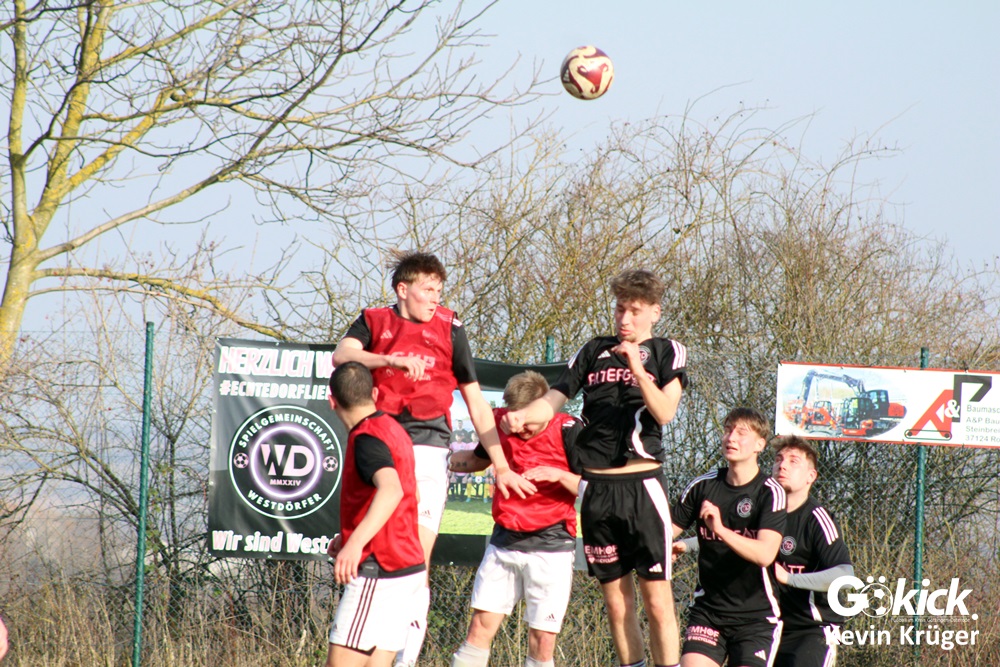 Die Gäste aus Hoher Hagen präsentierten sich dabei über weite Strecken als die etwas reifere Mannschaft. Immer wieder sorgten sie mit langen, präzisen Bällen in die Spitze für Gefahr und setzten die Defensive der Westdörfer unter Druck. Mehrfach musste die Abwehr klären oder der Torhüter eingreifen, um einen Rückstand zu verhindern.