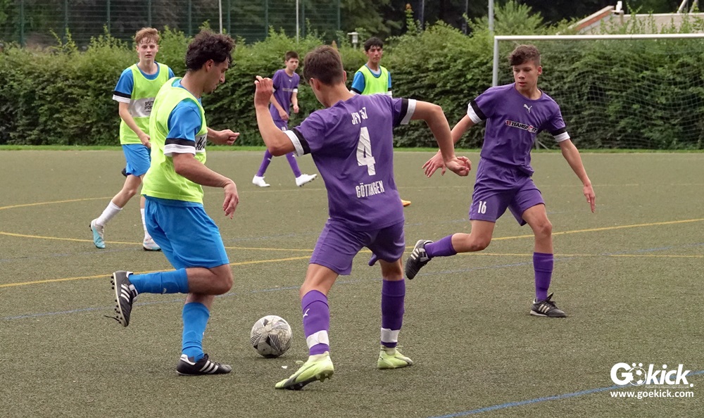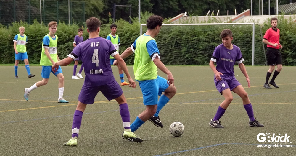 Die zweite B-Jugend-Mannschaft des JFV 37 Göttingen spielt in der Bezirksliga ihrer Altersklasse. In Vorbereitung auf die neue Spielzeit, die am 26. August mit dem Bezirkspokalspiel beim Ligakonkurrenten JSG Aue/Leine/Harzhorn startet, absolvierte das Team vom Trainerduo Rayk Lebe und Michael Andres in der Vorwoche einen ersten Test gegen die A-Jugend des JFV-Stammvereins SC Hainberg aus der Kreisliga. Die körperlich überlegenen A-Jugendlichen von den Zietenterrassen siegten am Ende dieses Tests mit 7:3 (3:1).